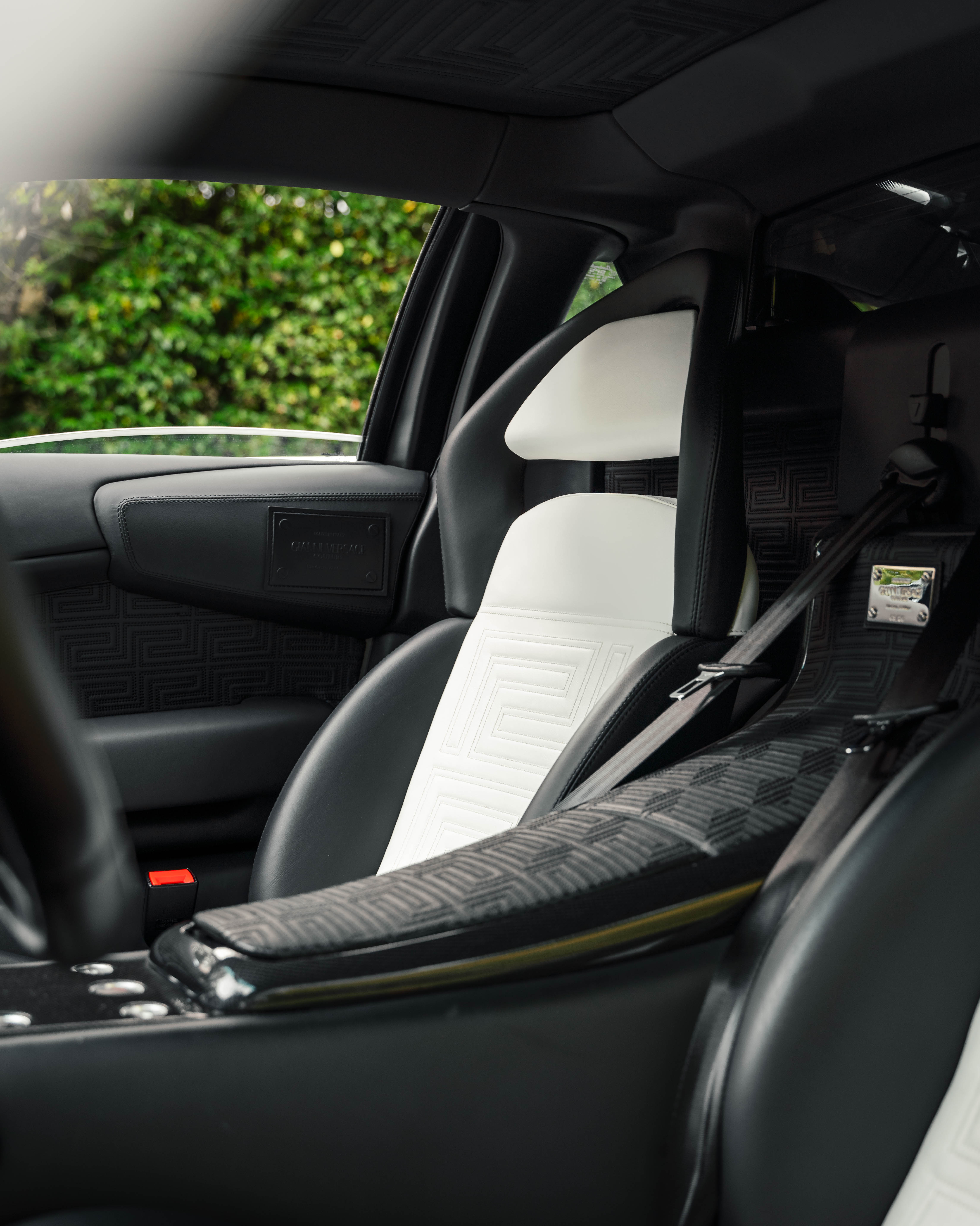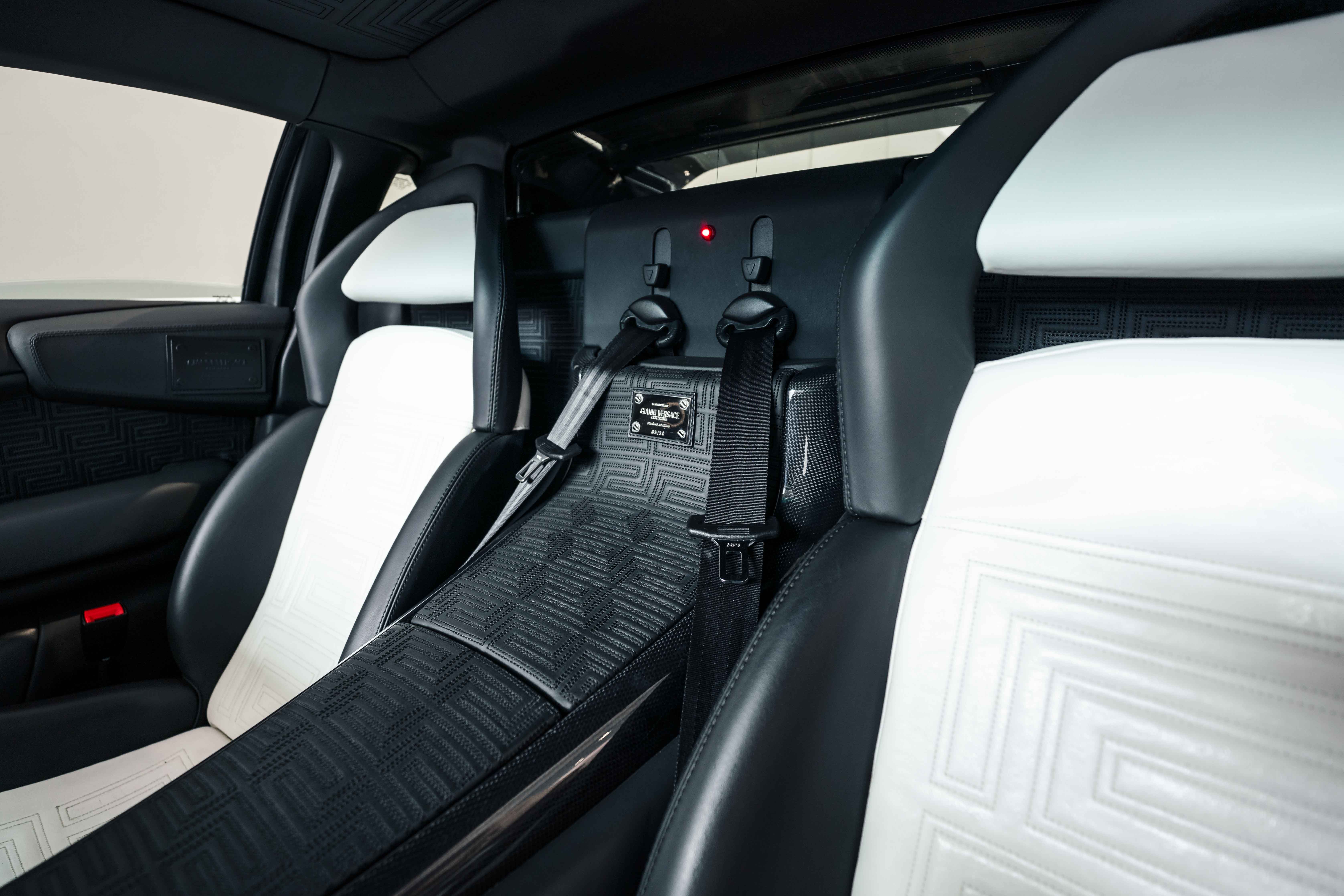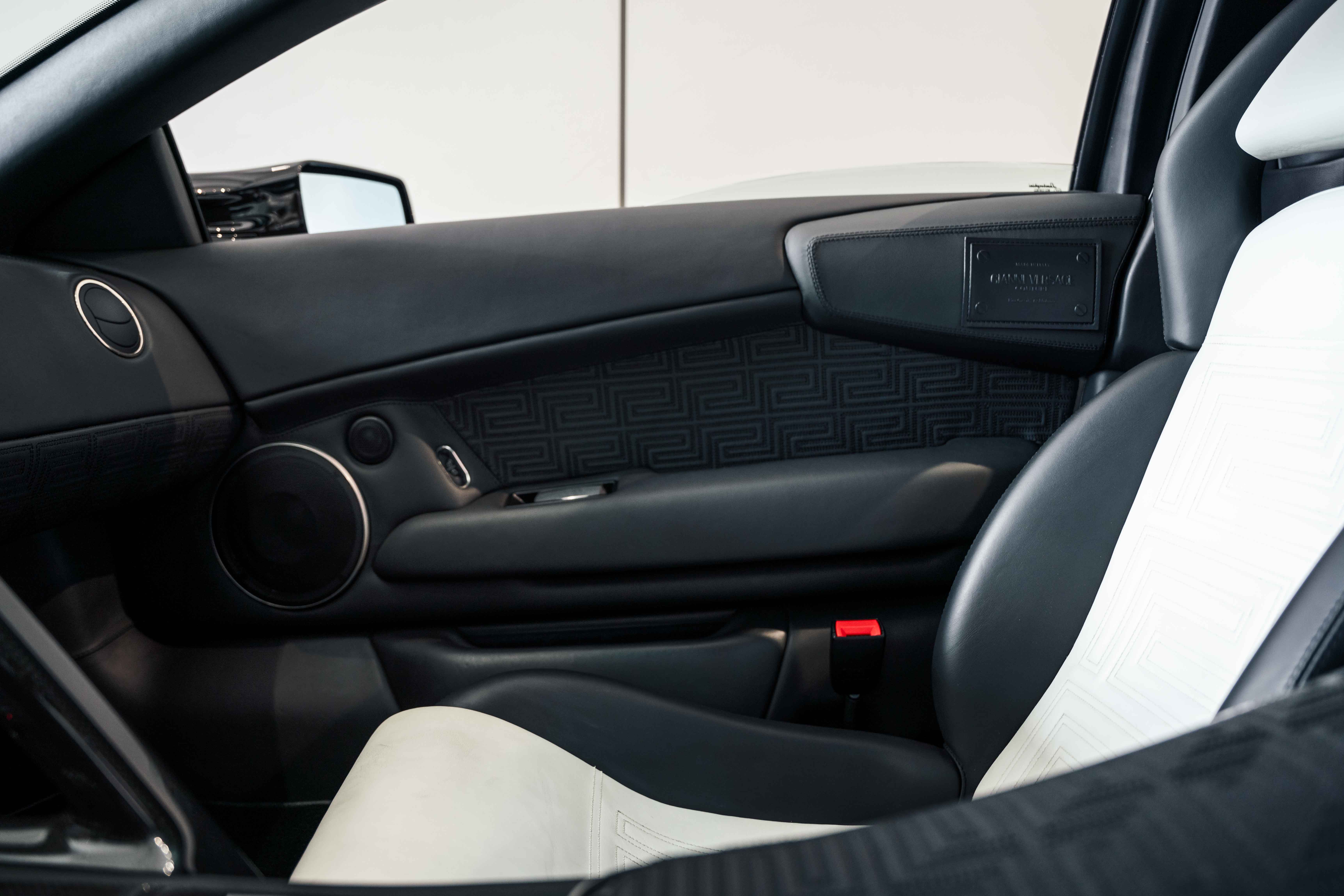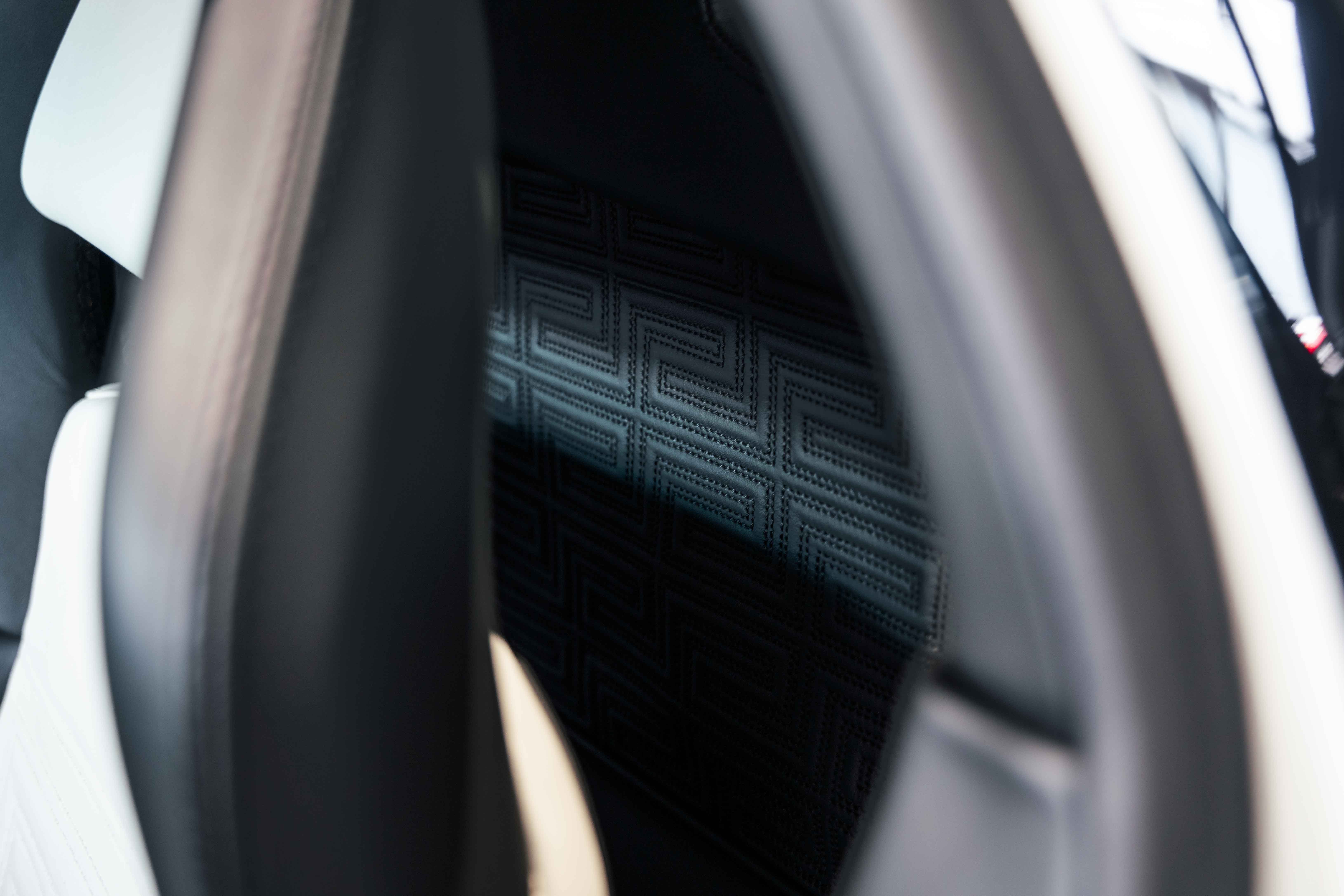 Custom leather seats with embroidered Versace "Meander" (Greek Key) pattern
