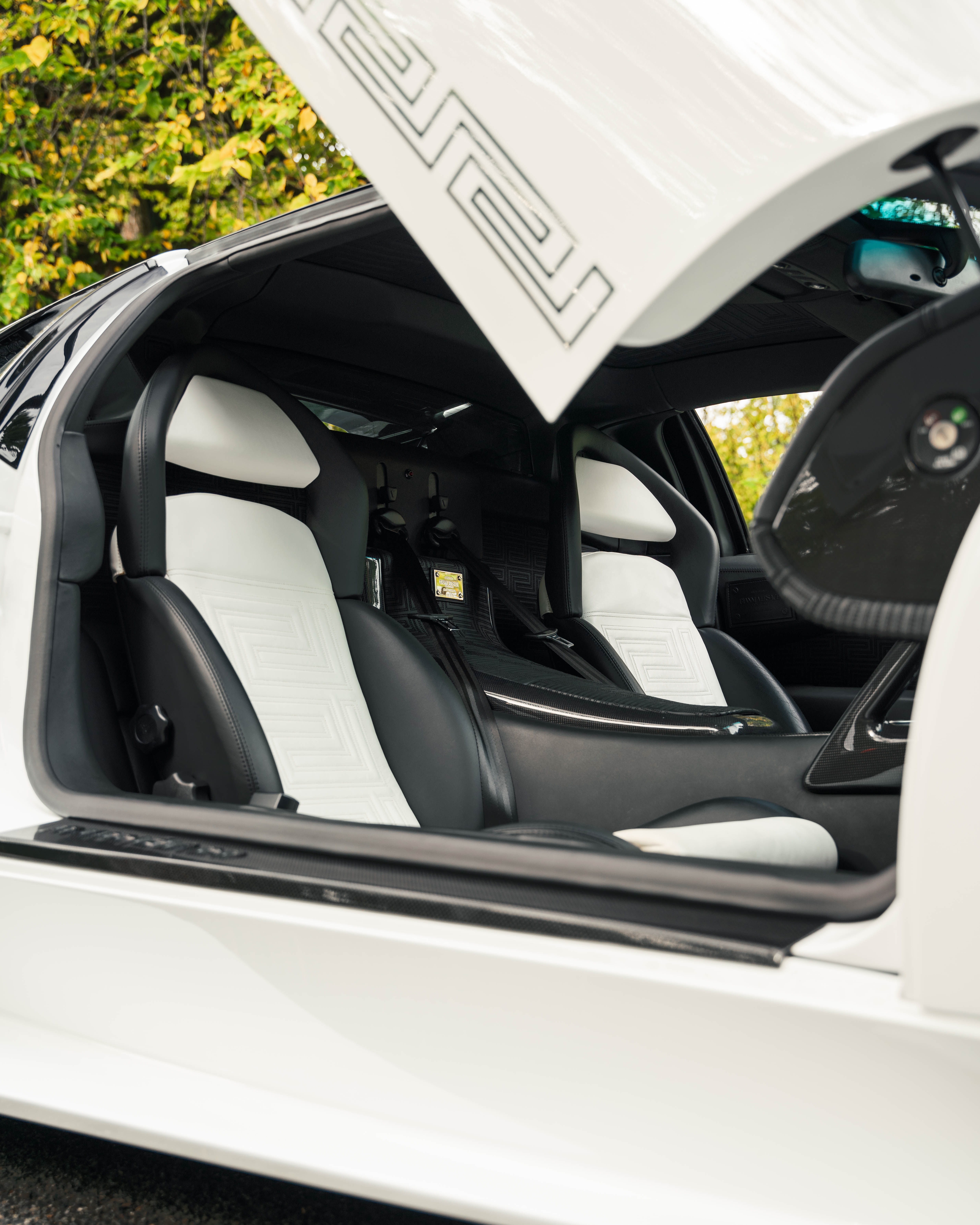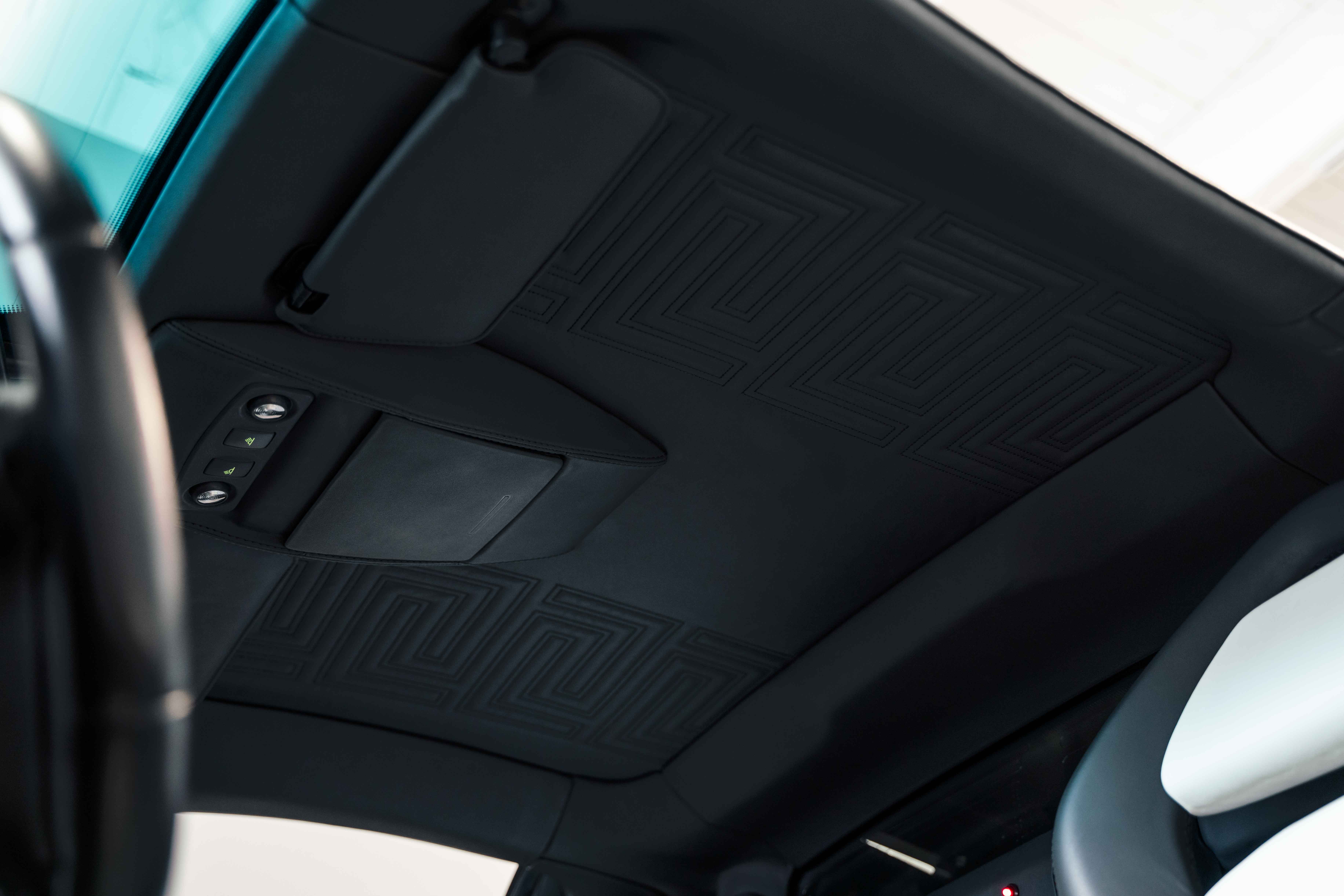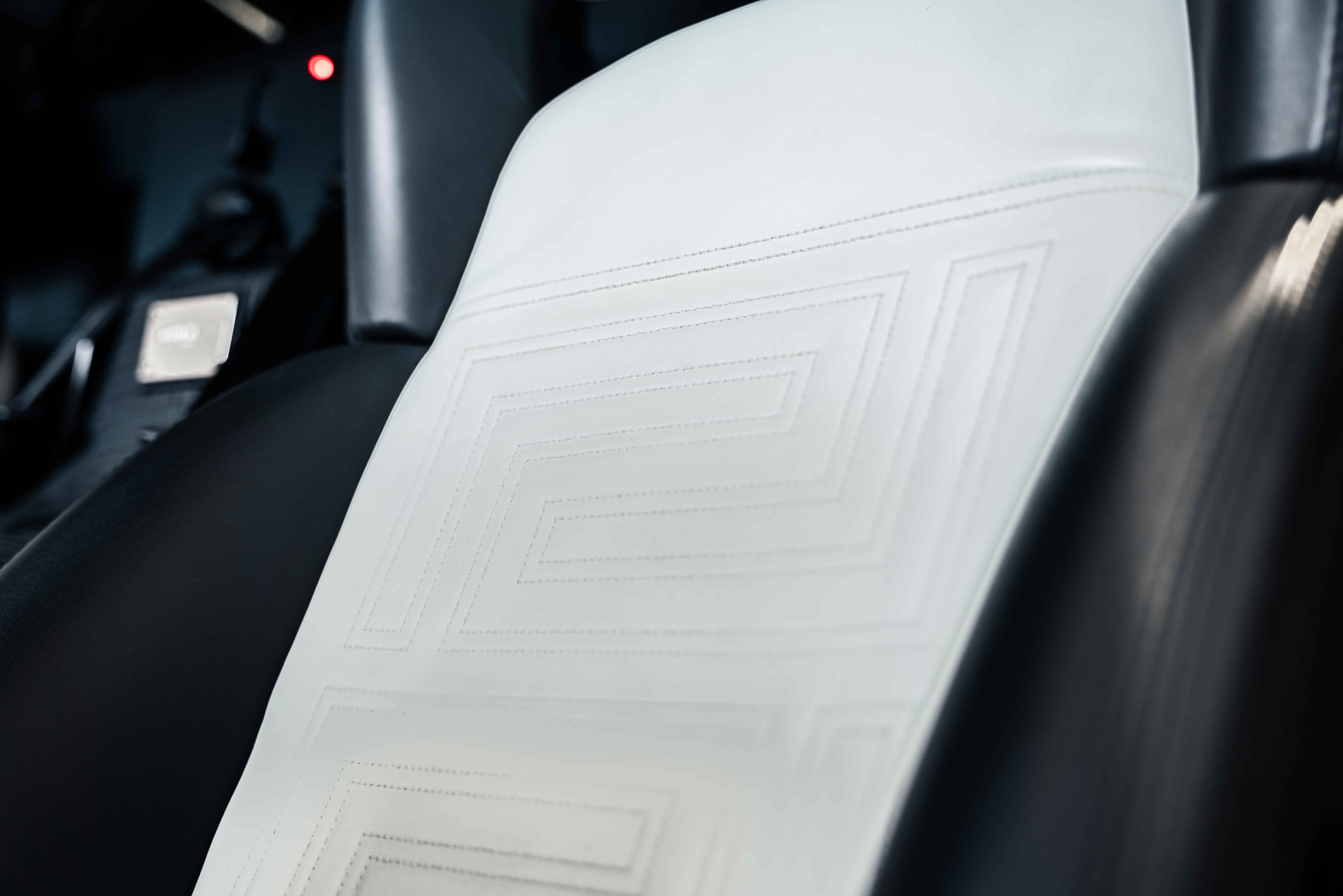 Custom leather seats with embroidered Versace "Meander" (Greek Key) pattern