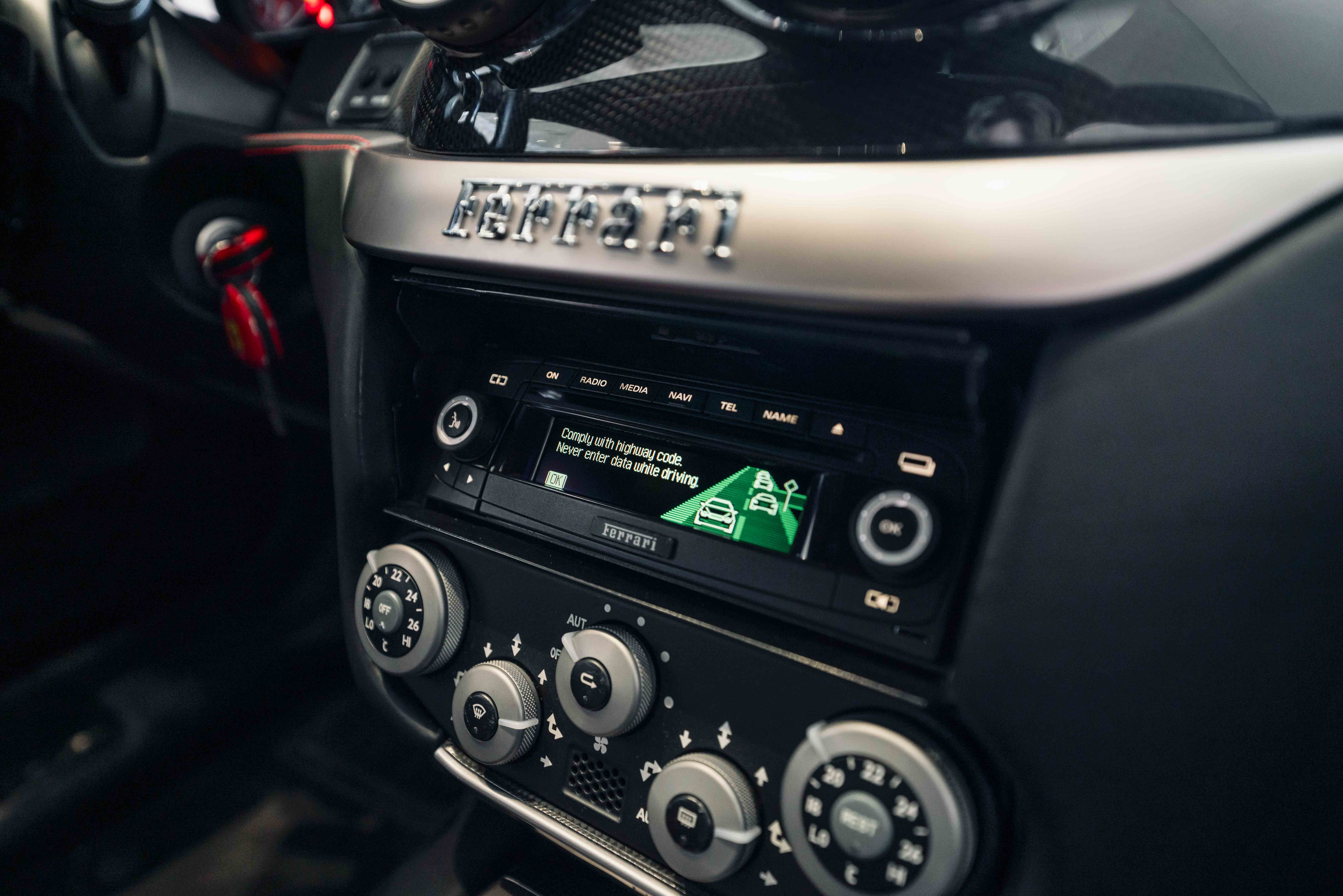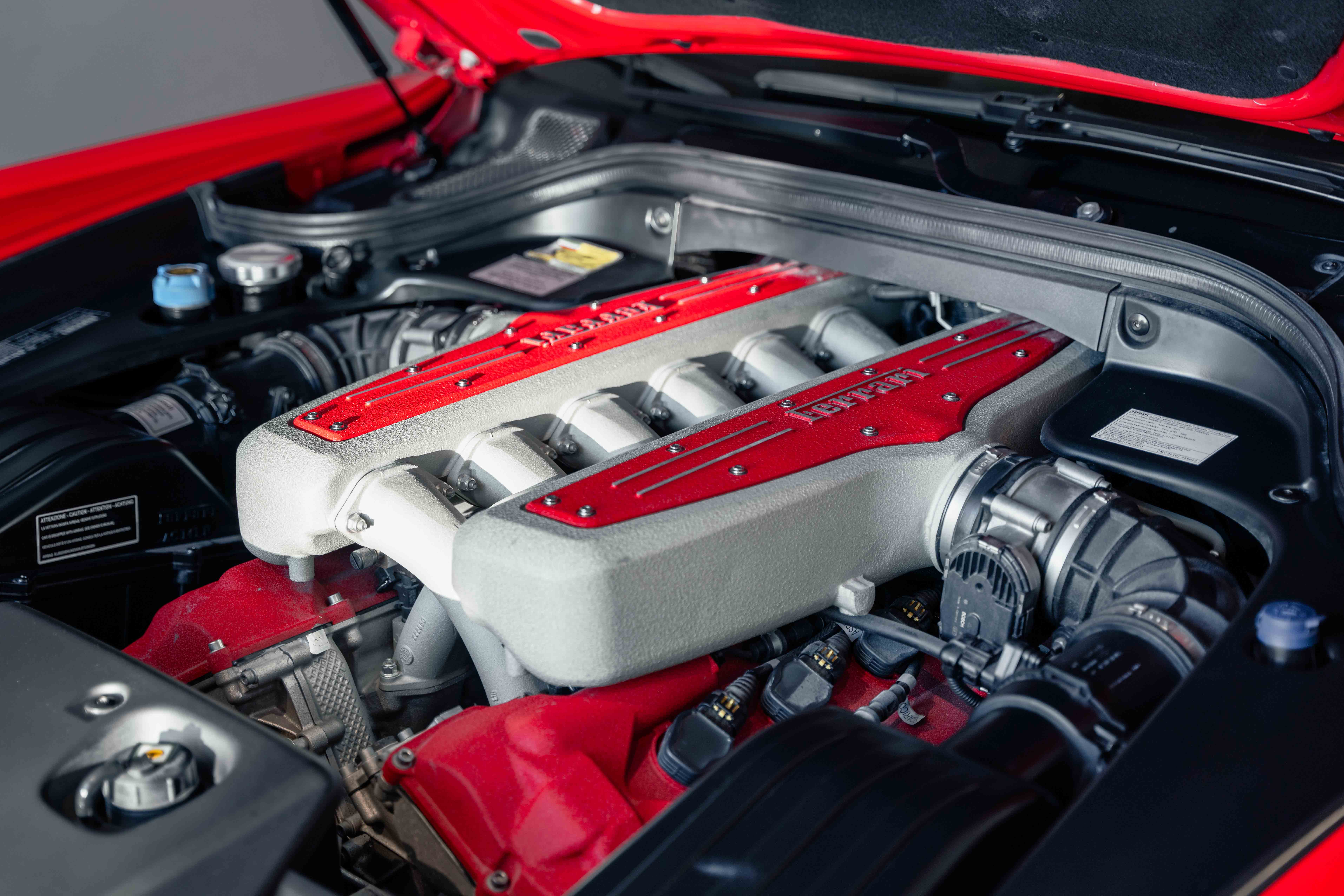 Step inside and you’re greeted by a beautifully appointed black leather interior that contrasts sharply with the Rosso Corsa exterior. The cabin is designed with the driver in mind, offering a low-slung, cockpit-like feel while still maintaining an air of comfort and elegance. High-quality materials, carbon fiber trim, and aluminum accents underscore the car’s balance between luxury and motorsport.