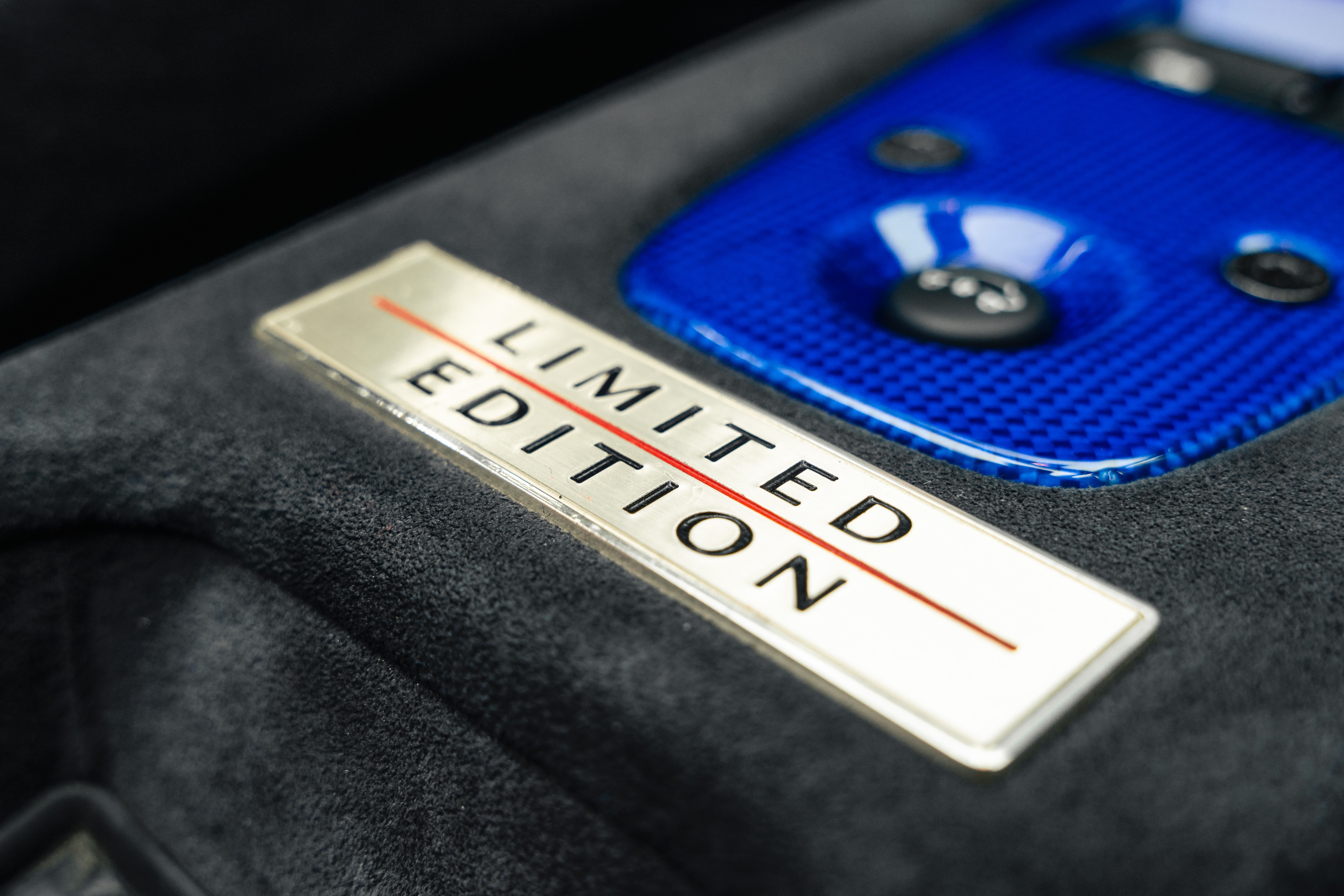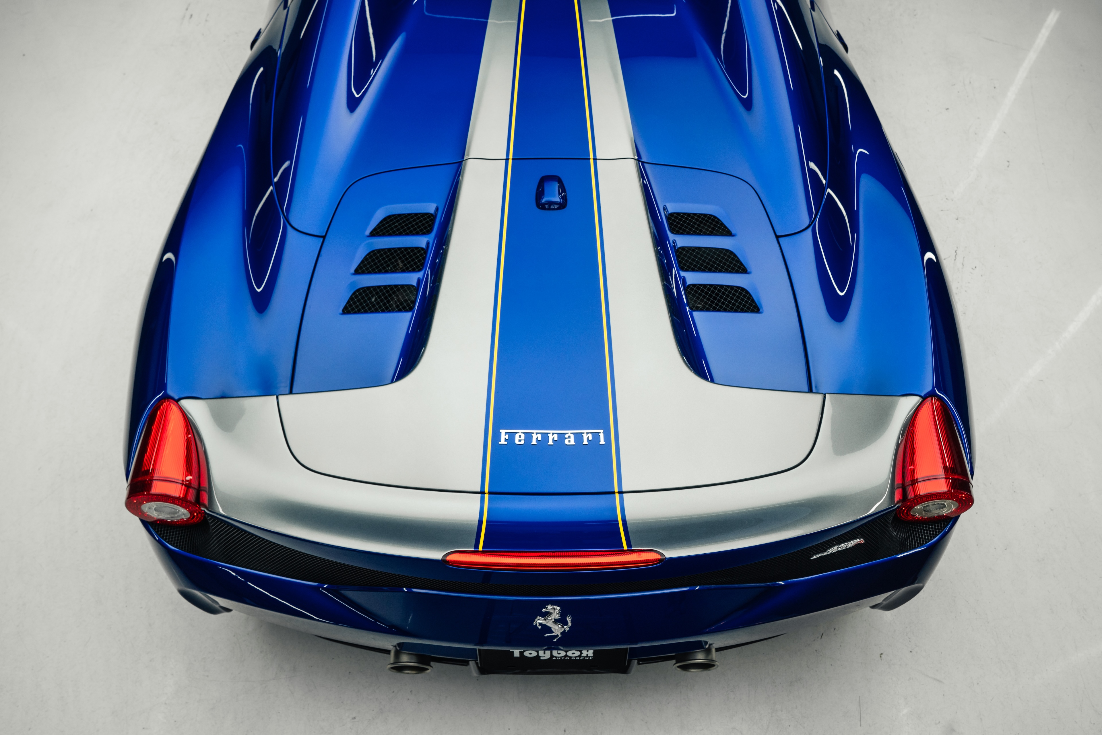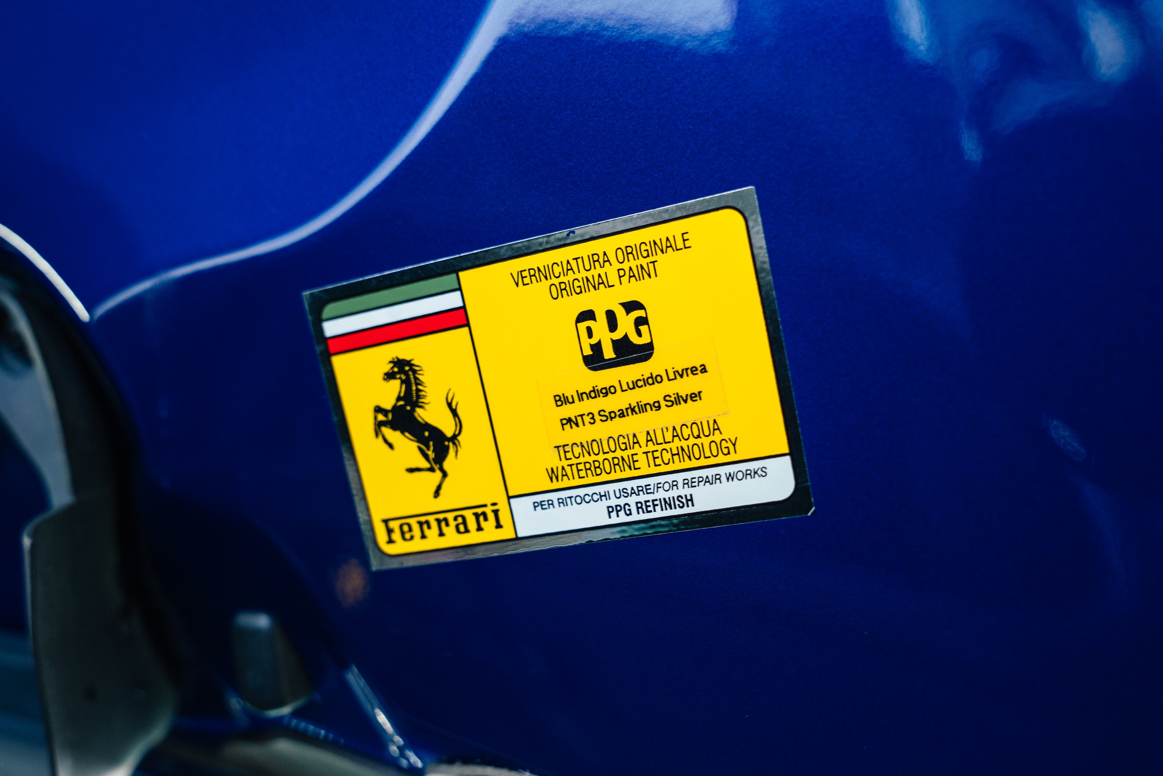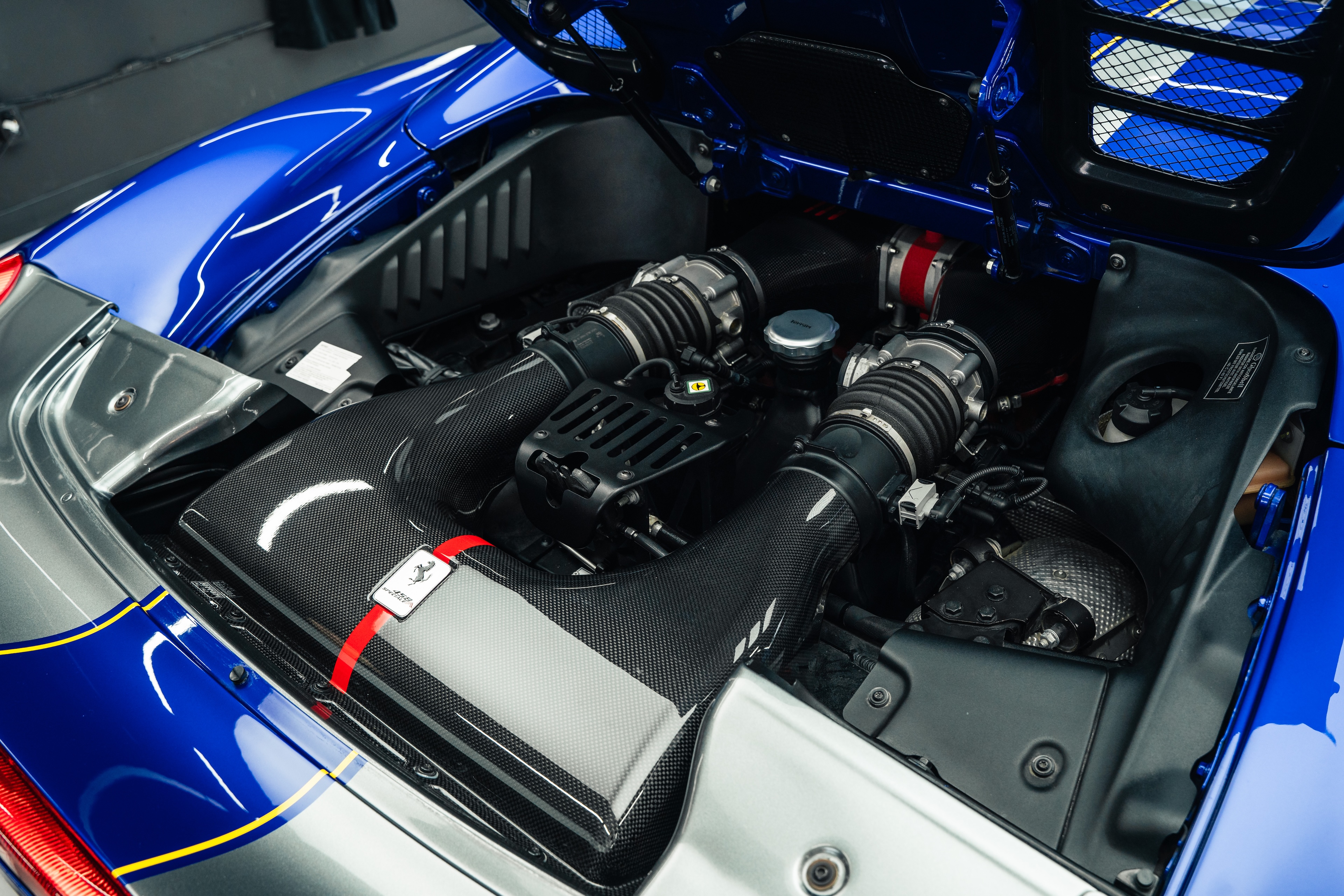 Finished in bespoke Blu Indigo Lucido with Sparkling Silver racing stripes, this car presents an ultra-rare specification through the Ferrari Tailor Made program. The exterior styling includes dual silver stripes down the nose and doors, a hallmark of its unique build. Beneath the topless body lies the same 4.5-litre naturally aspirated V8 that revs to an exhilarating 9,000 rpm, delivering 605 hp and pure analog exhilaration.