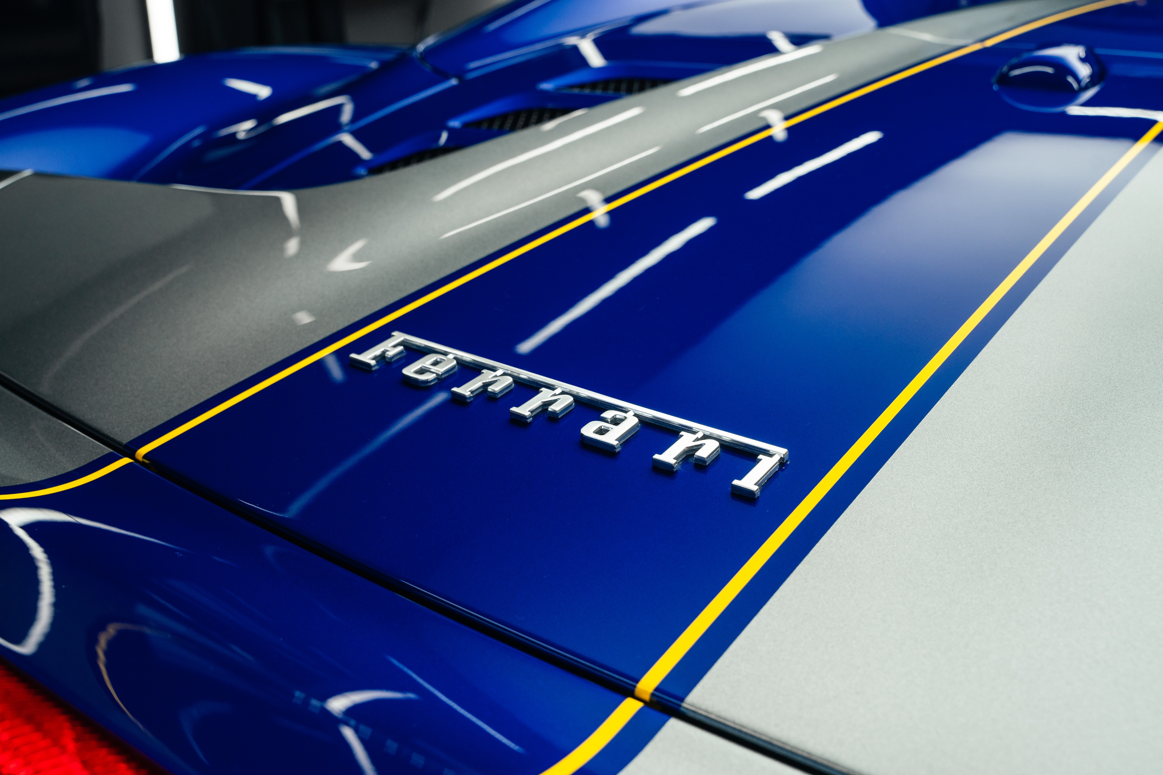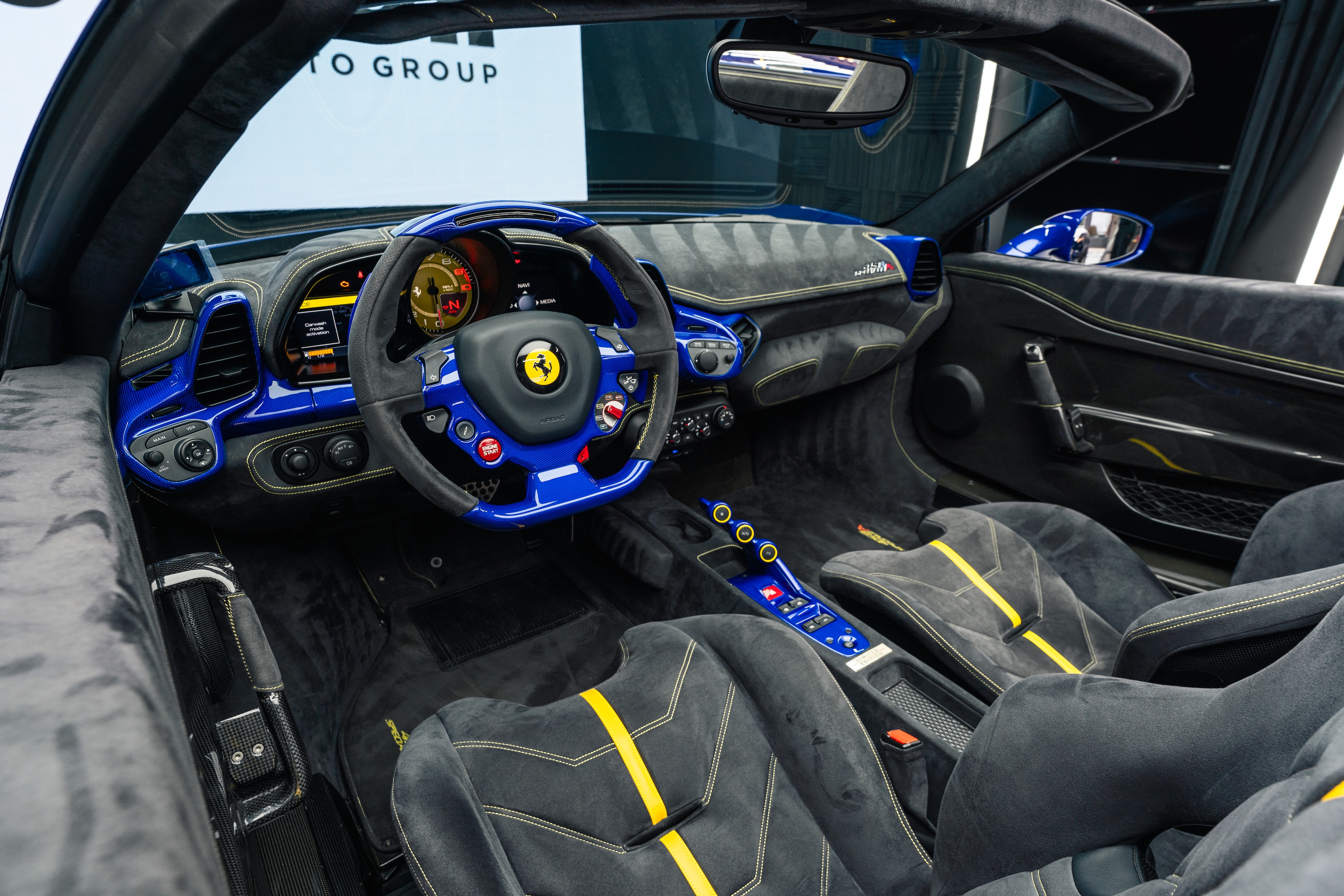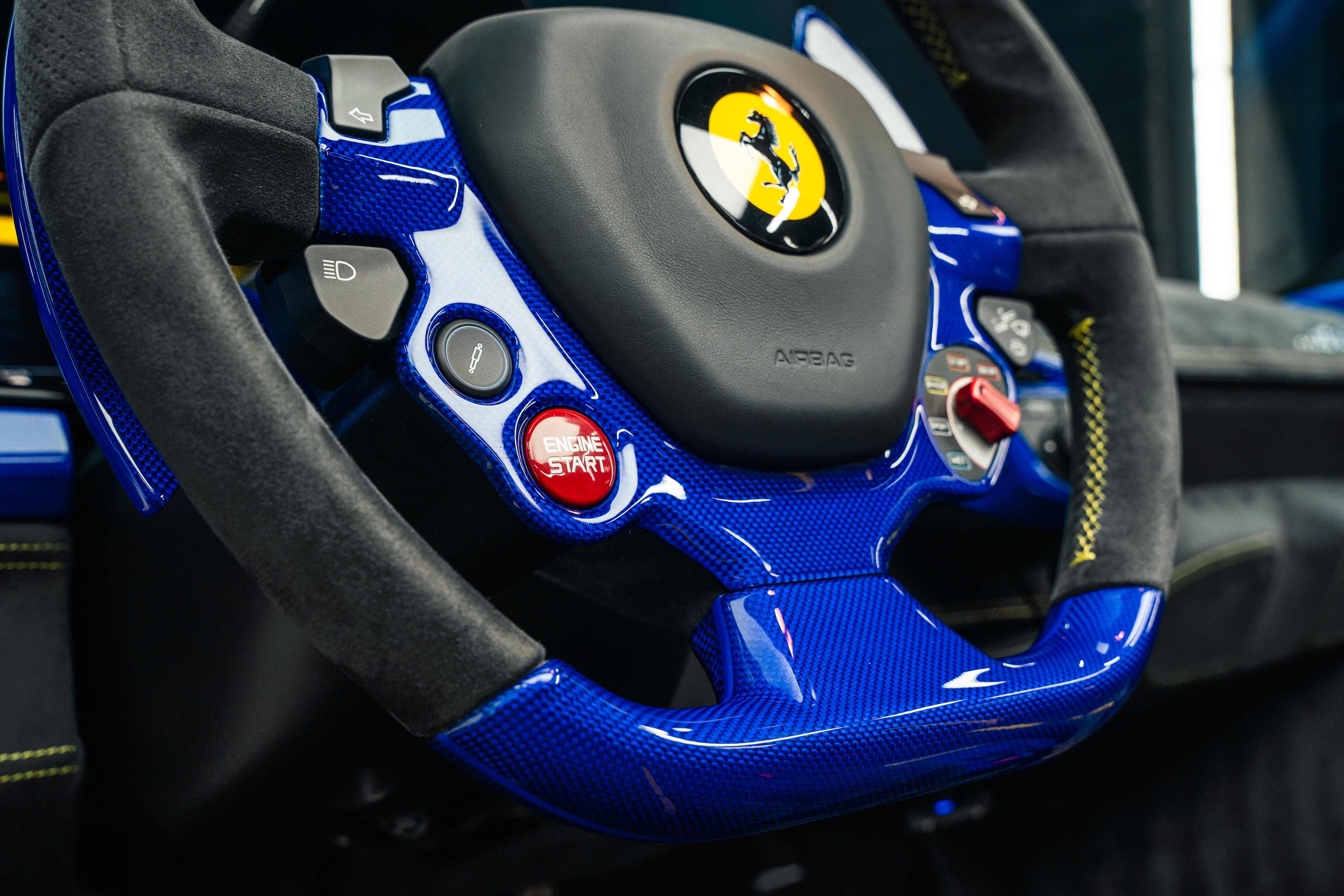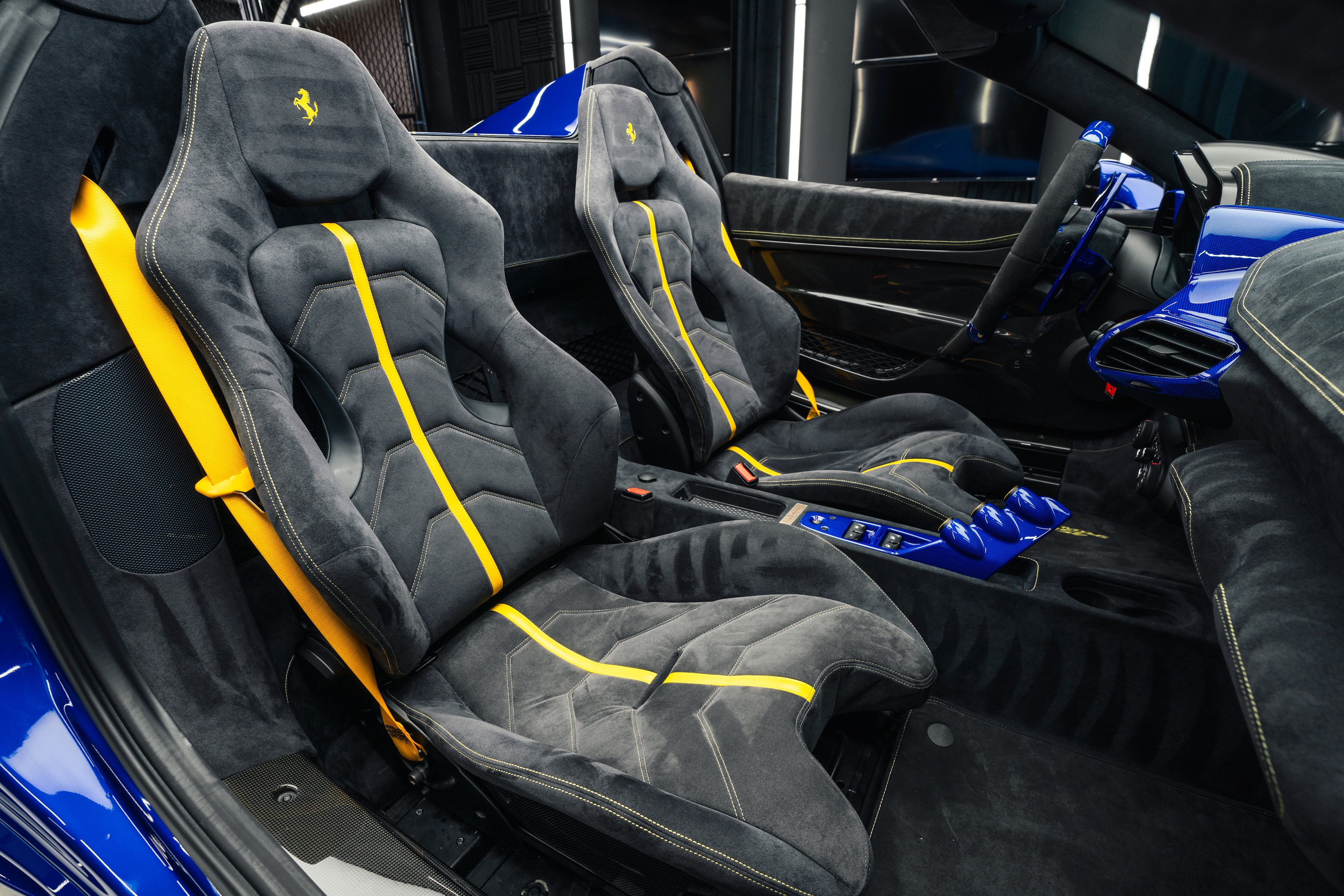 Inside, the cabin is richly trimmed in Blu Scuro Alcantara with vivid yellow stitching and contrast seat centers. Blue carbon-fibre trim panels extend across the dash, centre tunnel and steering wheel—crafted as part of the bespoke build for its VIP first owner. Embossed Ferrari branding, race-inspired seats and a purposeful interior layout complete the experience of a true performance masterpiece.