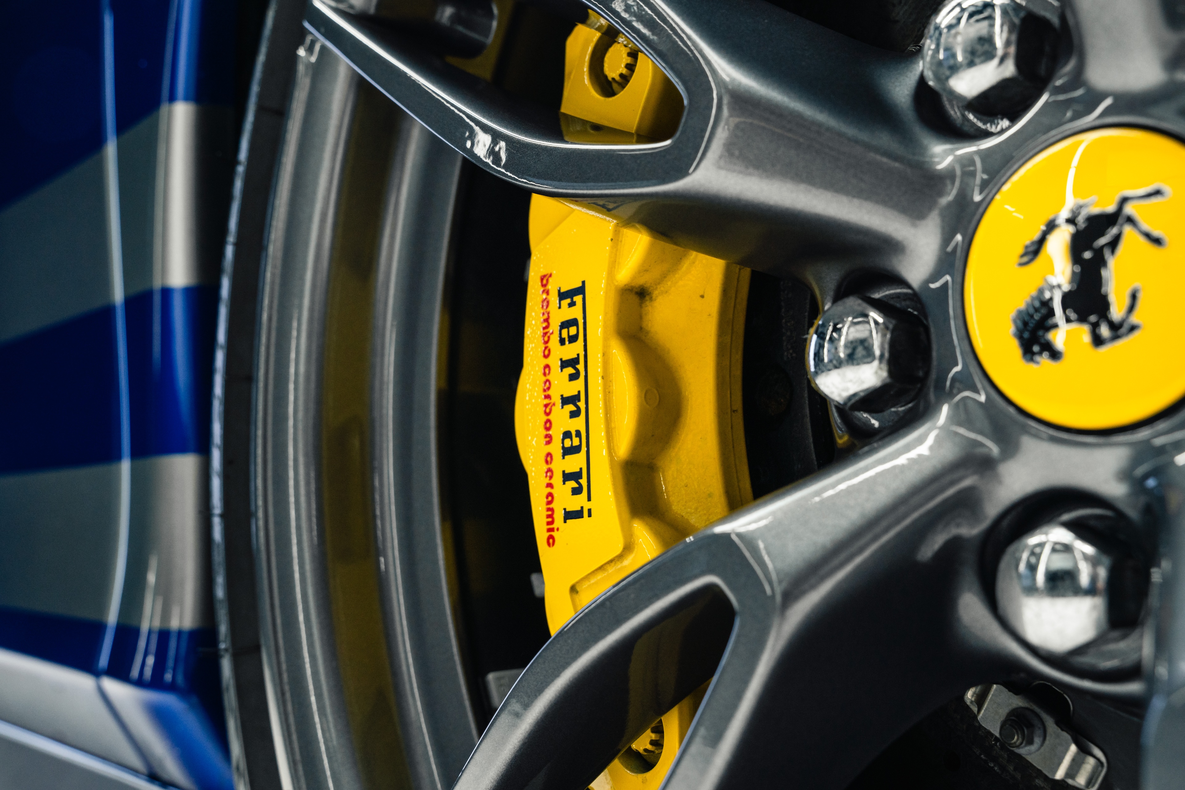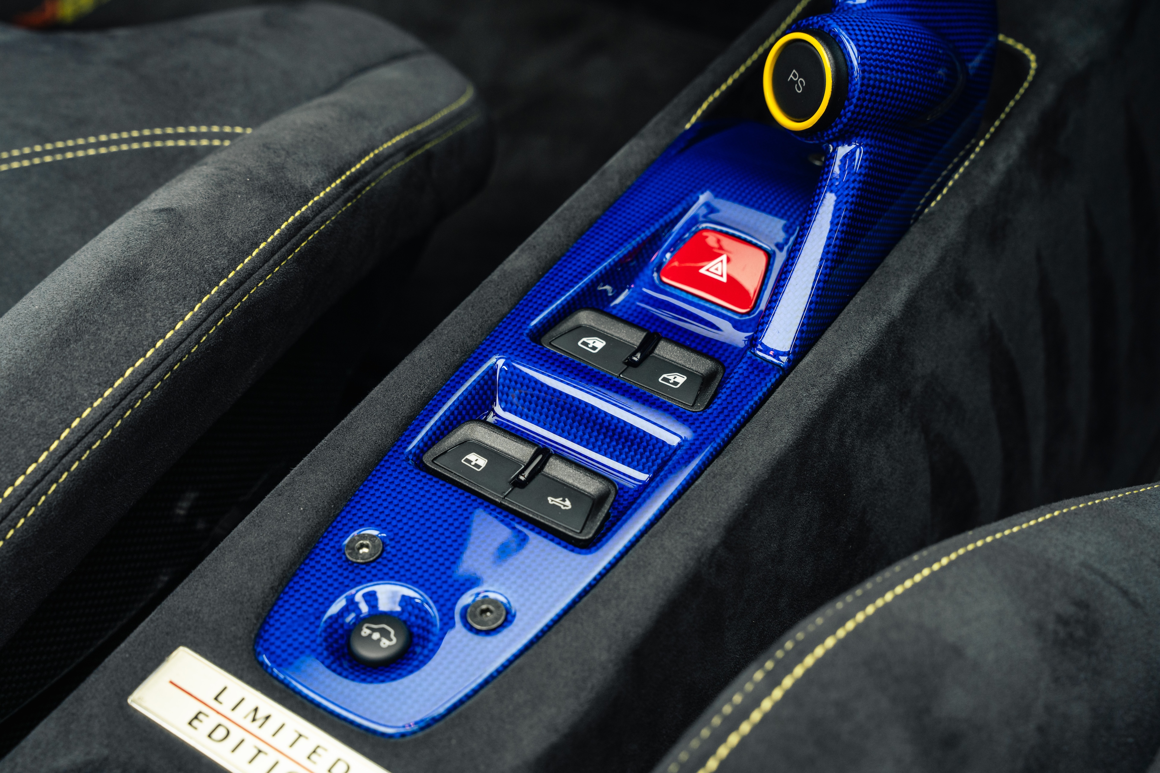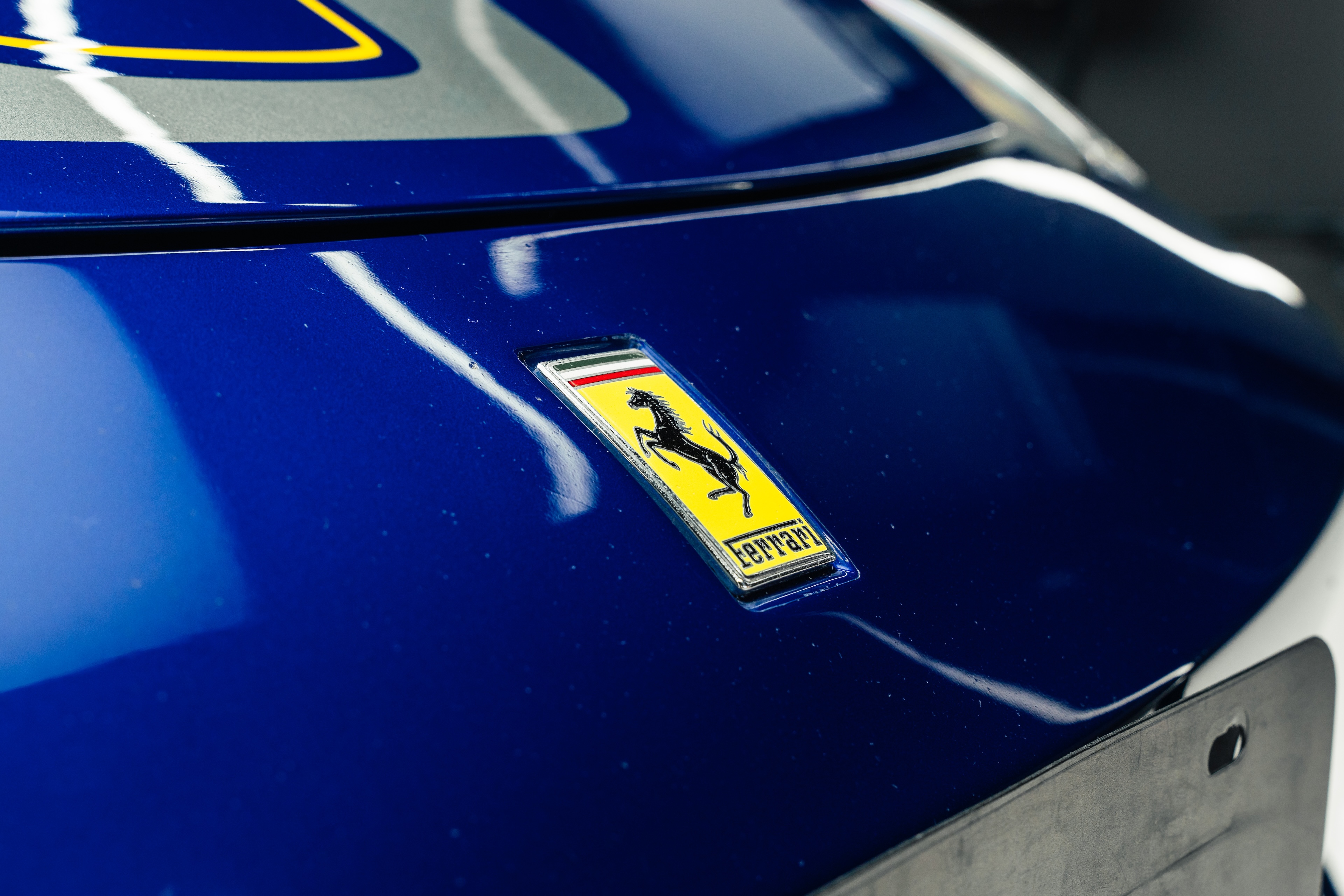 Inside, the cabin is richly trimmed in Blu Scuro Alcantara with vivid yellow stitching and contrast seat centers. Blue carbon-fibre trim panels extend across the dash, centre tunnel and steering wheel—crafted as part of the bespoke build for its VIP first owner. Embossed Ferrari branding, race-inspired seats and a purposeful interior layout complete the experience of a true performance masterpiece.