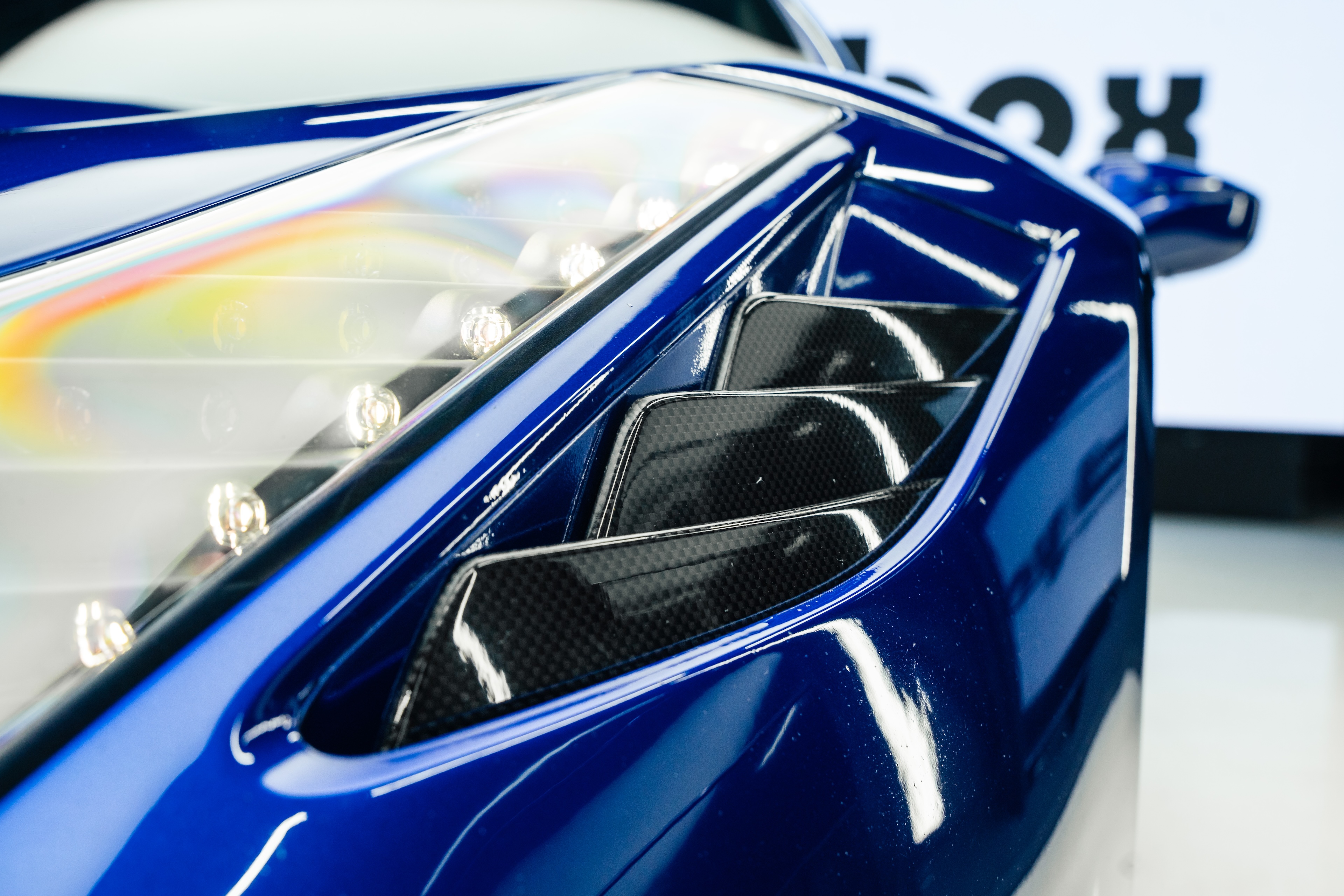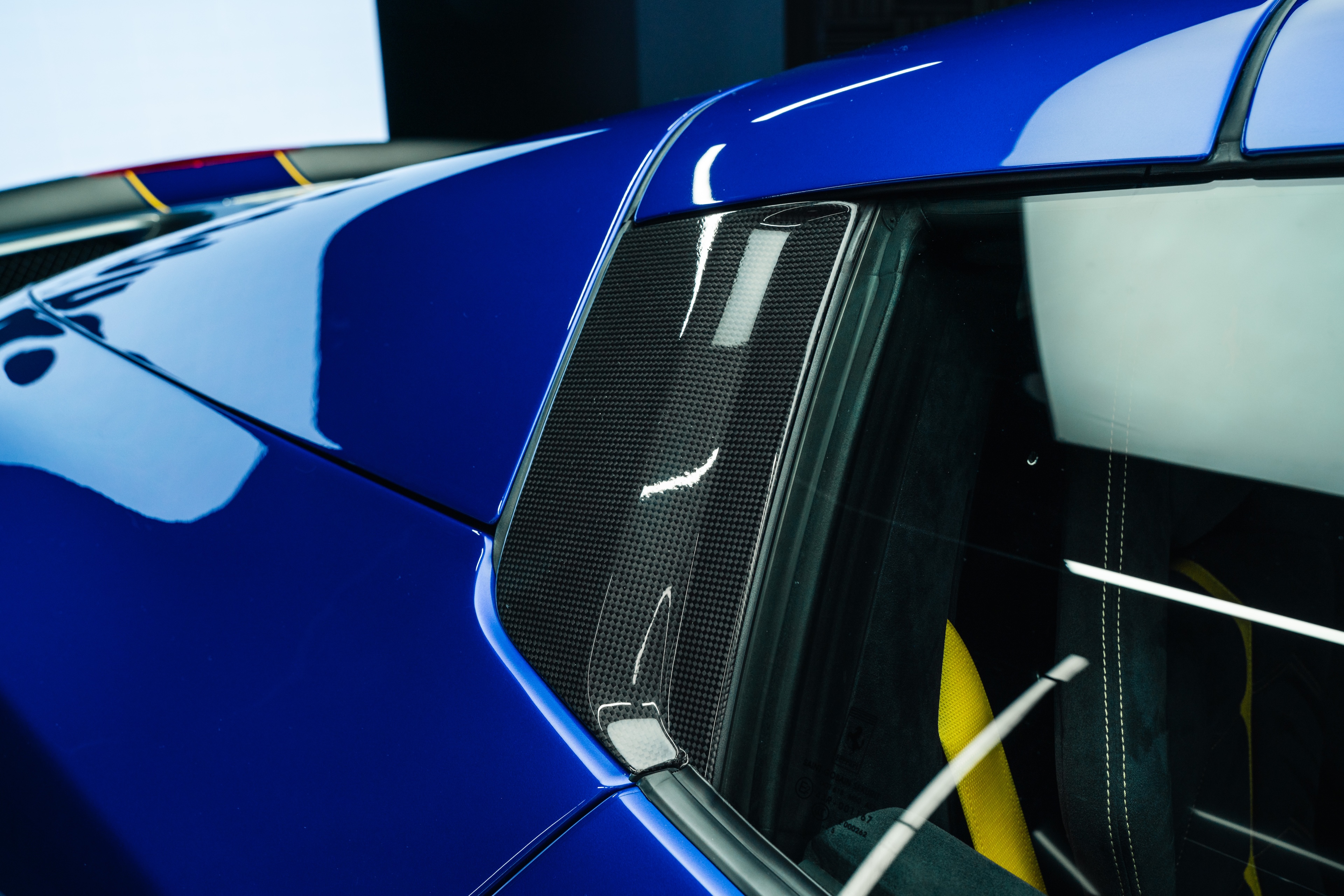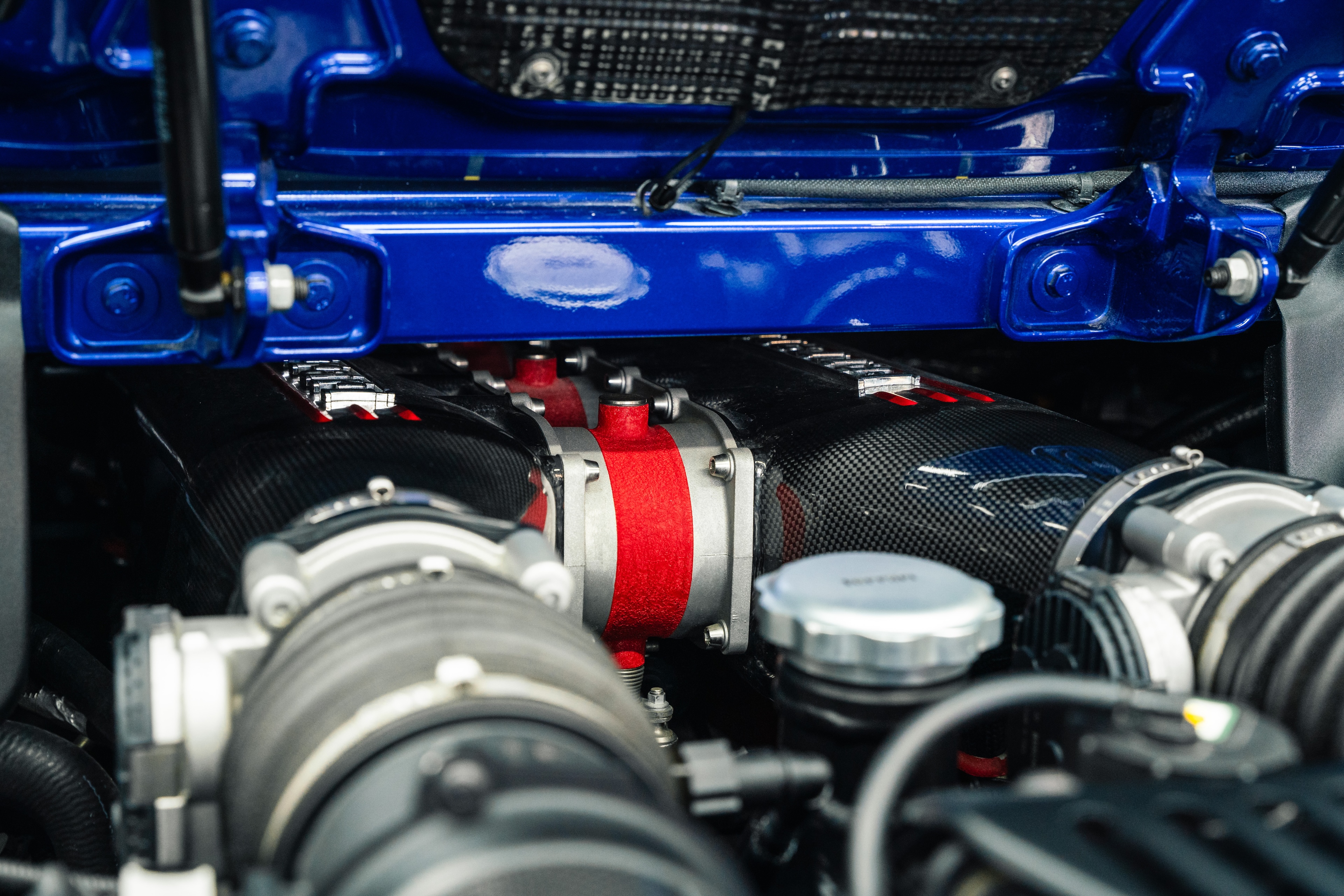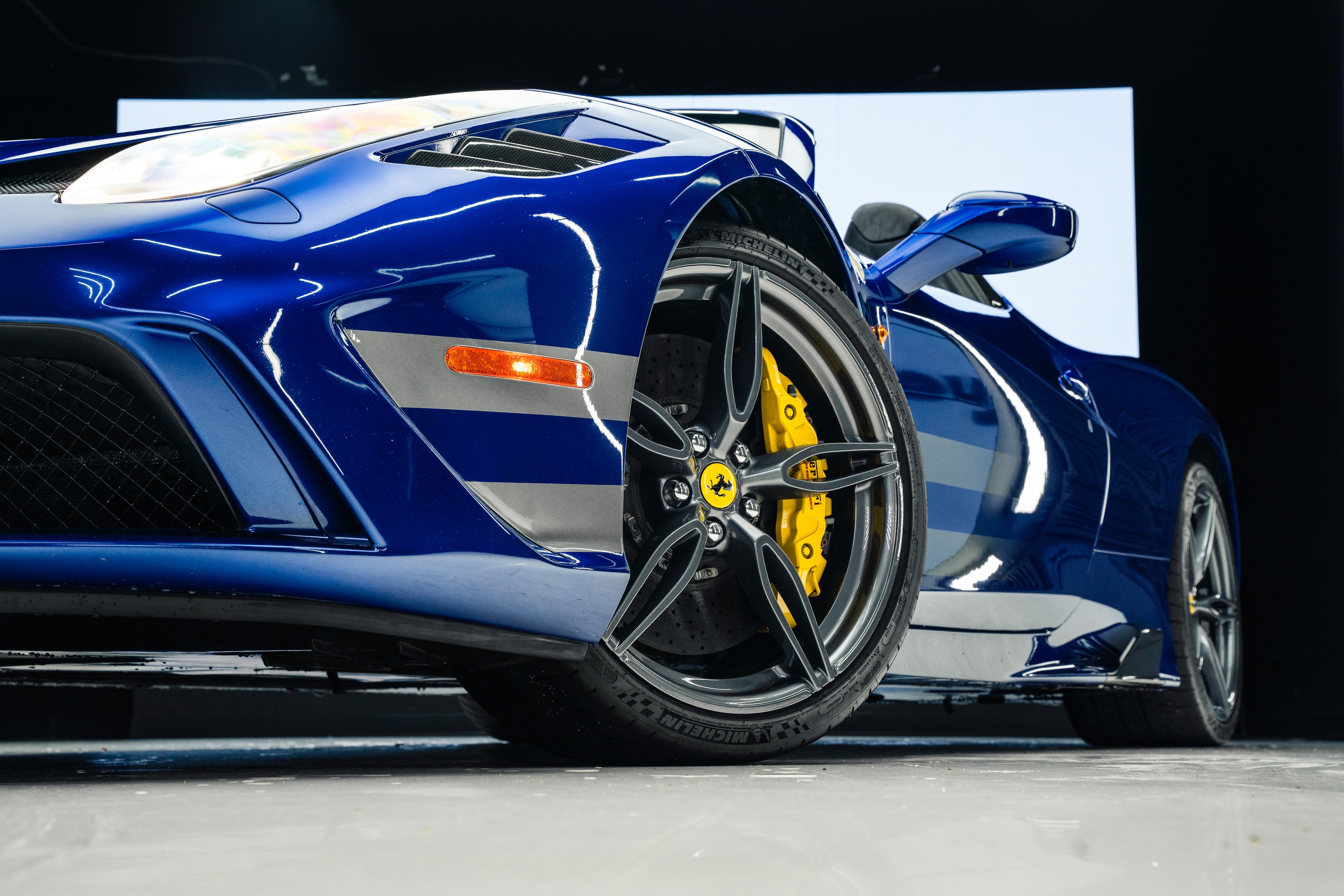 Inside, the cabin is richly trimmed in Blu Scuro Alcantara with vivid yellow stitching and contrast seat centers. Blue carbon-fibre trim panels extend across the dash, centre tunnel and steering wheel—crafted as part of the bespoke build for its VIP first owner. Embossed Ferrari branding, race-inspired seats and a purposeful interior layout complete the experience of a true performance masterpiece.