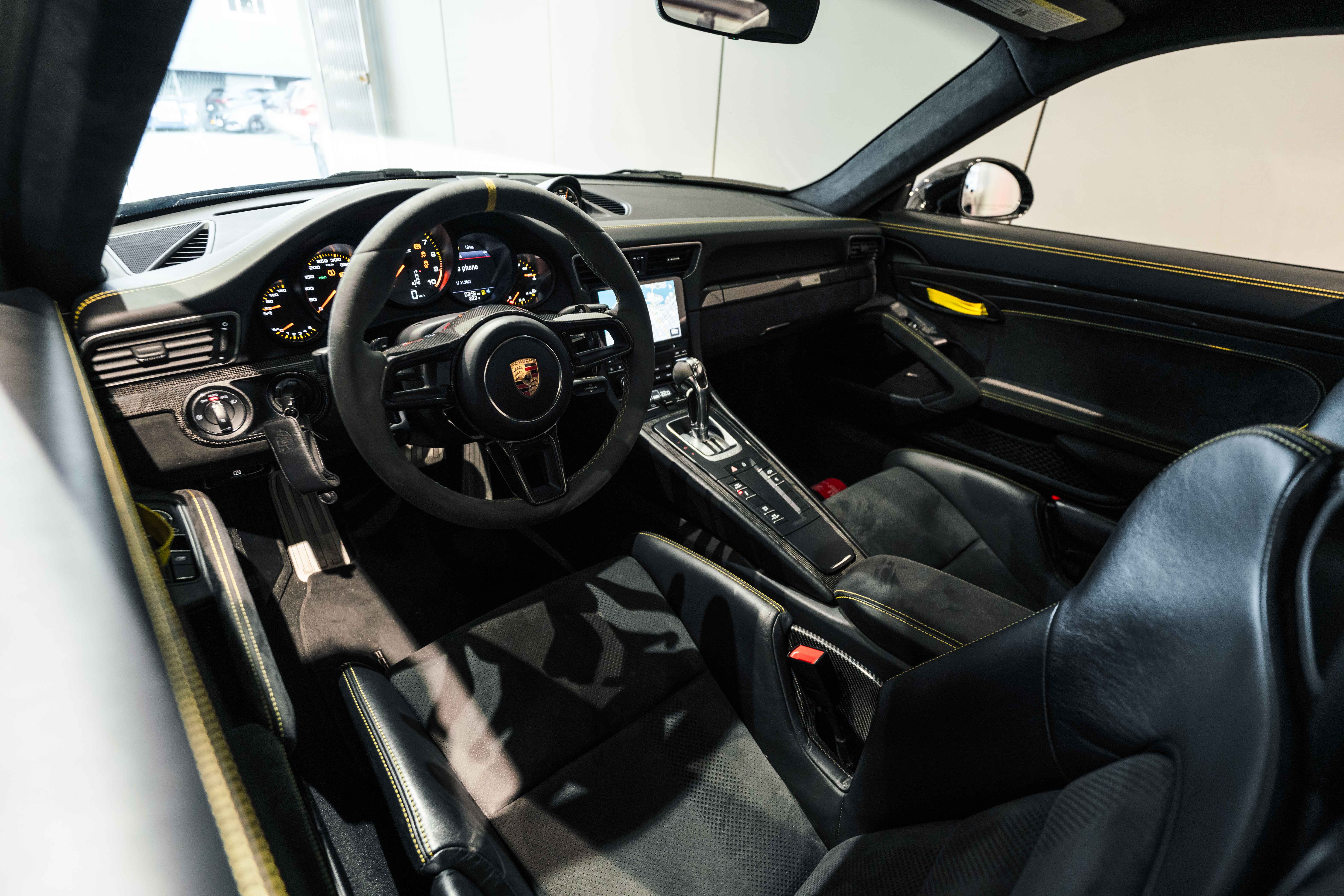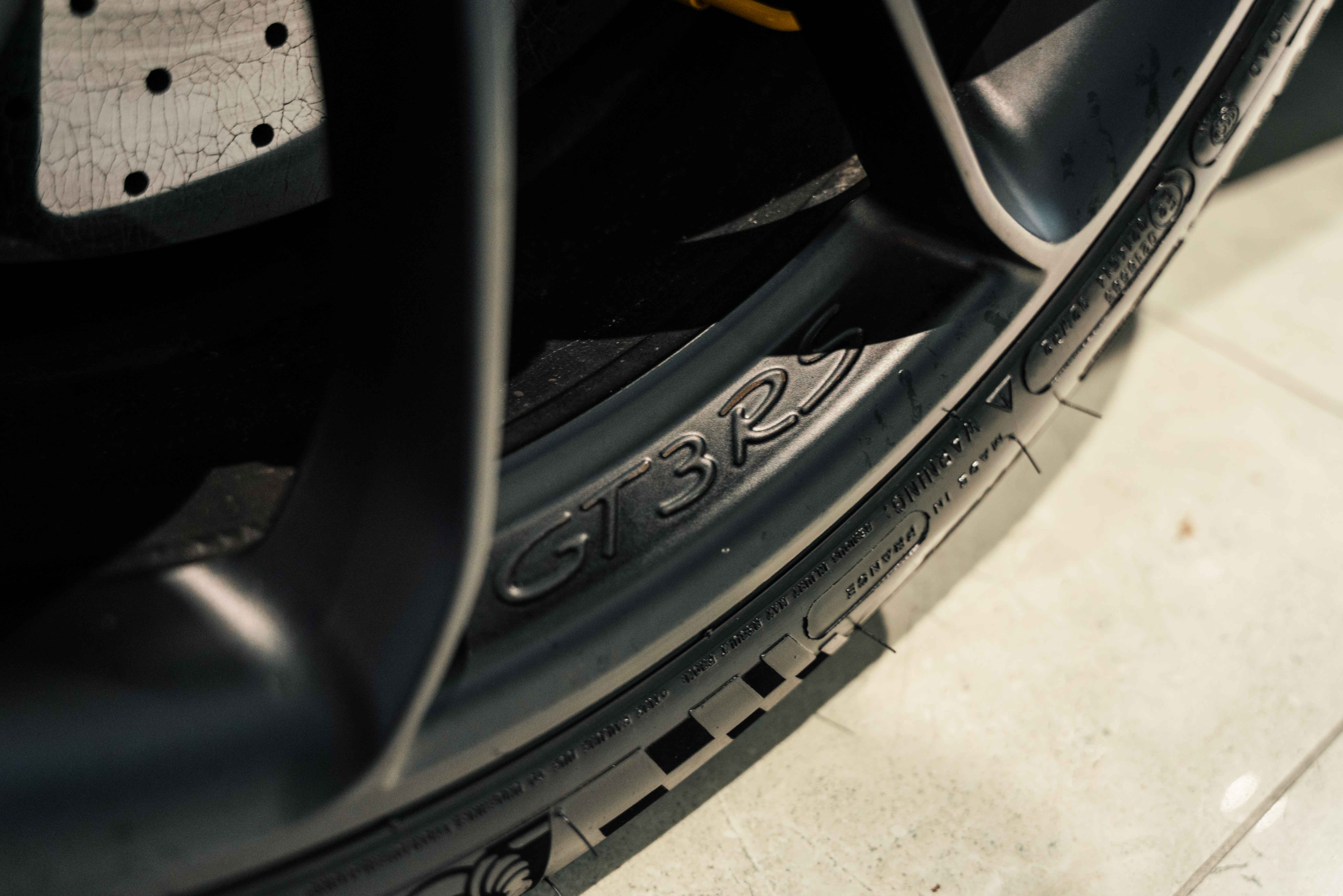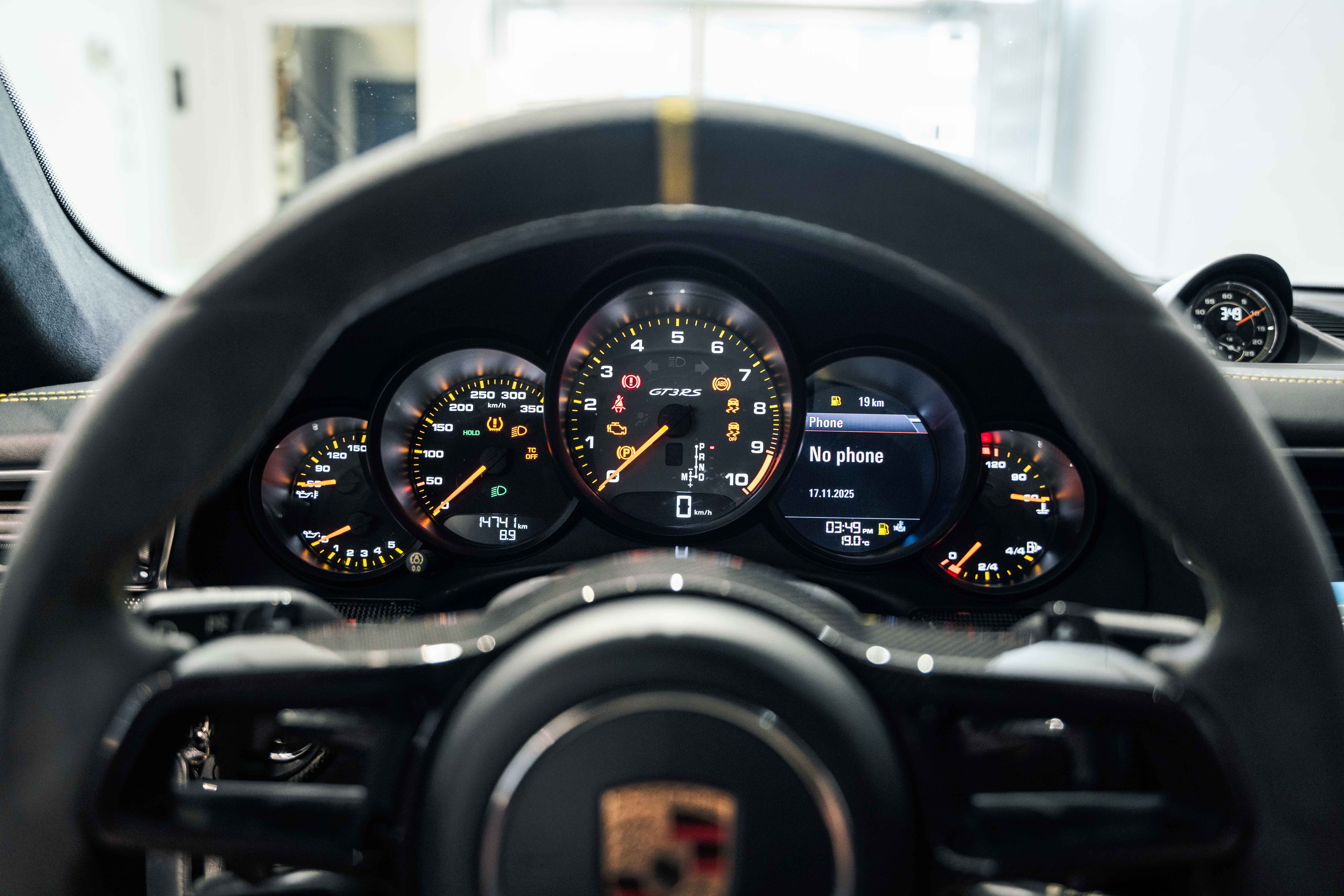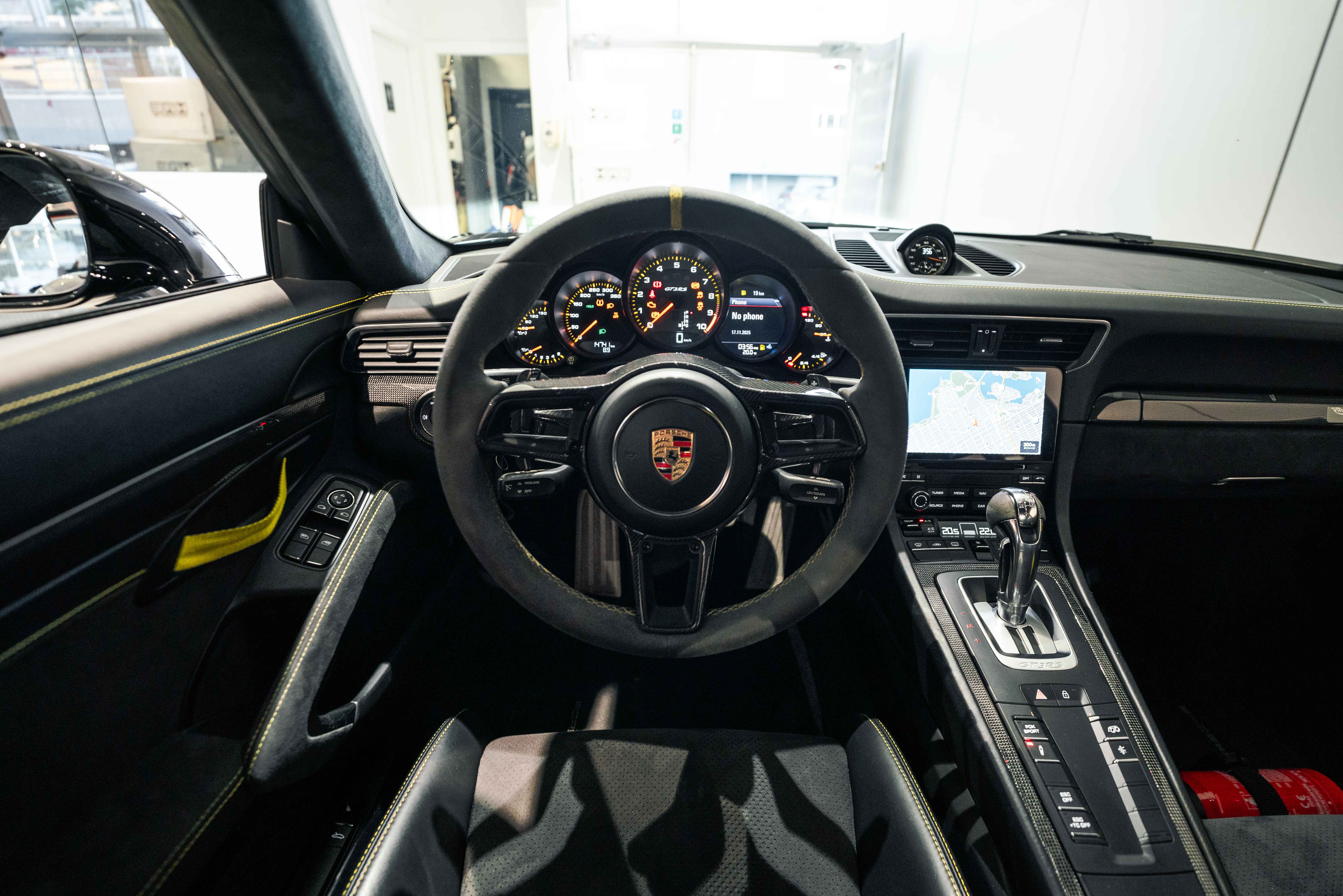 Inside, the cabin is wrapped in Black Leather/Alcantara, elevated by Racing Yellow deviated stitching and matching yellow seat belts for a subtle motorsport contrast. The carbon fiber door-sill guards (illuminated), aluminum pedals, and carbon triangle window trims further emphasize the GT3 RS’s lightweight performance ethos. The cockpit also features the Chrono Package with lap trigger prep, BOSE Surround Sound, and the Light Design Package, creating a space that is equally functional on the road and the circuit.