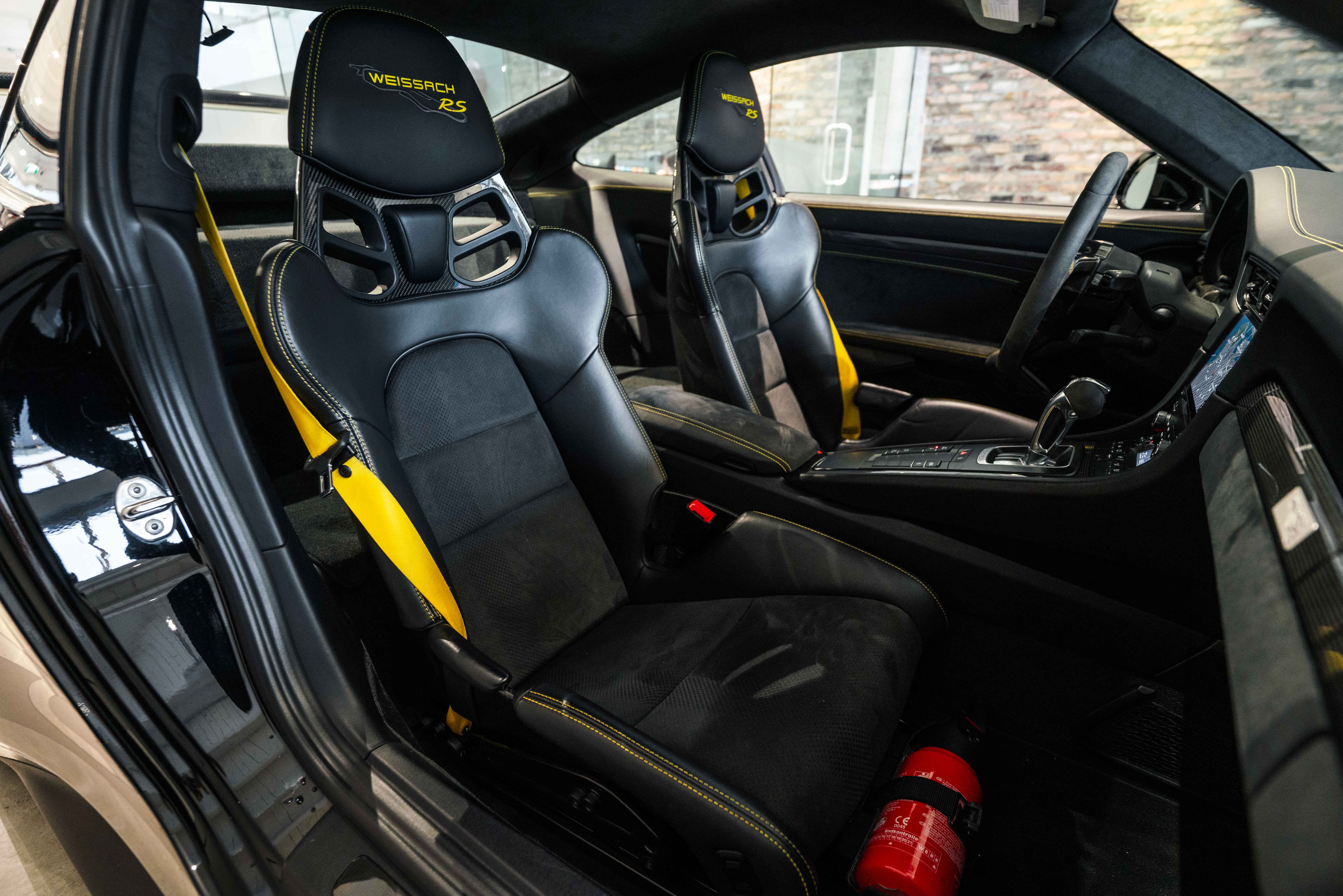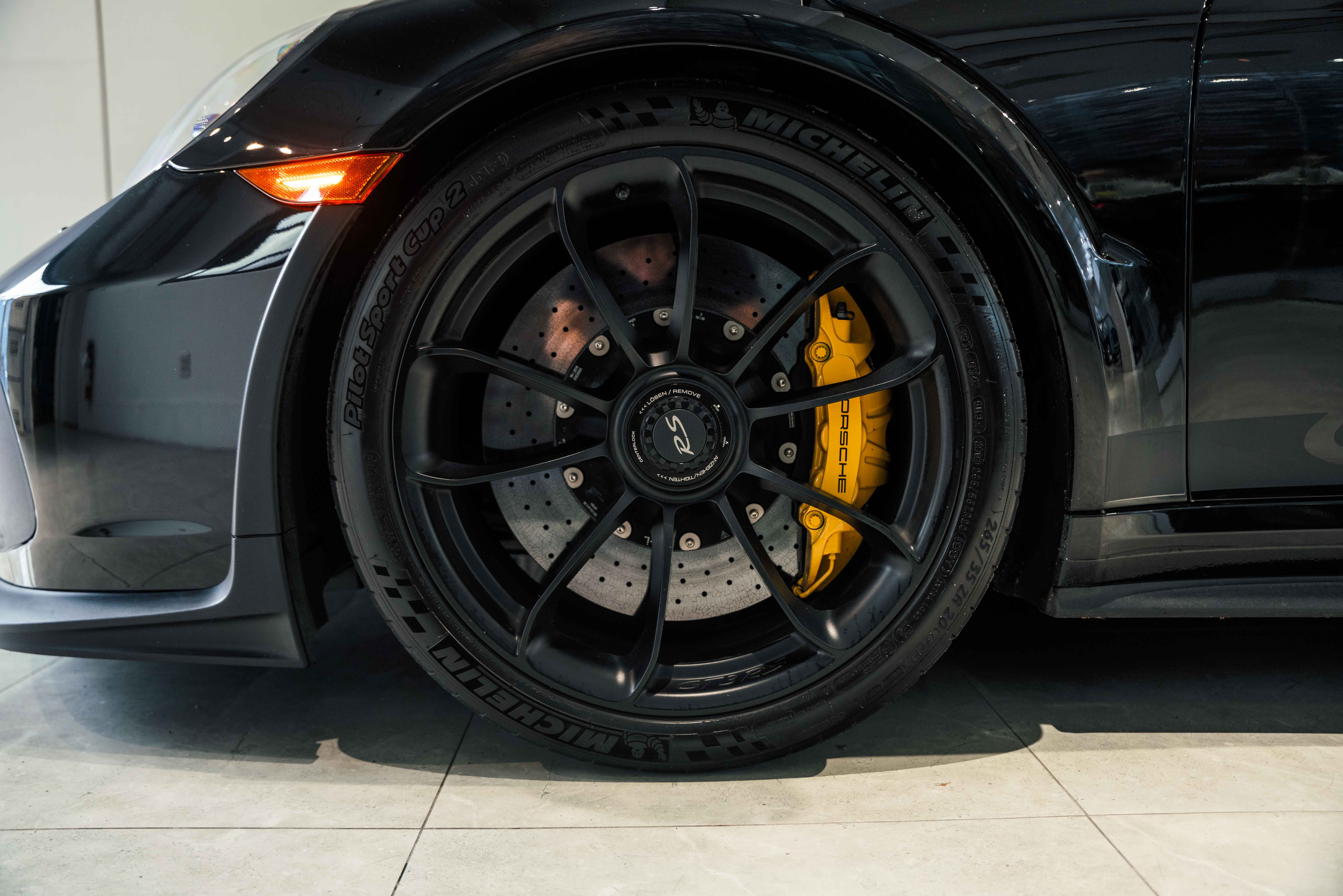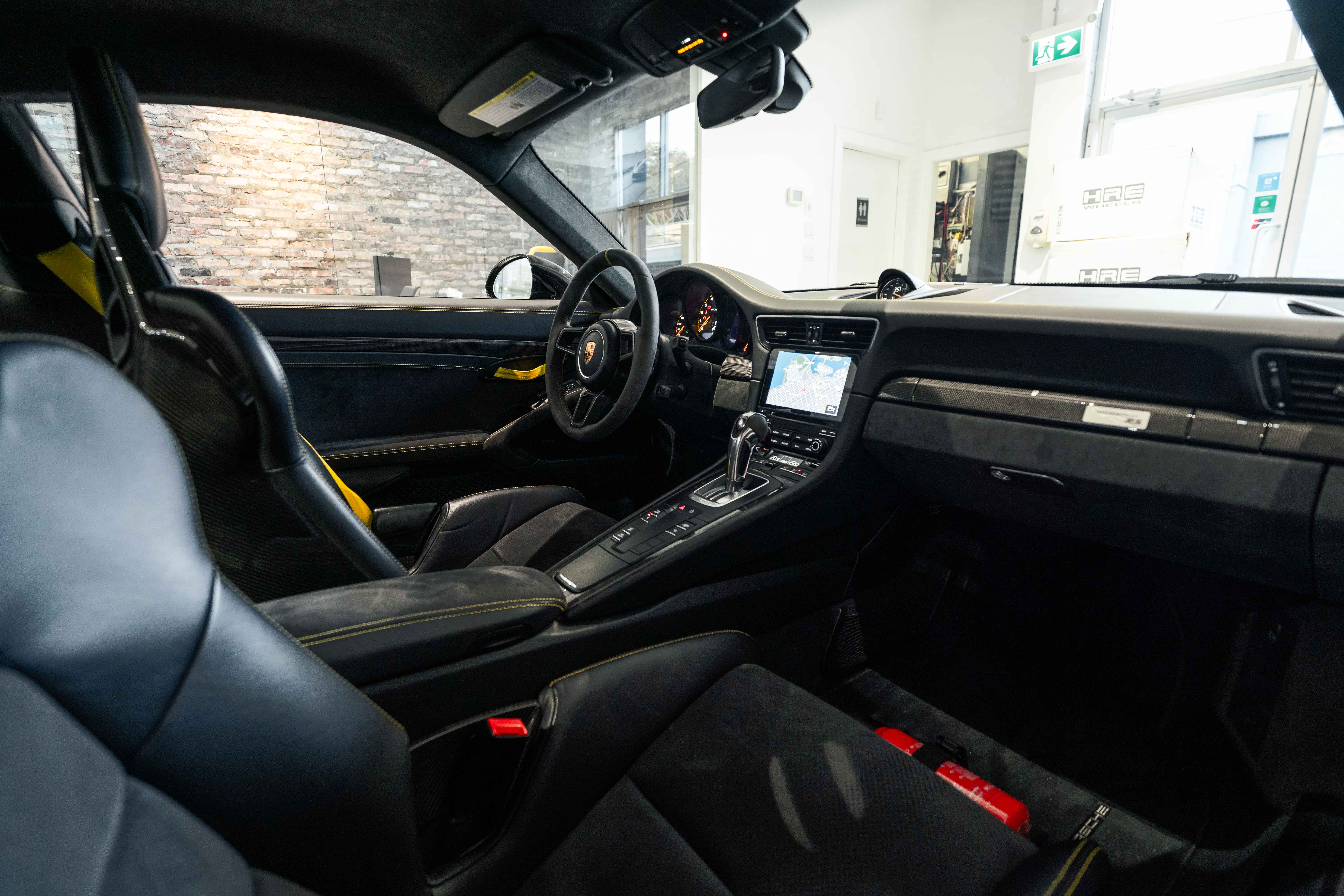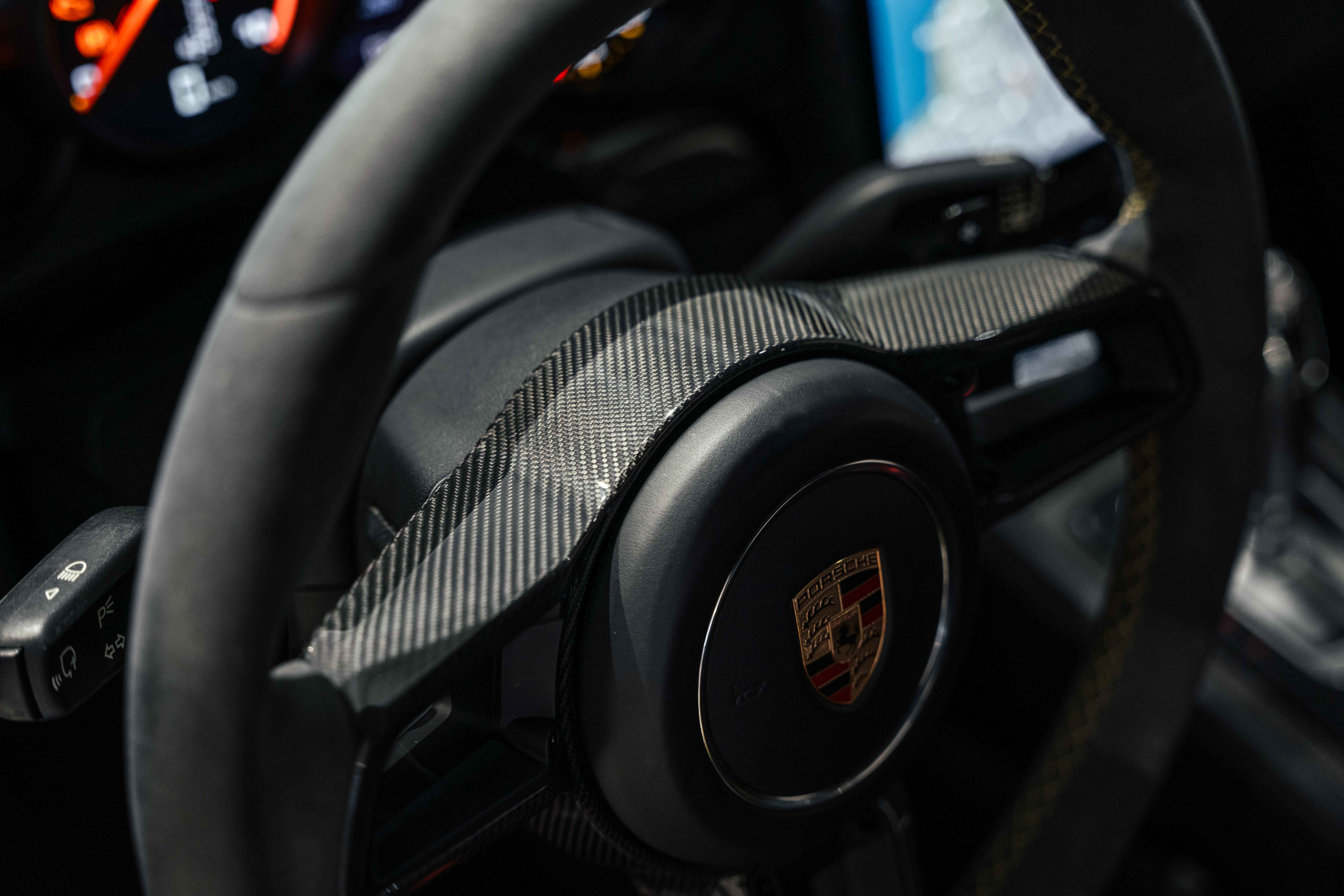 Inside, the cabin is wrapped in Black Leather/Alcantara, elevated by Racing Yellow deviated stitching and matching yellow seat belts for a subtle motorsport contrast. The carbon fiber door-sill guards (illuminated), aluminum pedals, and carbon triangle window trims further emphasize the GT3 RS’s lightweight performance ethos. The cockpit also features the Chrono Package with lap trigger prep, BOSE Surround Sound, and the Light Design Package, creating a space that is equally functional on the road and the circuit.