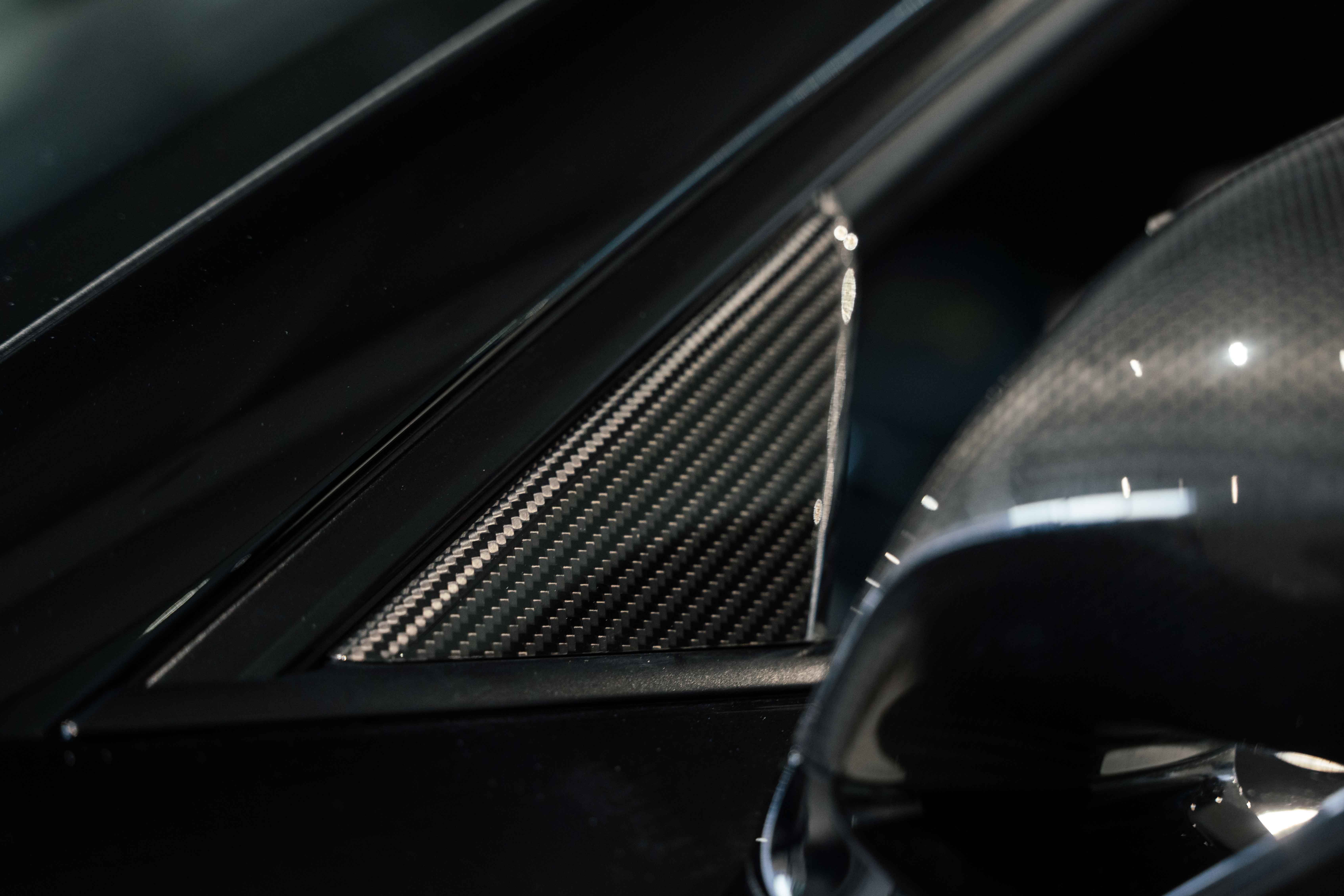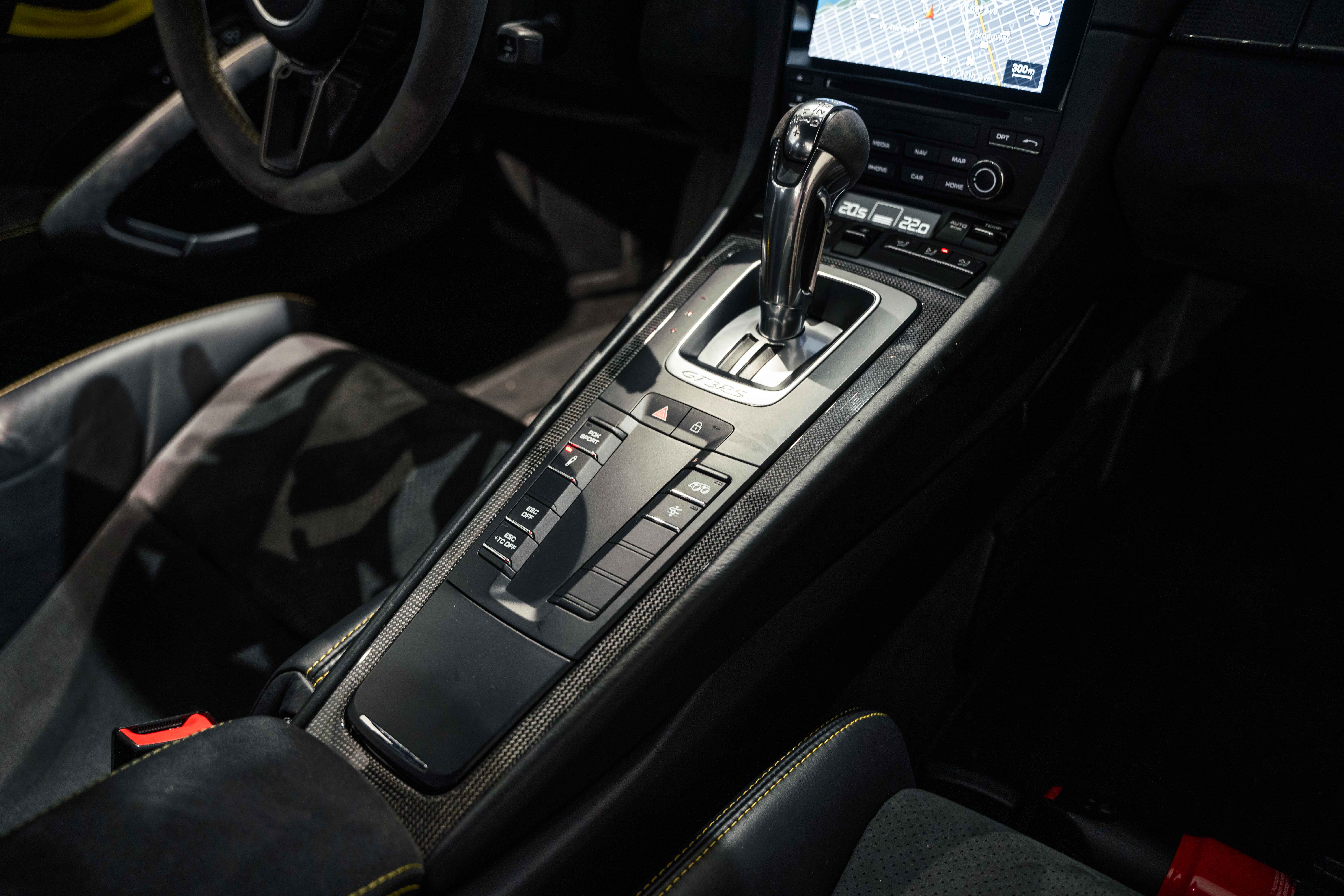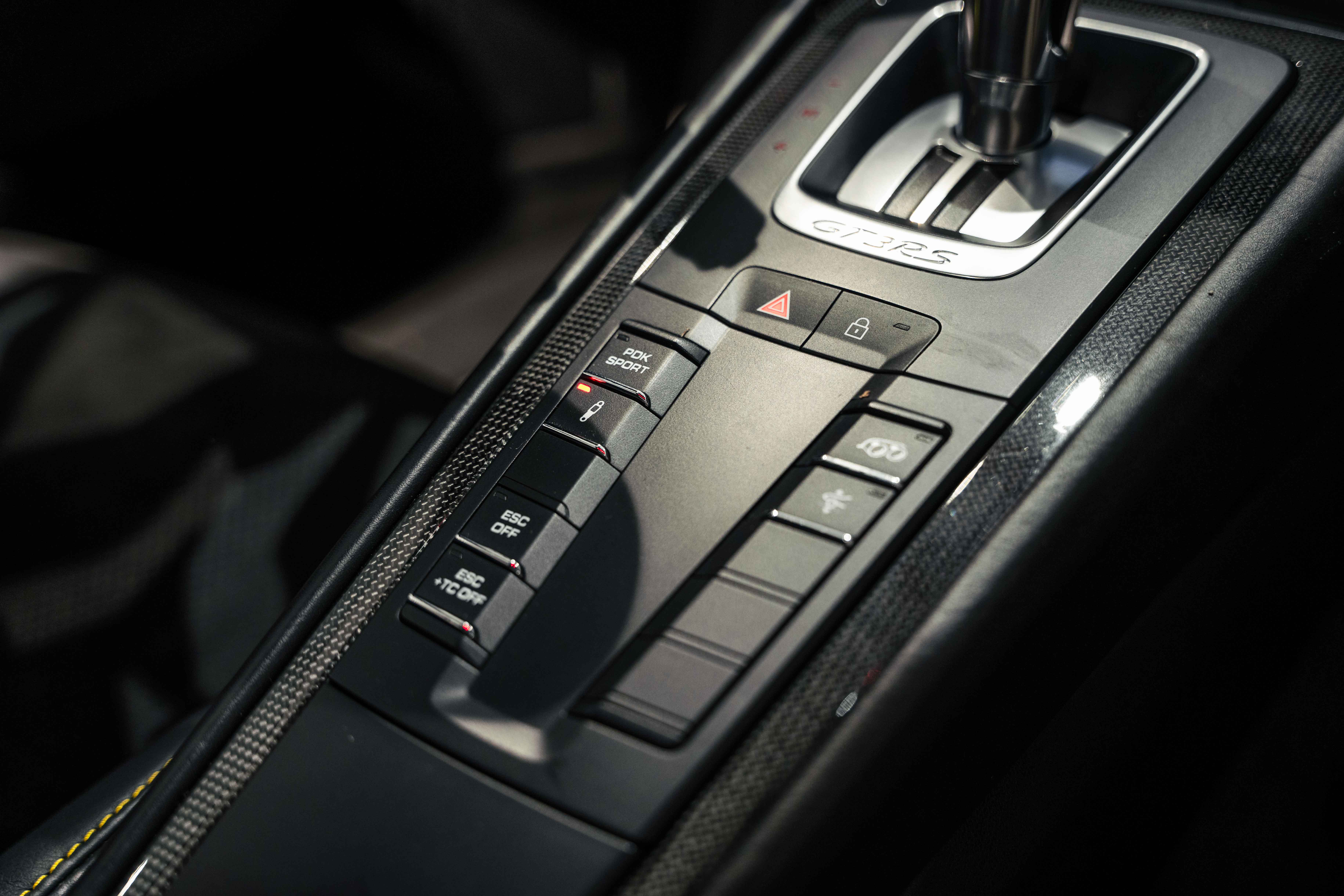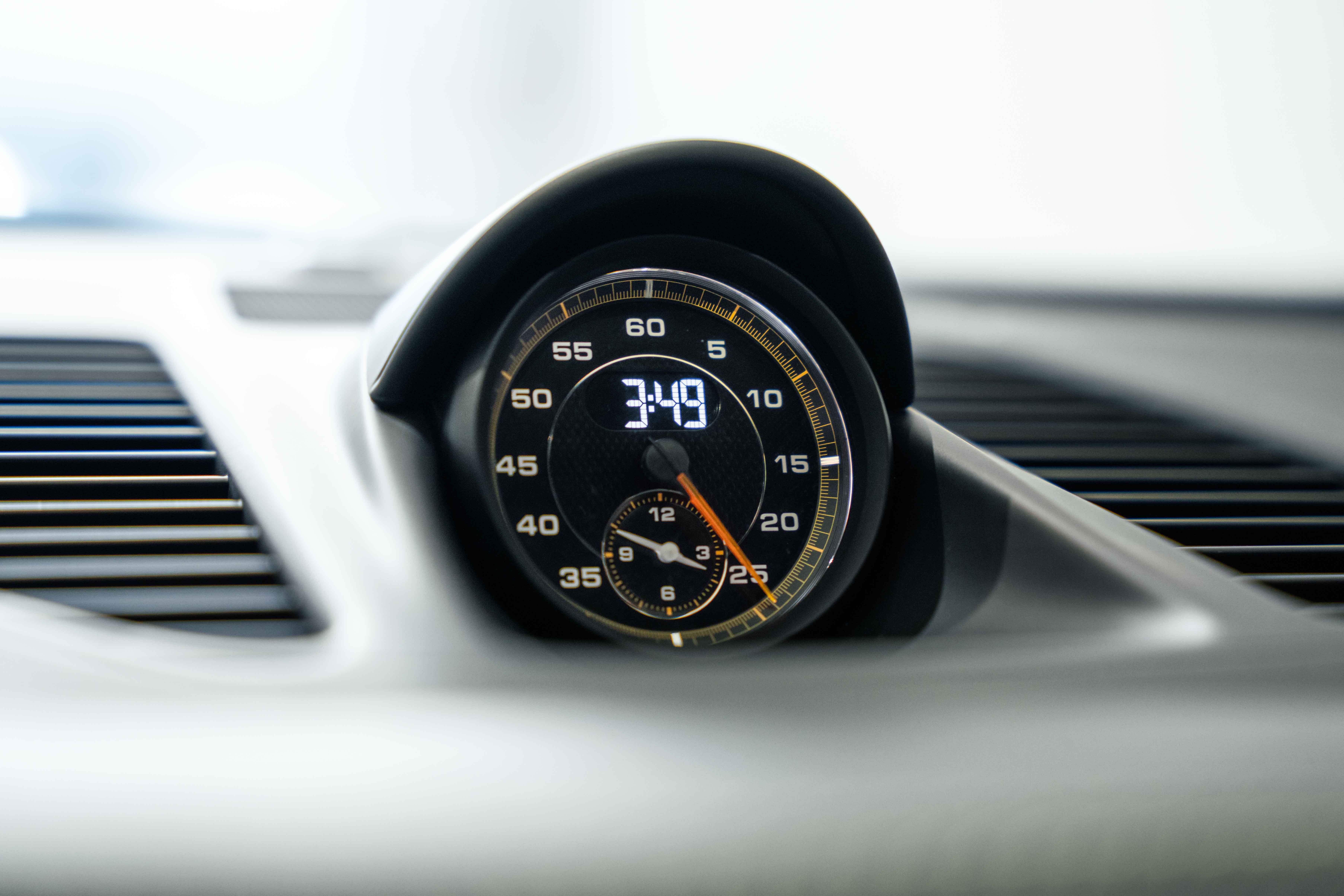 Inside, the cabin is wrapped in Black Leather/Alcantara, elevated by Racing Yellow deviated stitching and matching yellow seat belts for a subtle motorsport contrast. The carbon fiber door-sill guards (illuminated), aluminum pedals, and carbon triangle window trims further emphasize the GT3 RS’s lightweight performance ethos. The cockpit also features the Chrono Package with lap trigger prep, BOSE Surround Sound, and the Light Design Package, creating a space that is equally functional on the road and the circuit.