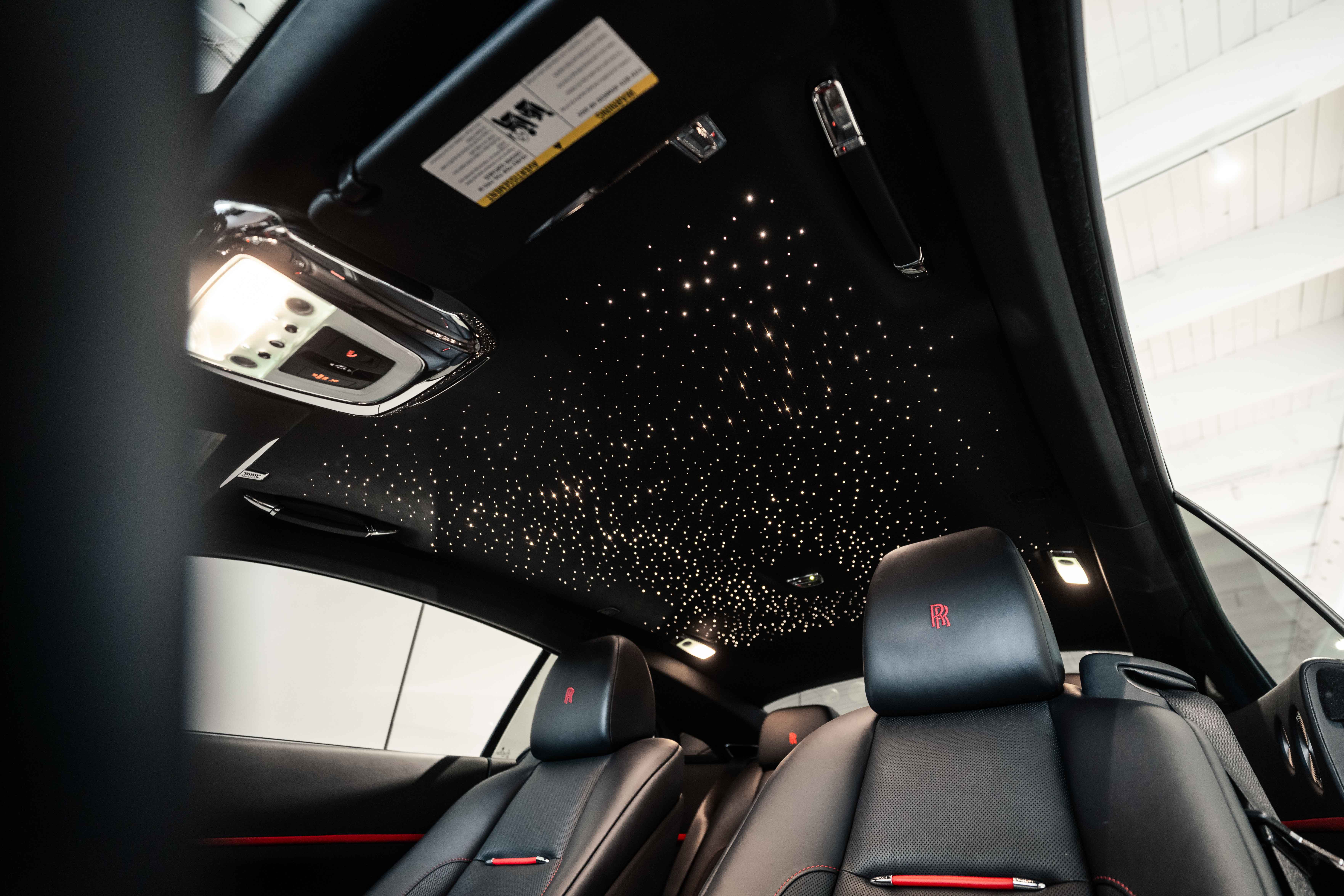 Inside, the cabin is a masterclass in Rolls-Royce craftsmanship. The interior is appointed with full natural grain leather, enhanced by contrast stitching, bespoke module editing, and unique detailing throughout. Elements such as seat piping, contrast door features, and a stitched instrument panel create a rich, layered environment that feels entirely bespoke. The Black Badge treadplates, lambswool floor mats, and RR monograms on all headrests reinforce the car’s identity as a curated, high-specification example.