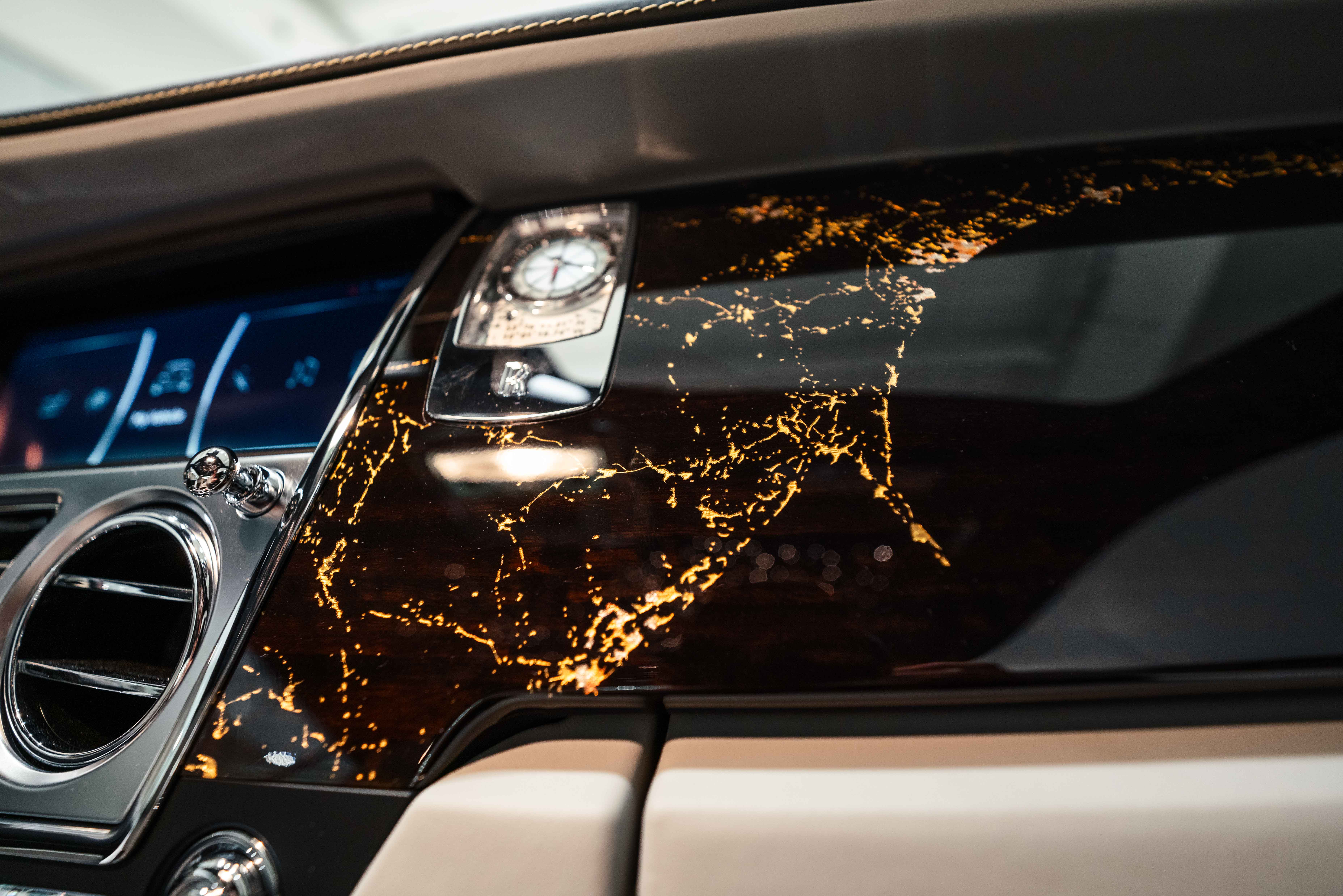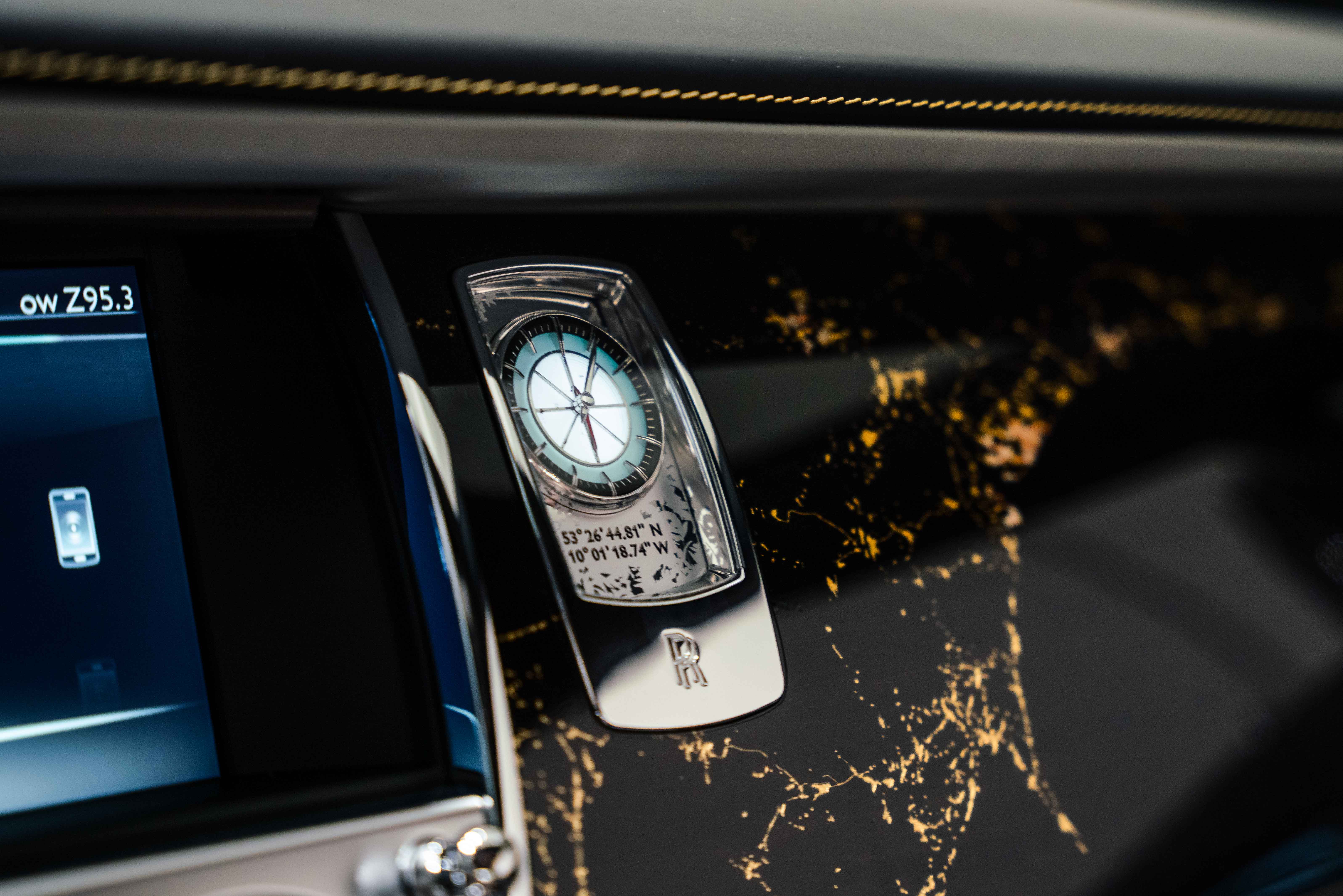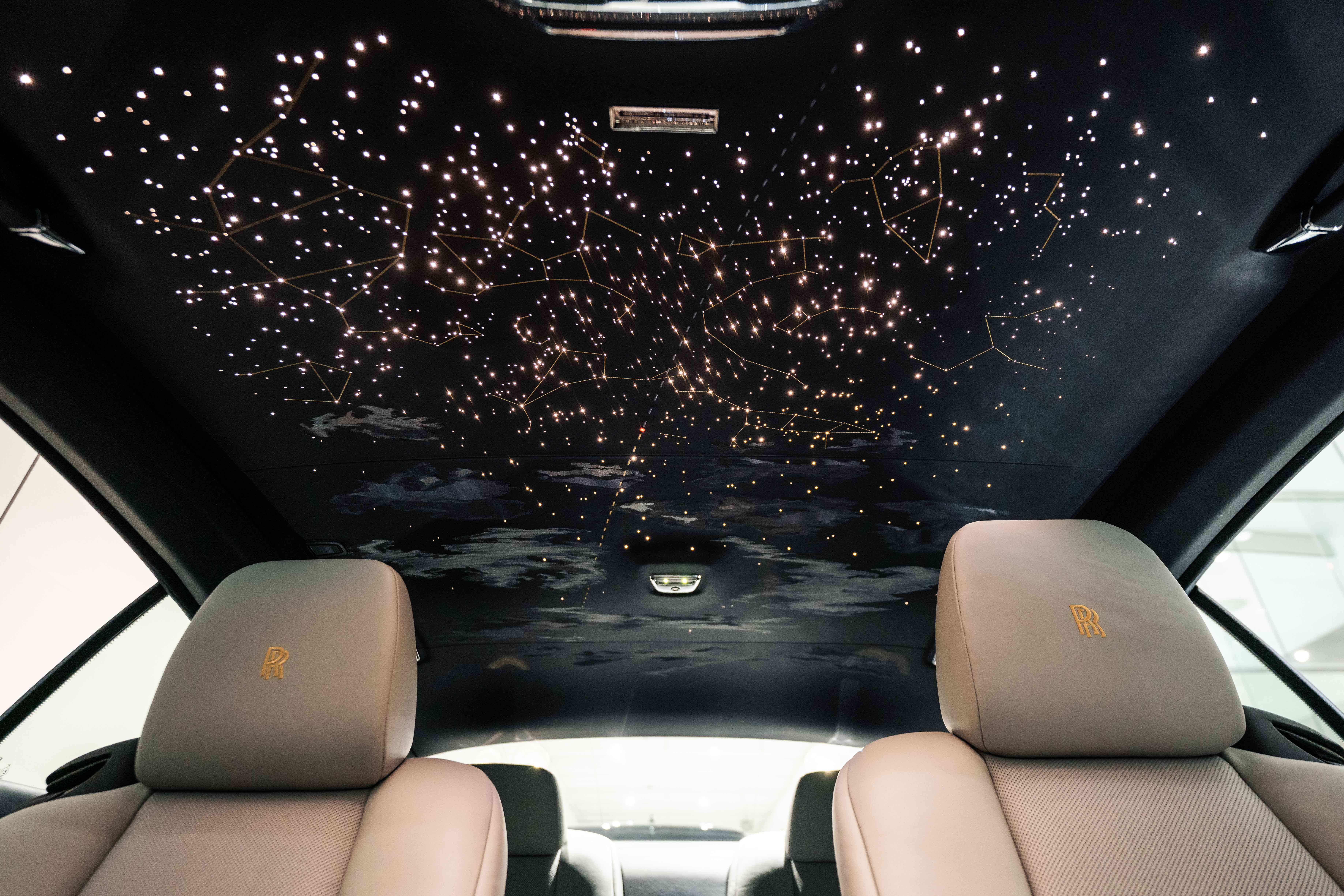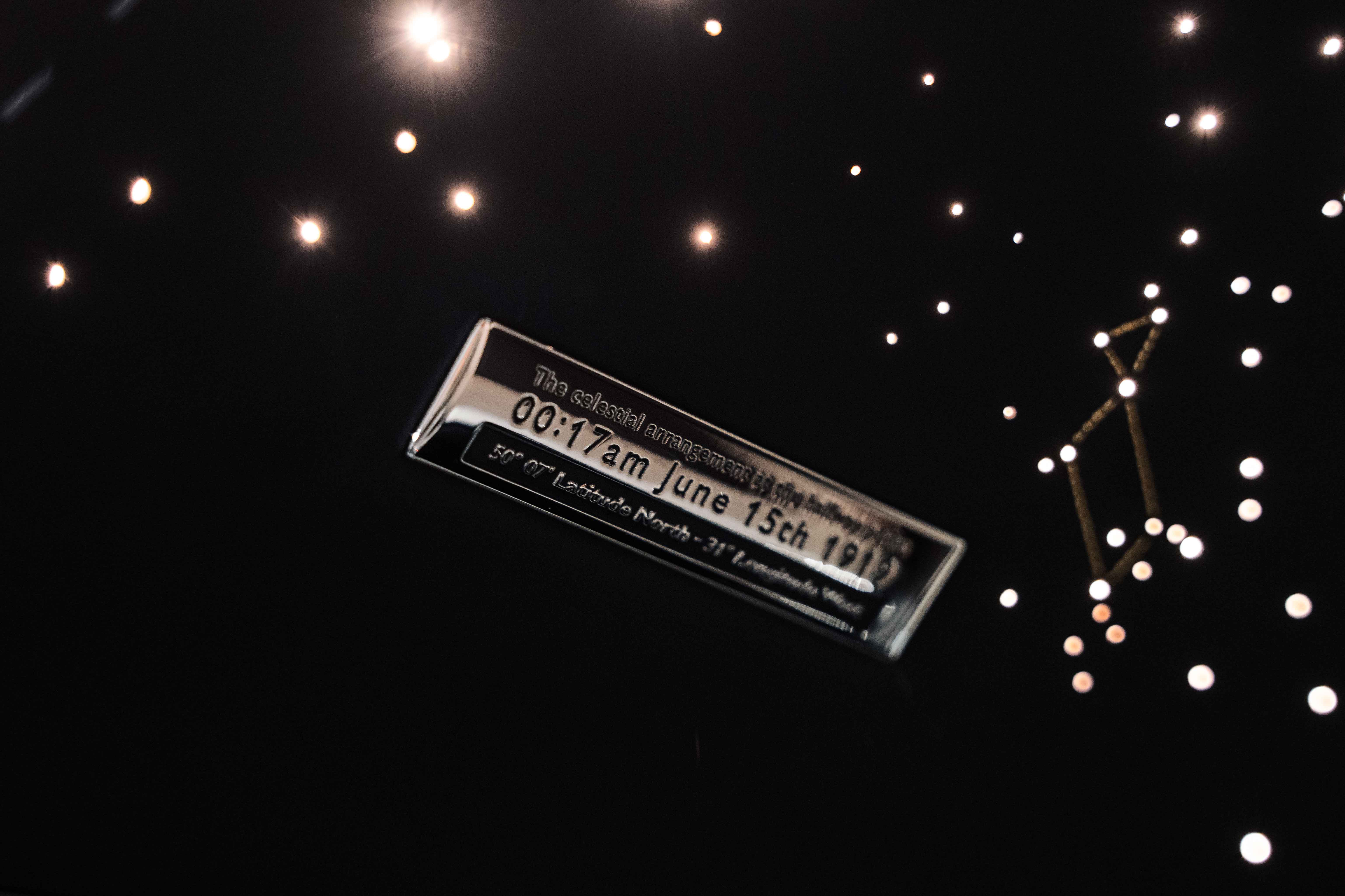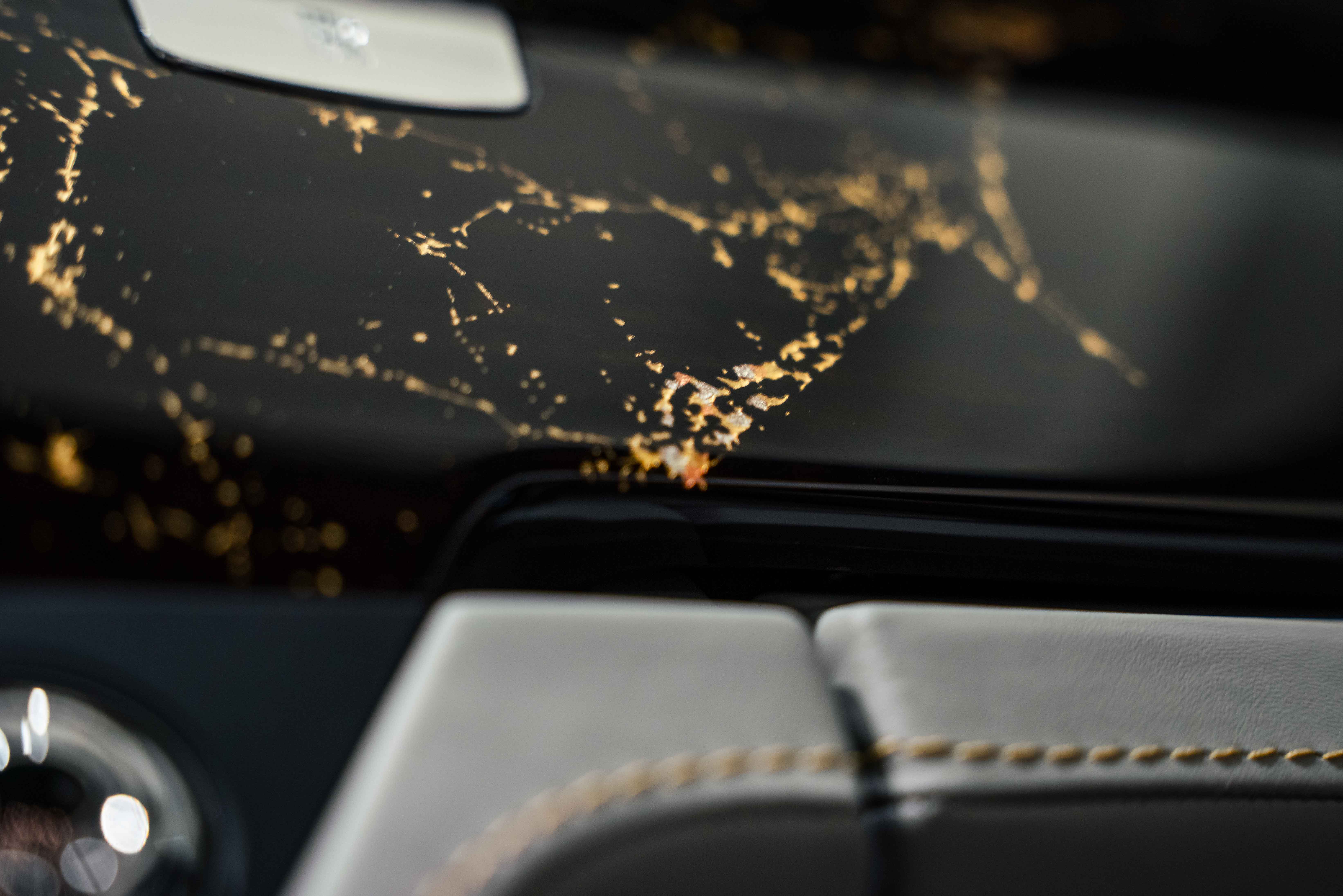 Inside, the cabin is a masterclass in storytelling through craftsmanship. The illuminated fascia artwork depicts the exact transatlantic flight path from Newfoundland to Ireland, glowing softly across the dashboard as a reminder of human ambition and technical excellence. The Starlight Headliner features a unique celestial configuration recreating the night sky as it appeared during the historic flight—an extraordinary detail that transforms the interior into a moving time capsule.