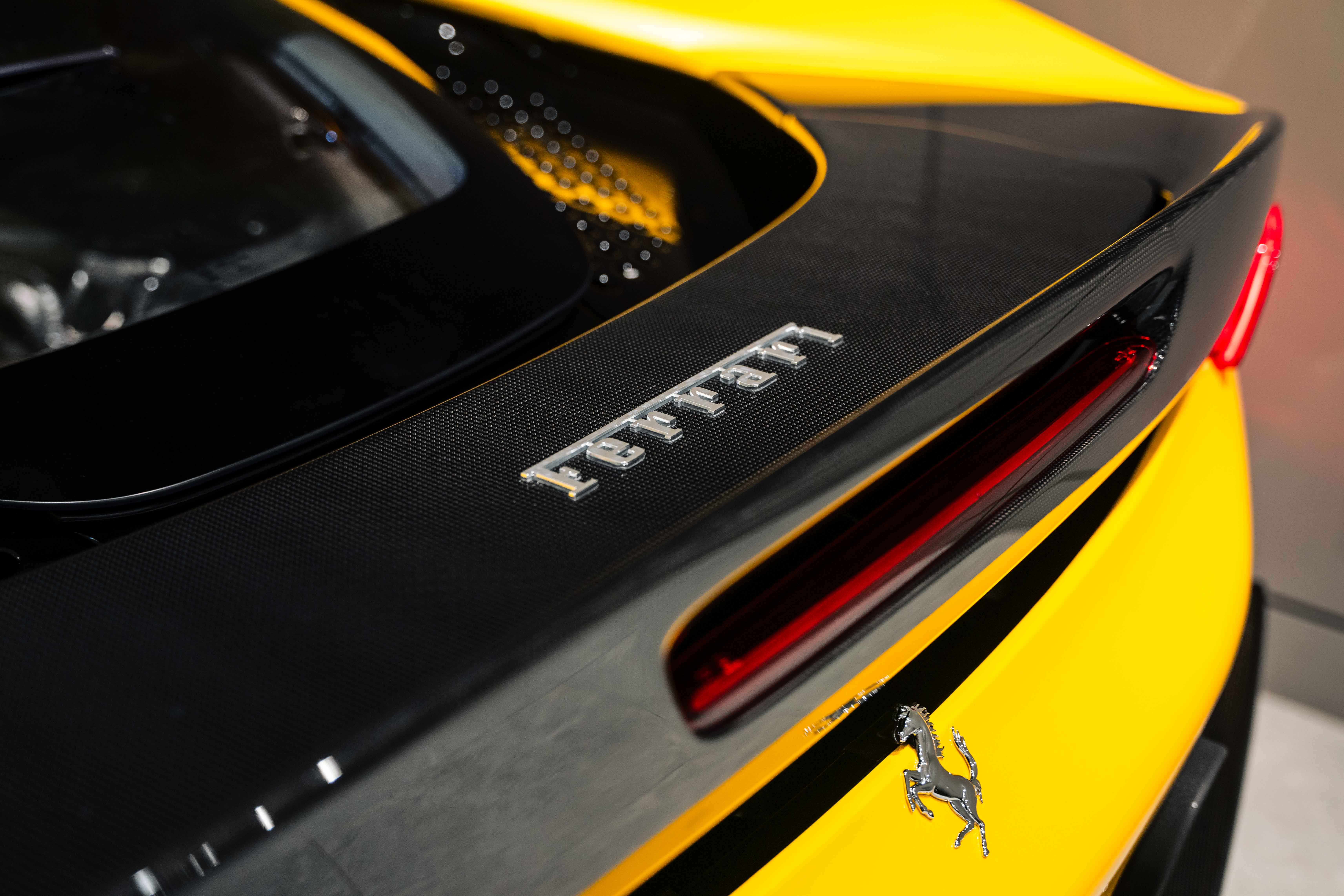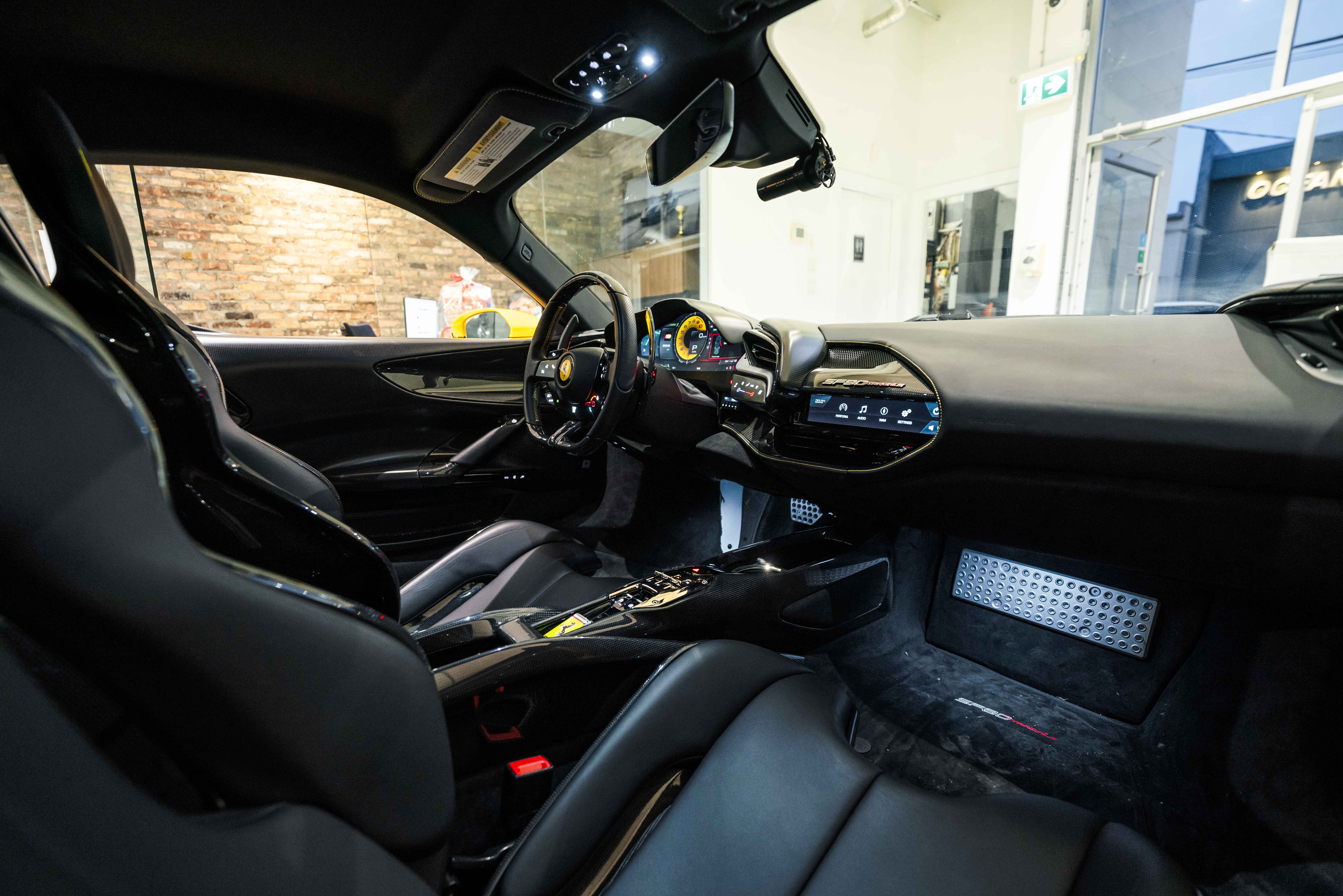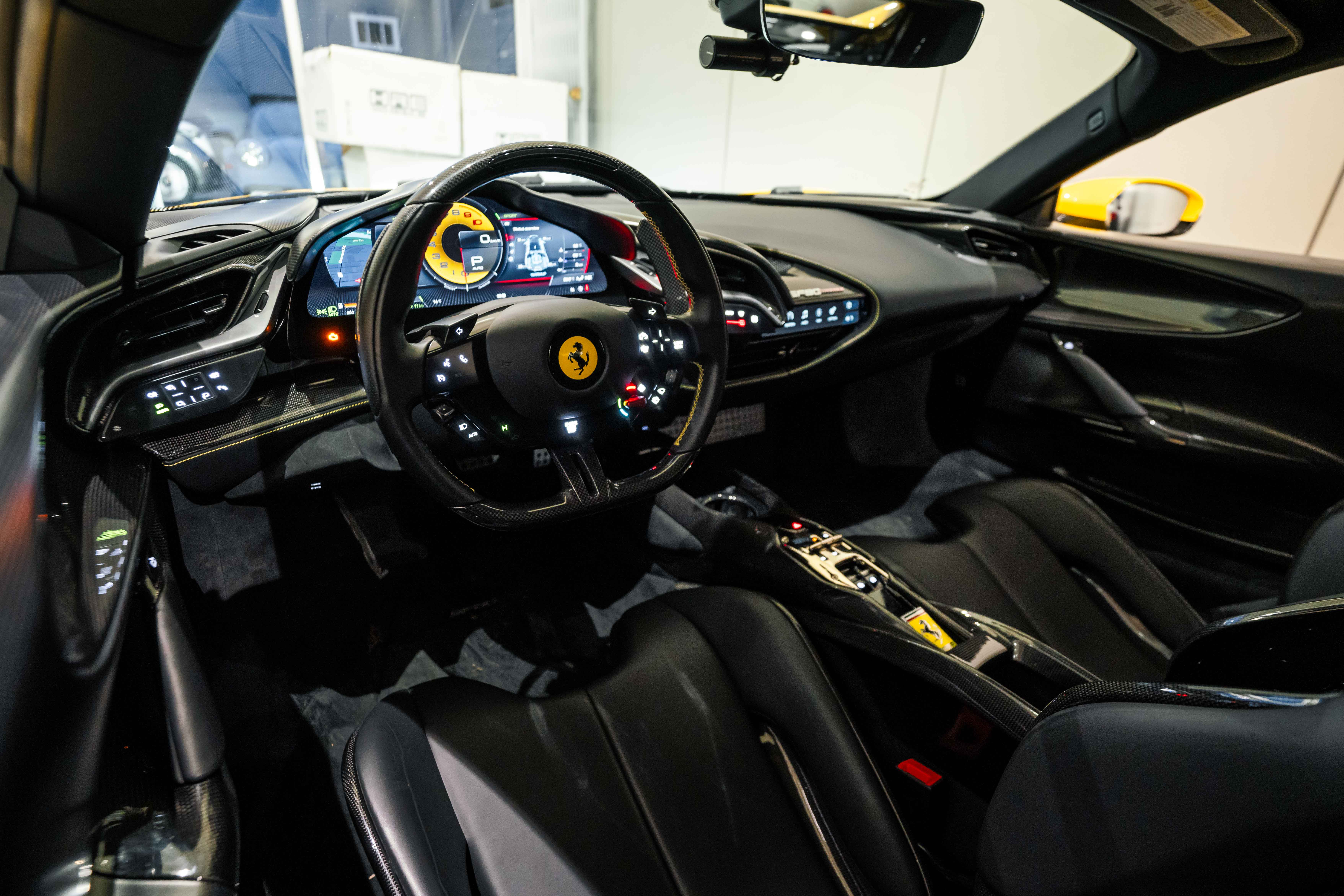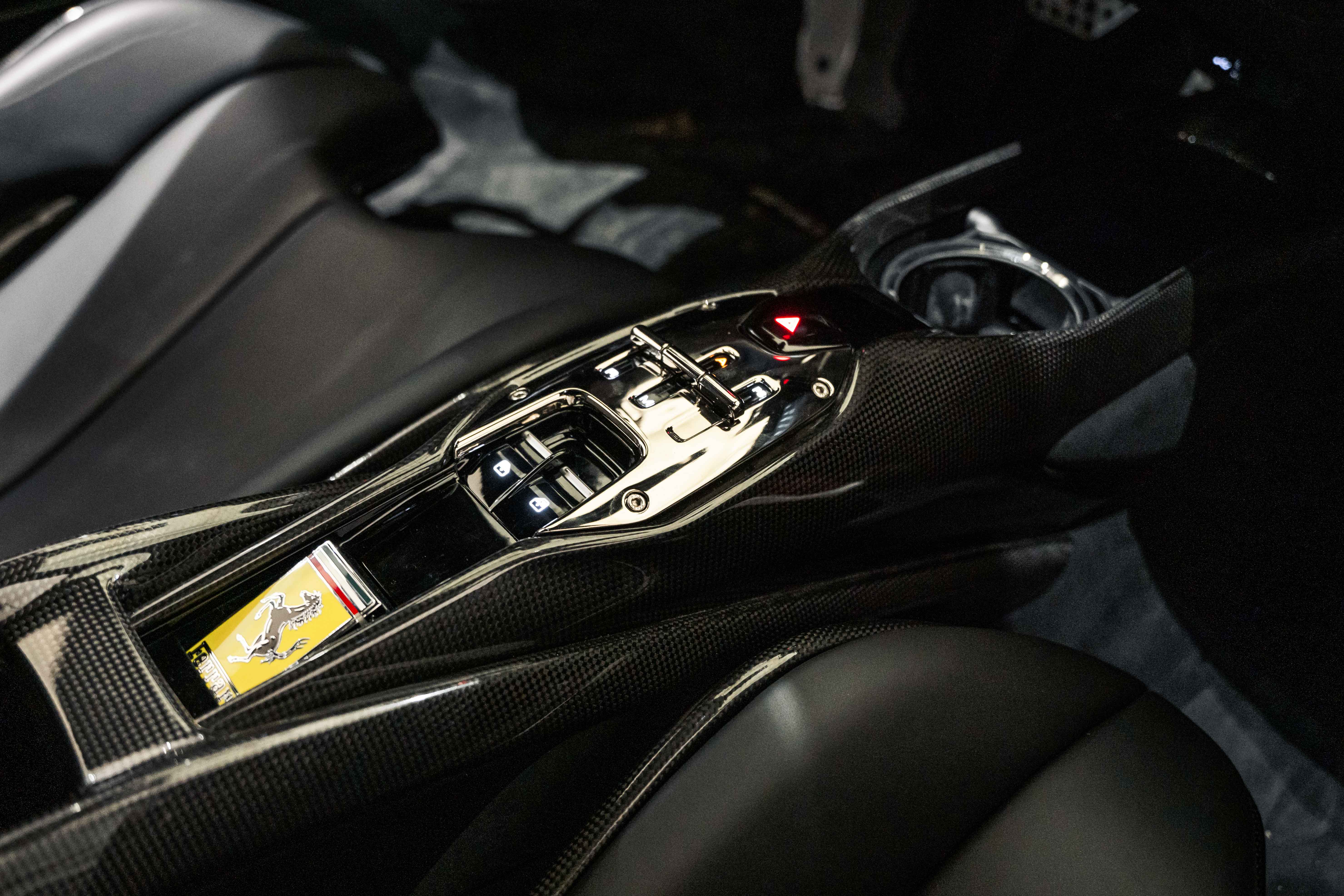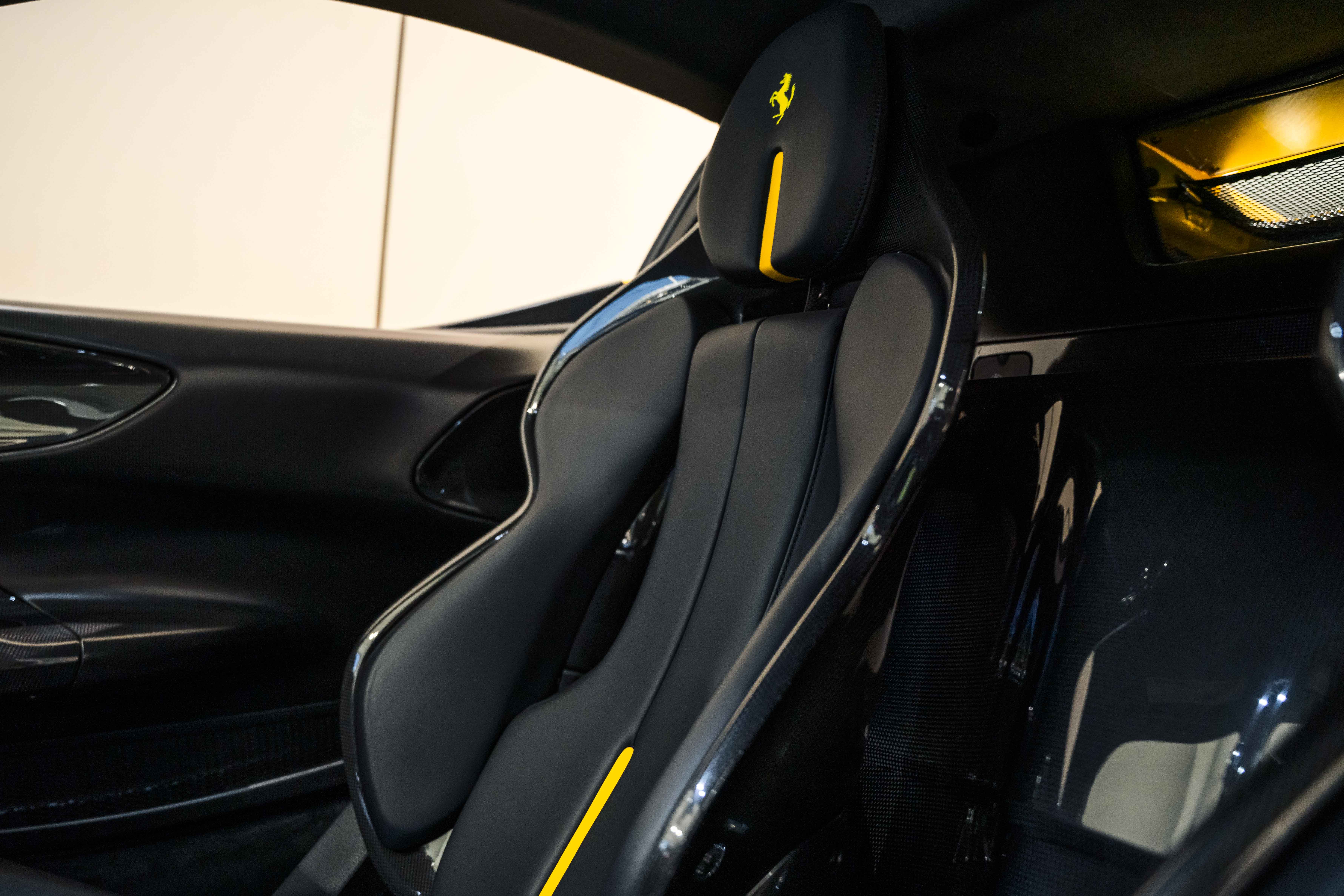 The interior continues this theme with an exceptional level of carbon fiber craftsmanship. Highlights include the carbon fibre driver zone with LEDs, instrument cover, upper centre console trim, door panels, rear shelf, dash inserts, and front luggage compartment area. Large-size carbon fibre racing seats with lifter are finished in Extra-Range Giallo leather, accented by Giallo stitching and embroidered Cavallino headrests, creating a cockpit that is both technical and unmistakably Ferrari. Additional bespoke touches include leather/Alcantara mats, coloured inner details, and special stitching throughout.