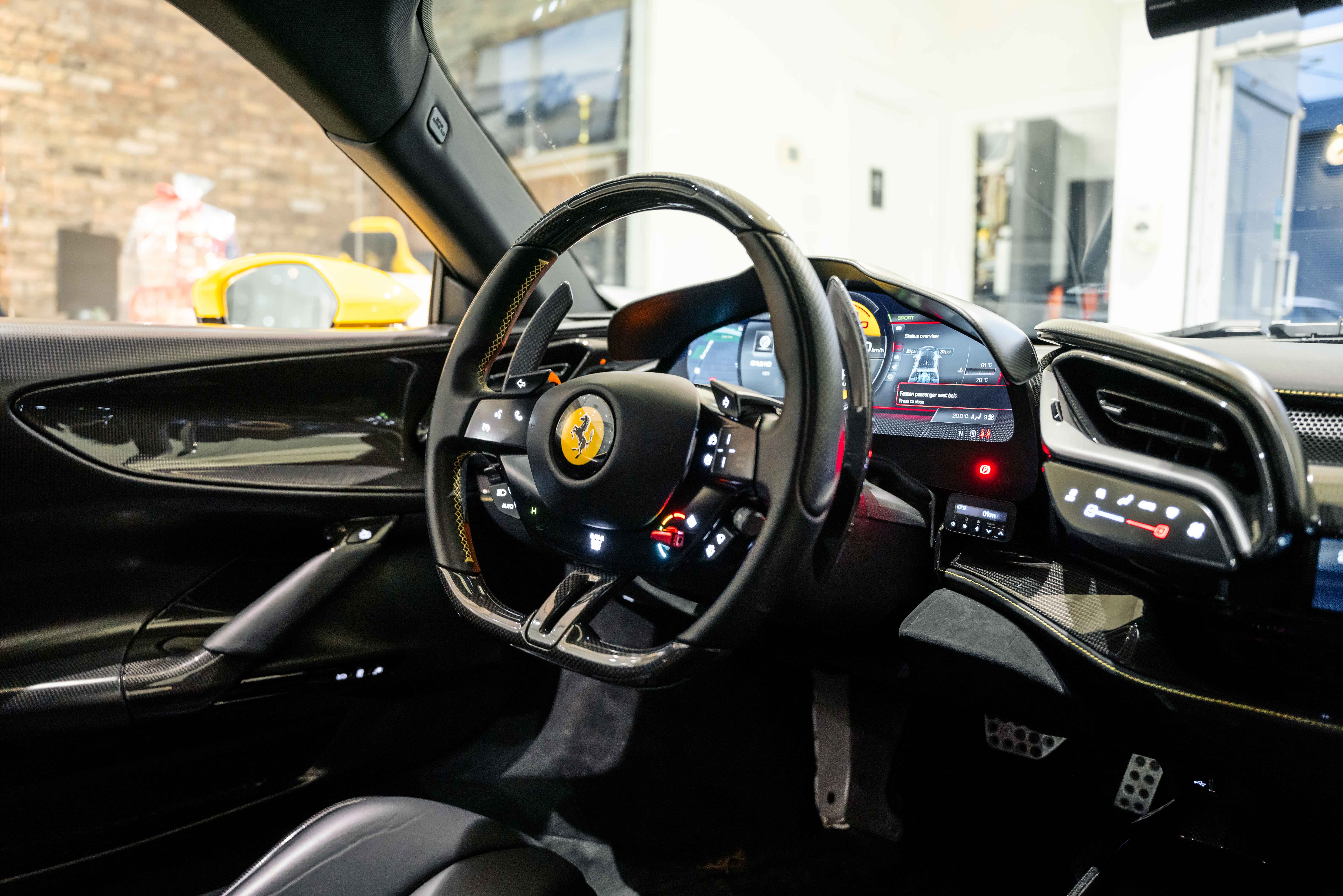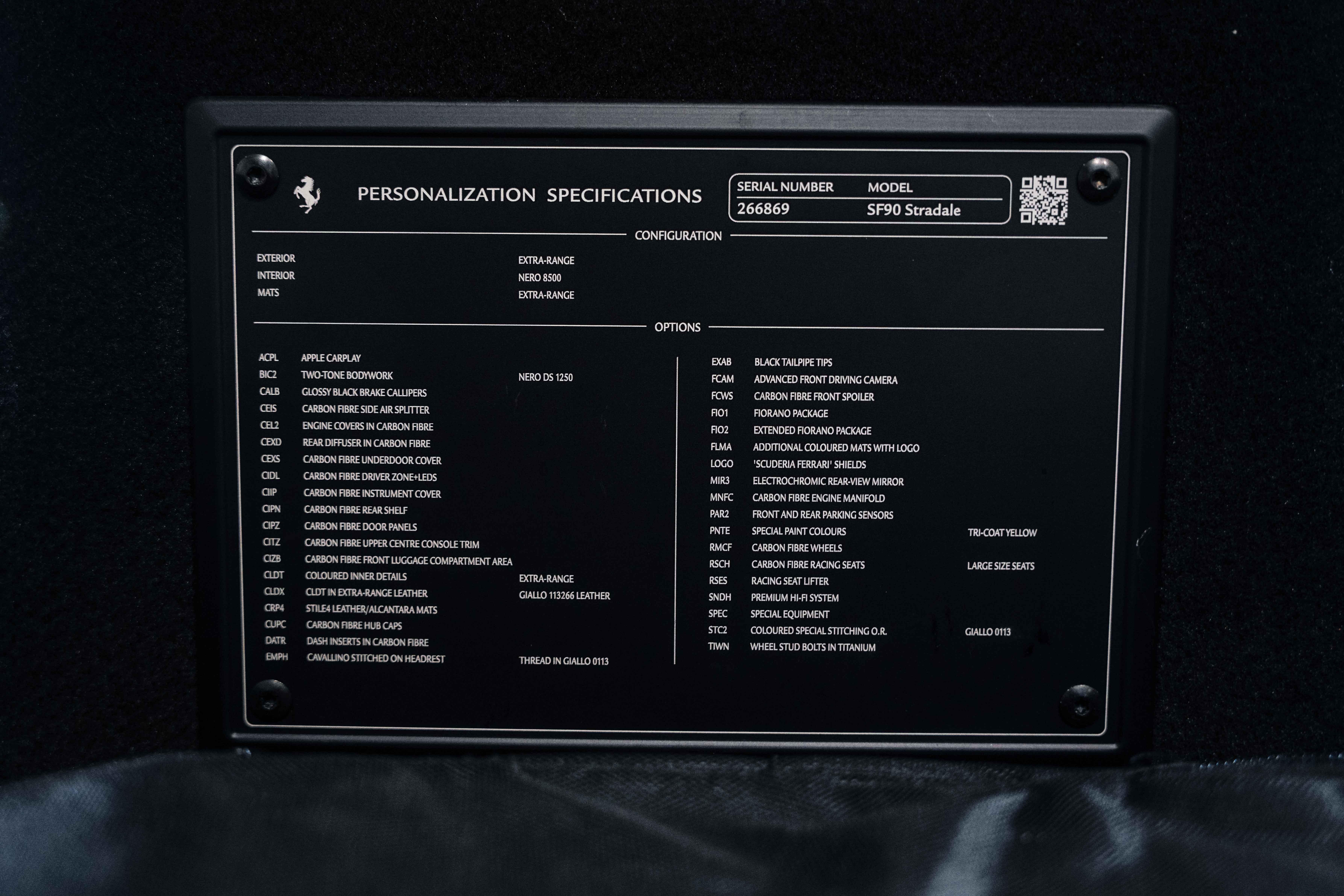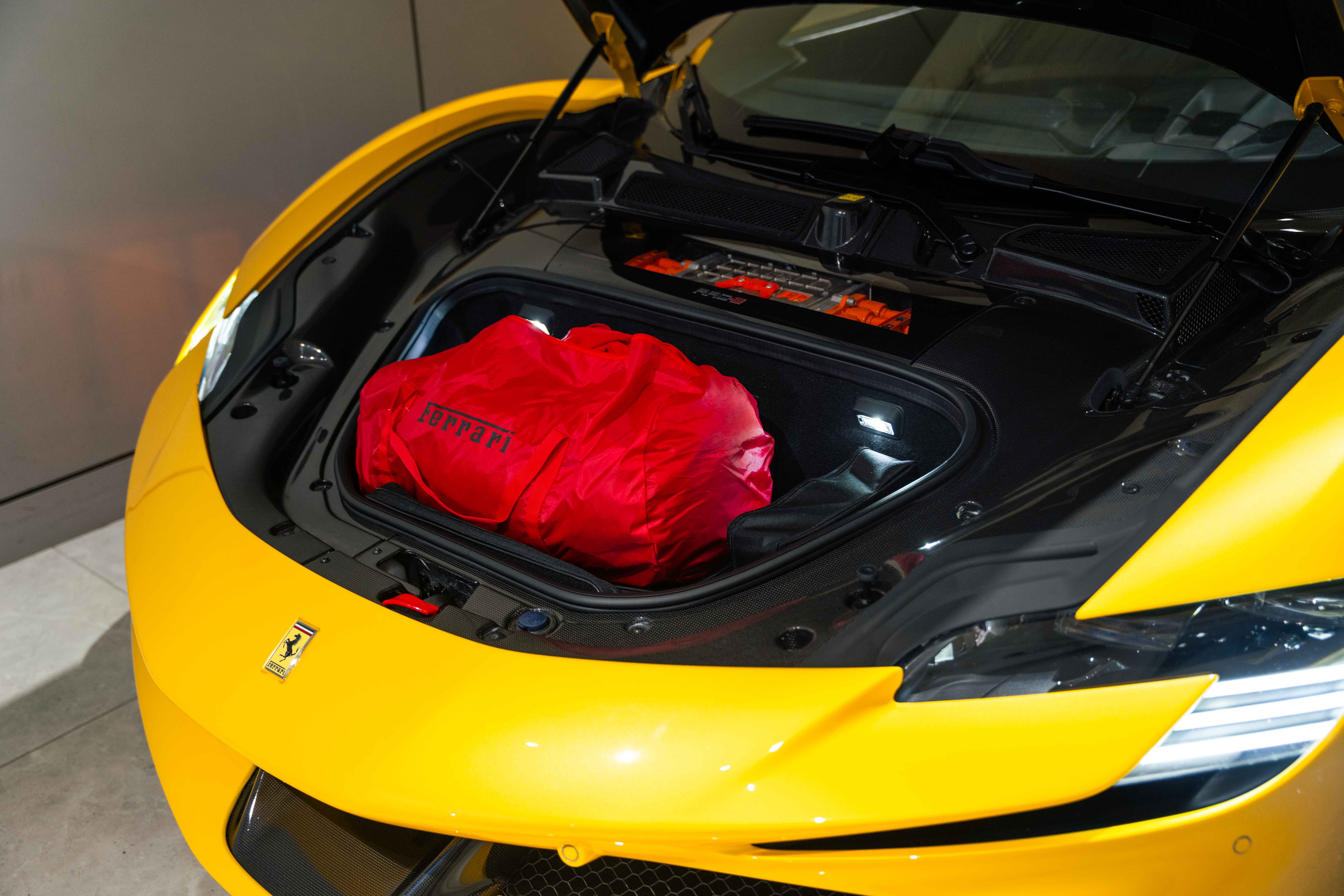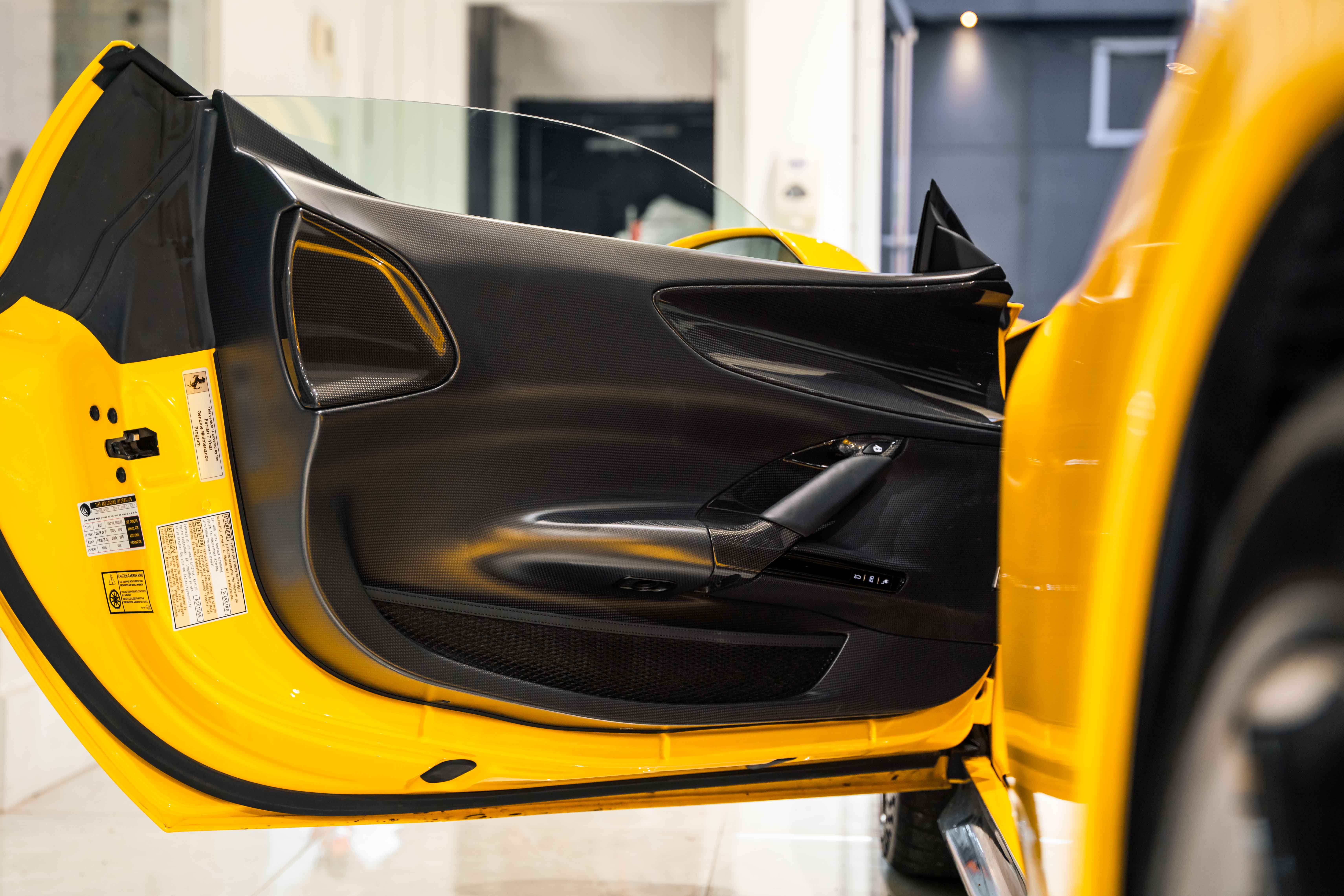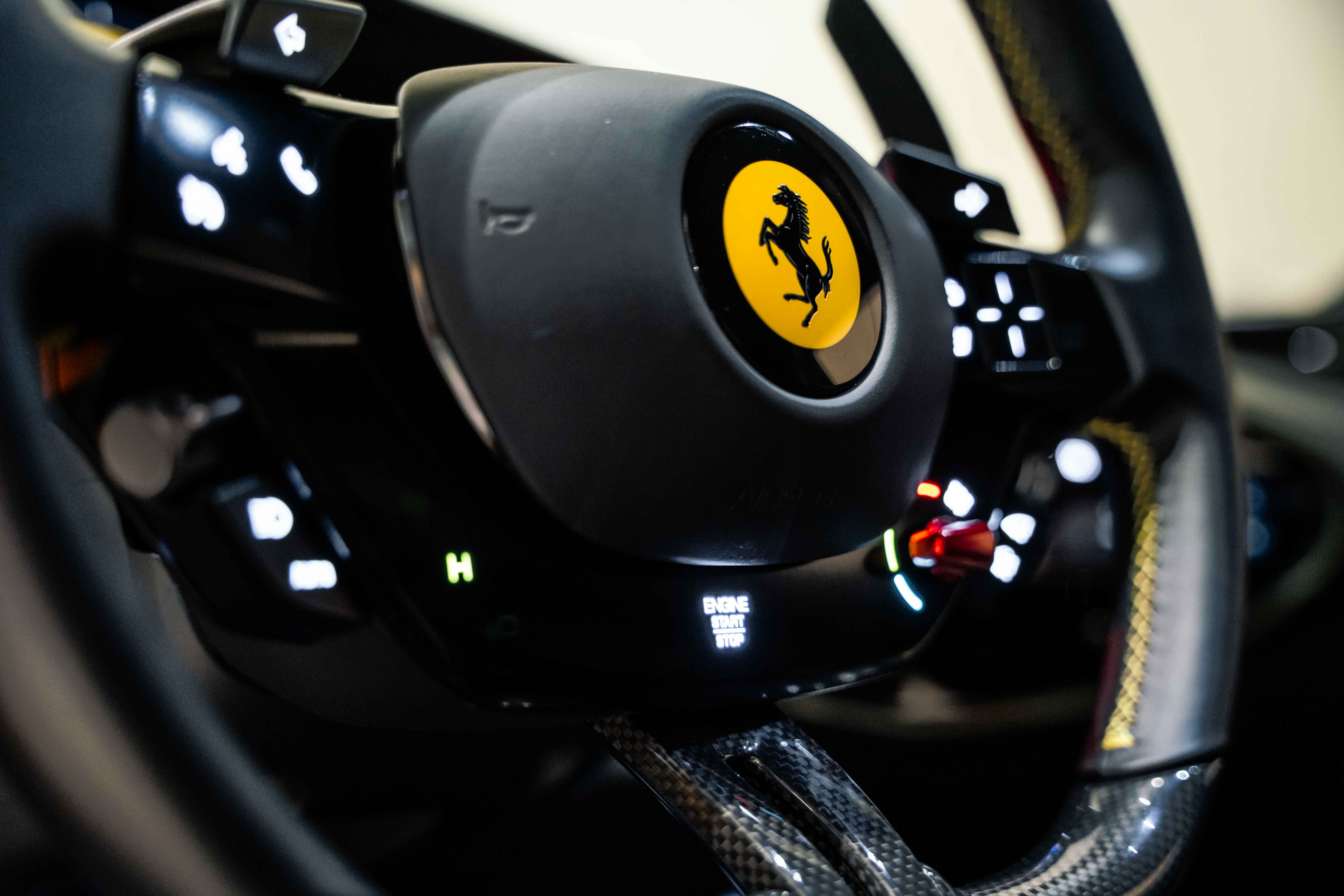 The interior continues this theme with an exceptional level of carbon fiber craftsmanship. Highlights include the carbon fibre driver zone with LEDs, instrument cover, upper centre console trim, door panels, rear shelf, dash inserts, and front luggage compartment area. Large-size carbon fibre racing seats with lifter are finished in Extra-Range Giallo leather, accented by Giallo stitching and embroidered Cavallino headrests, creating a cockpit that is both technical and unmistakably Ferrari. Additional bespoke touches include leather/Alcantara mats, coloured inner details, and special stitching throughout.