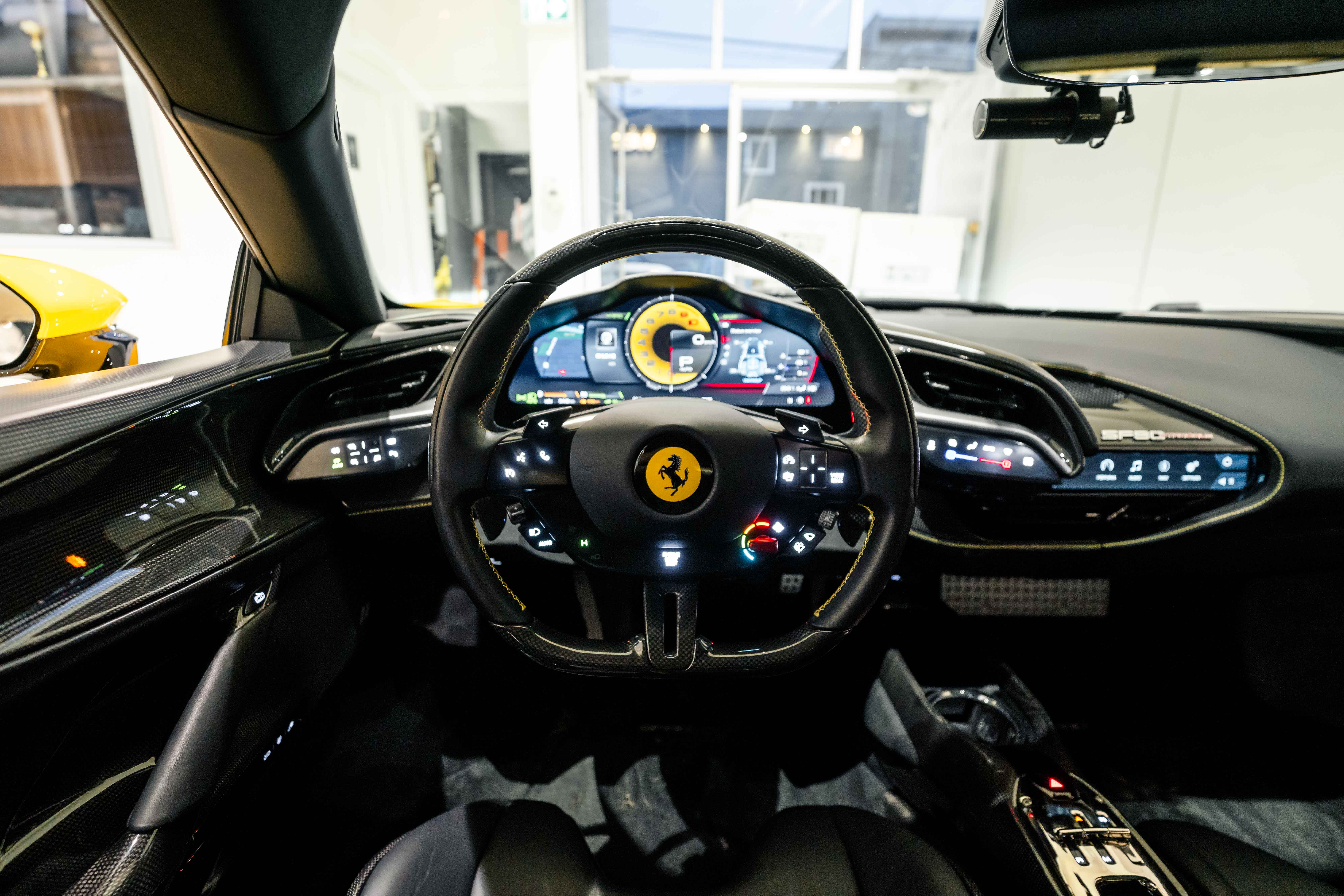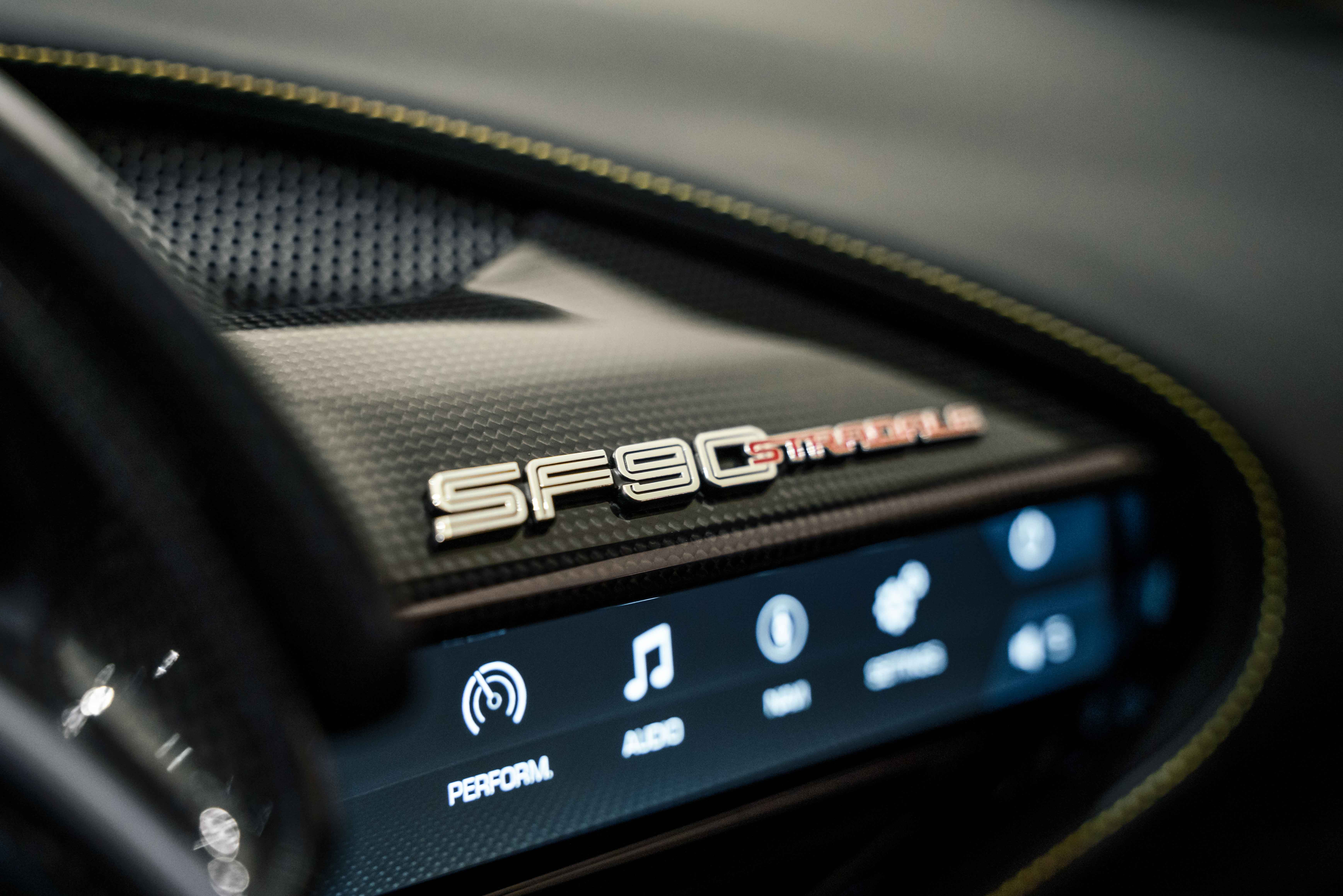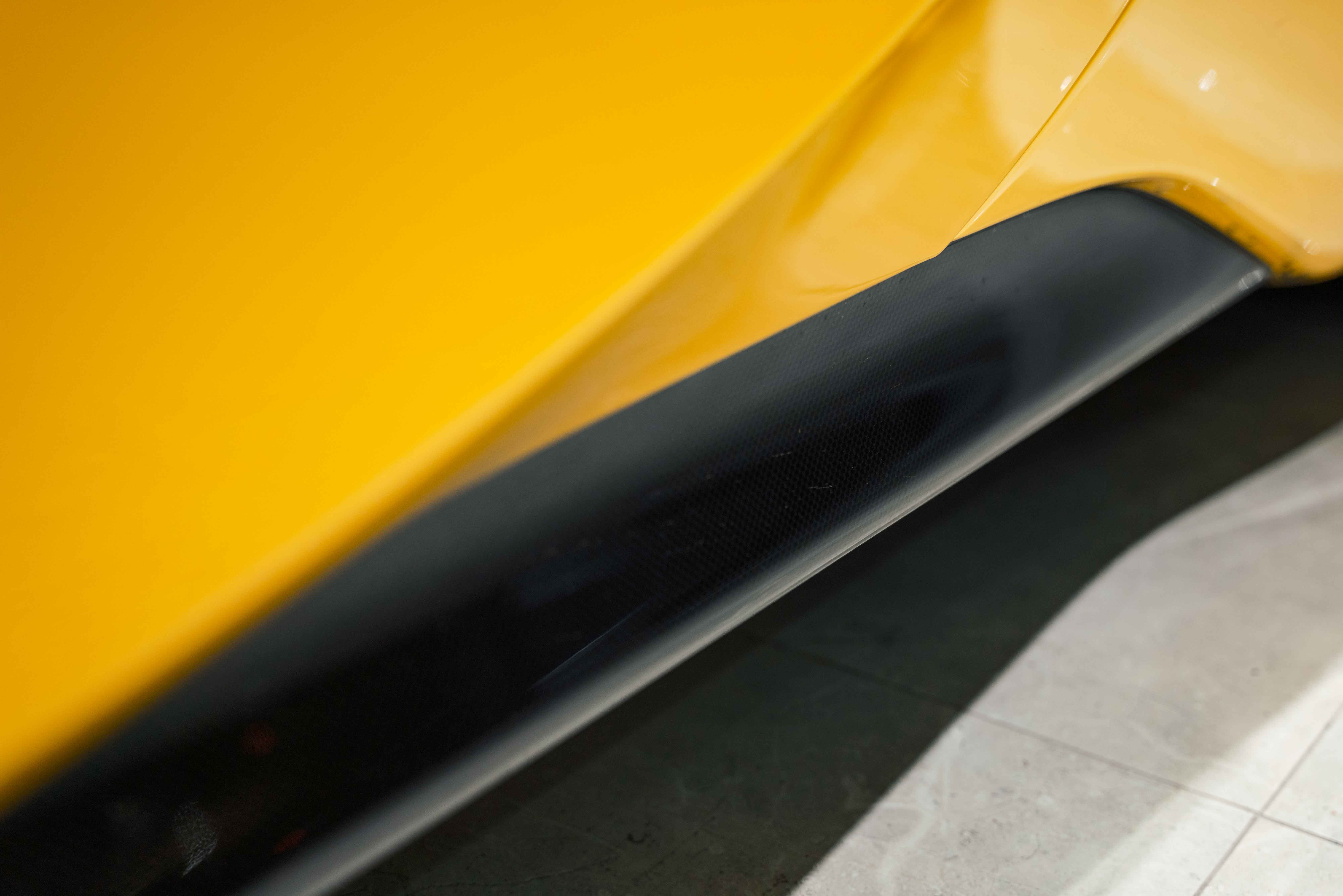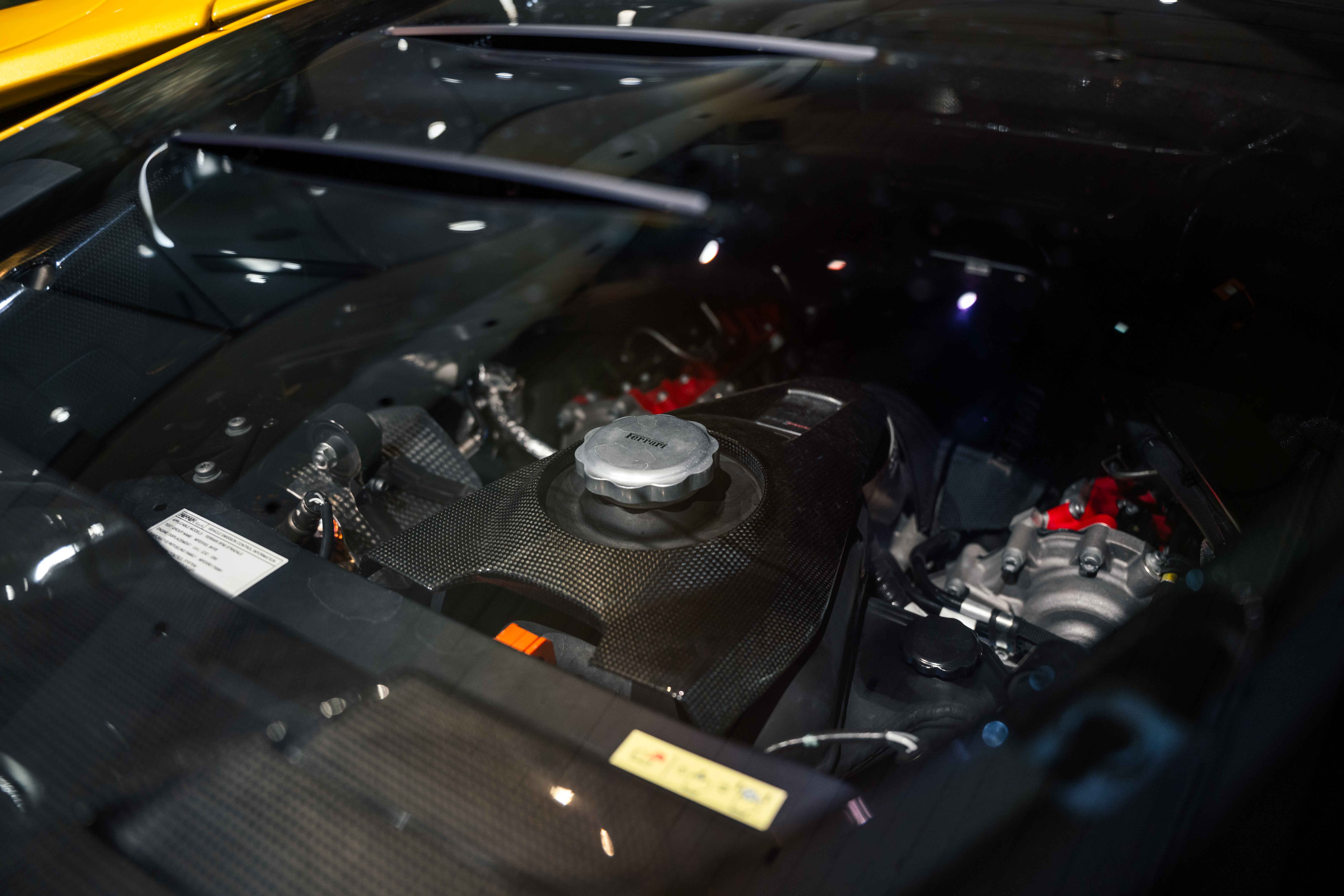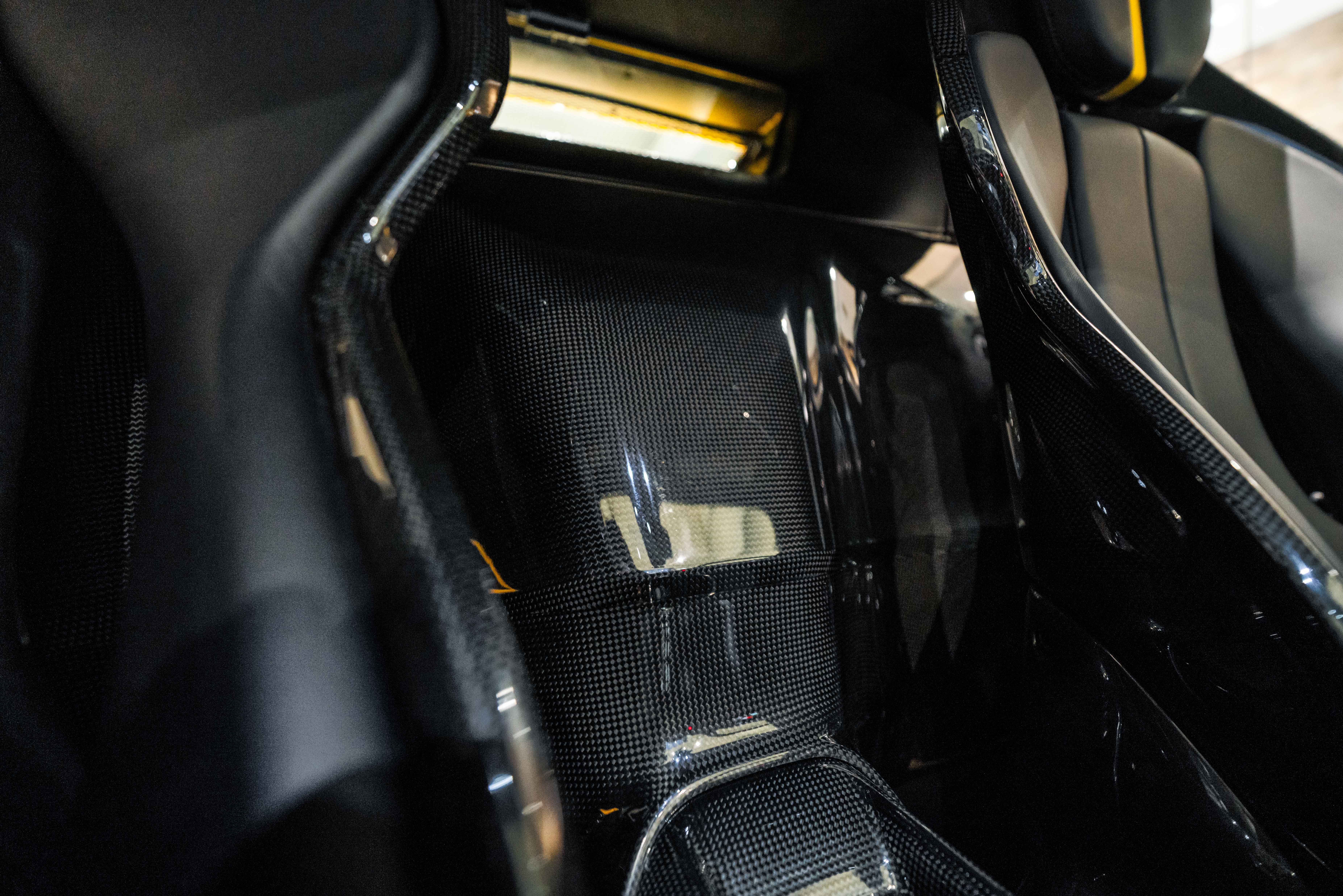 The interior continues this theme with an exceptional level of carbon fiber craftsmanship. Highlights include the carbon fibre driver zone with LEDs, instrument cover, upper centre console trim, door panels, rear shelf, dash inserts, and front luggage compartment area. Large-size carbon fibre racing seats with lifter are finished in Extra-Range Giallo leather, accented by Giallo stitching and embroidered Cavallino headrests, creating a cockpit that is both technical and unmistakably Ferrari. Additional bespoke touches include leather/Alcantara mats, coloured inner details, and special stitching throughout.