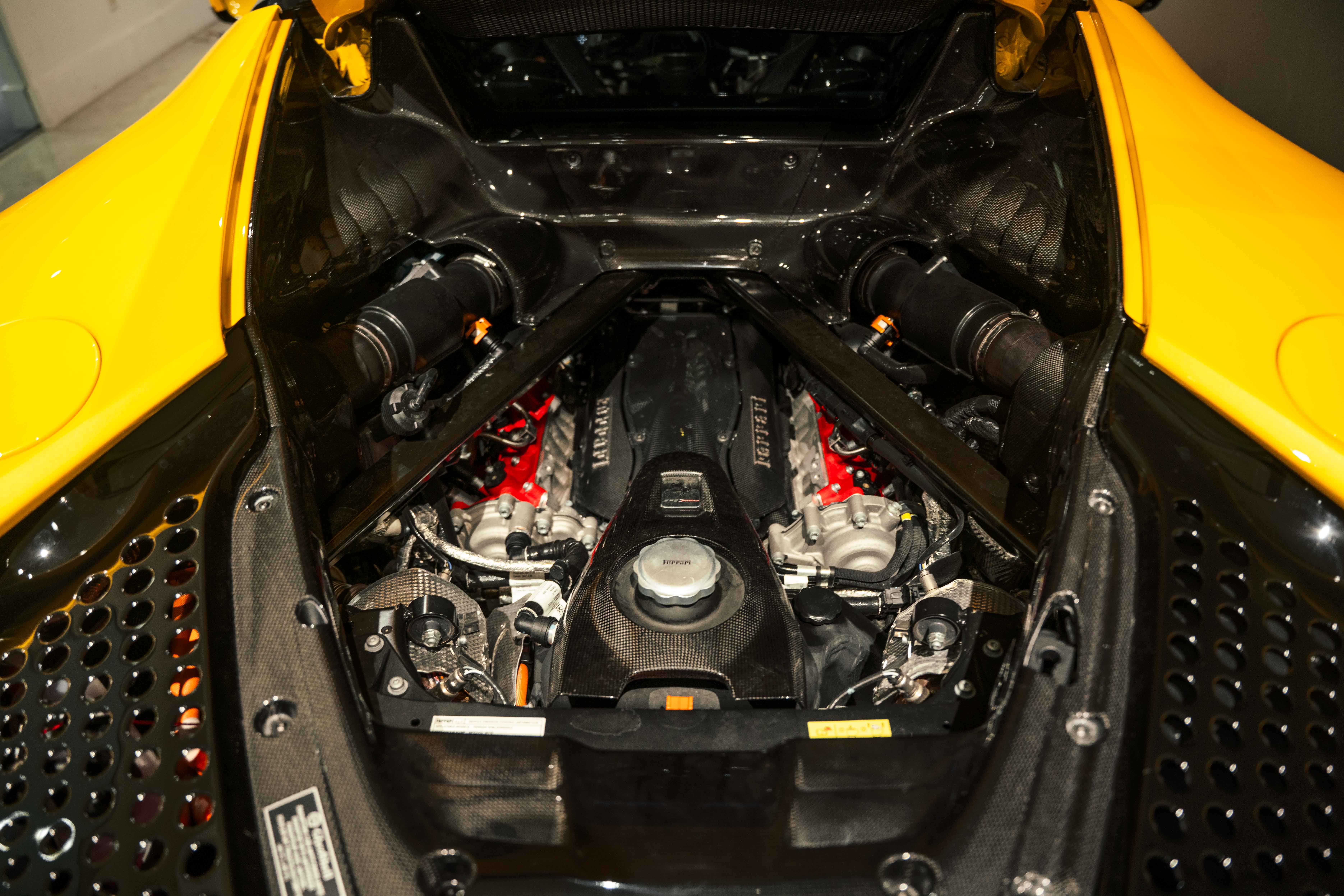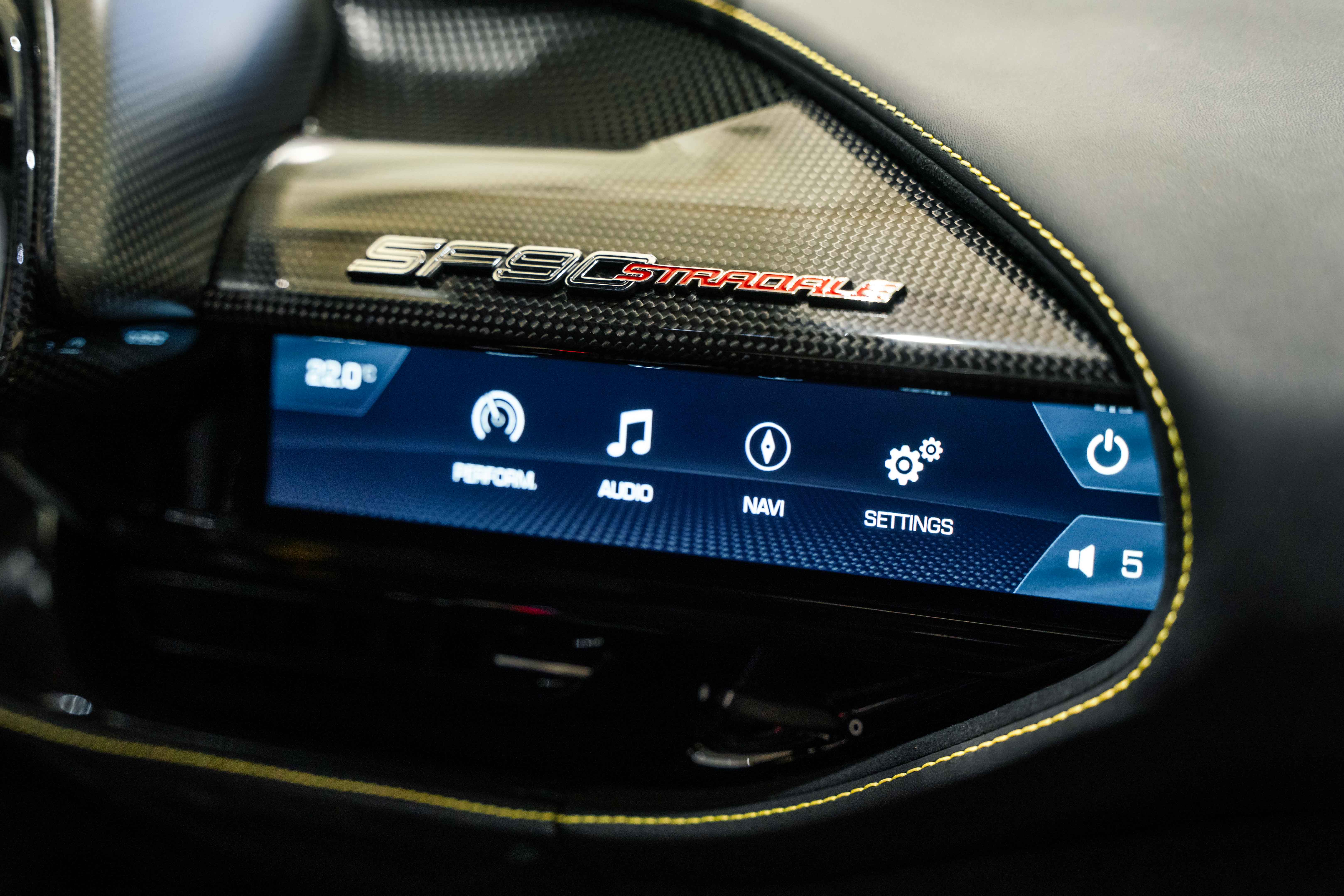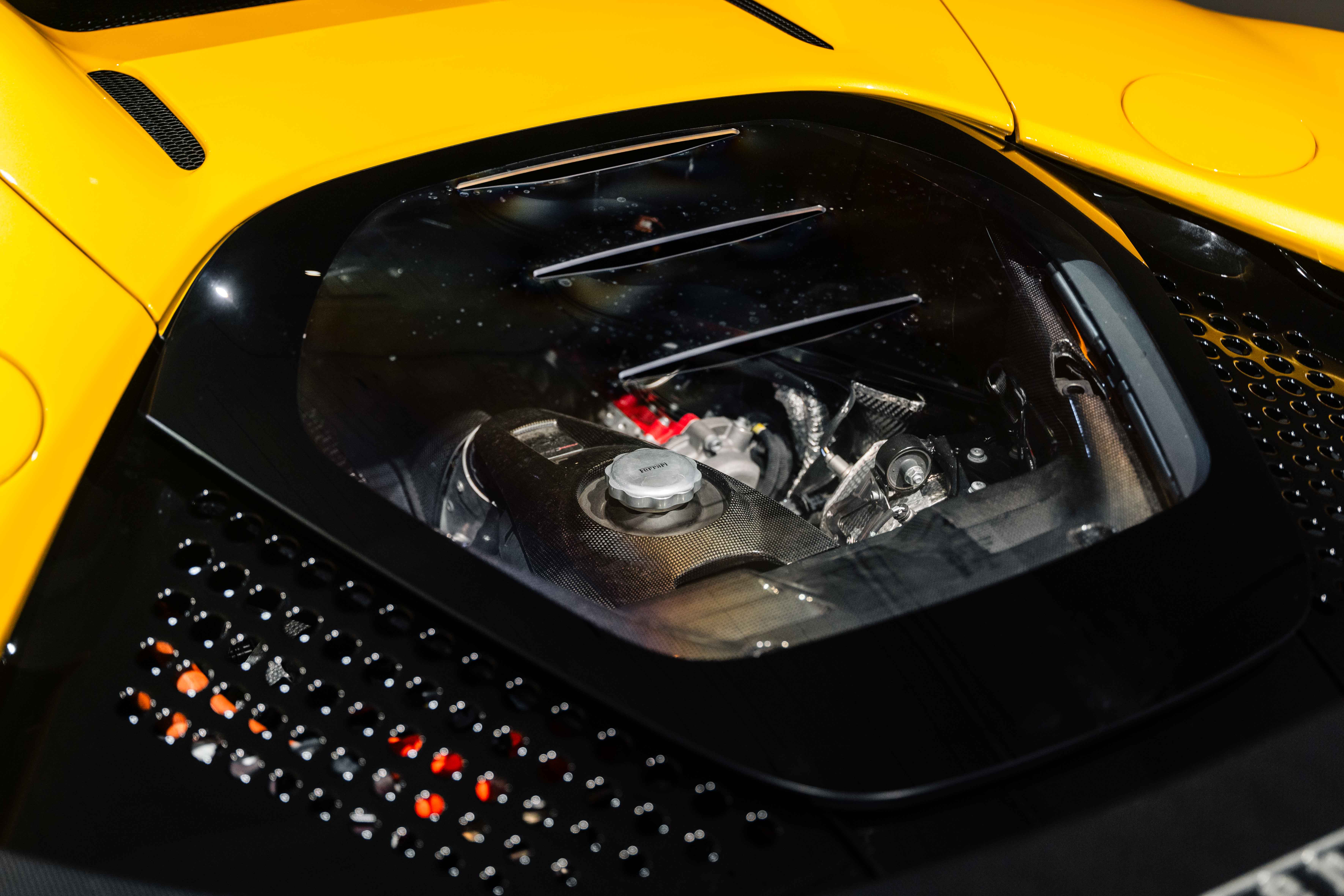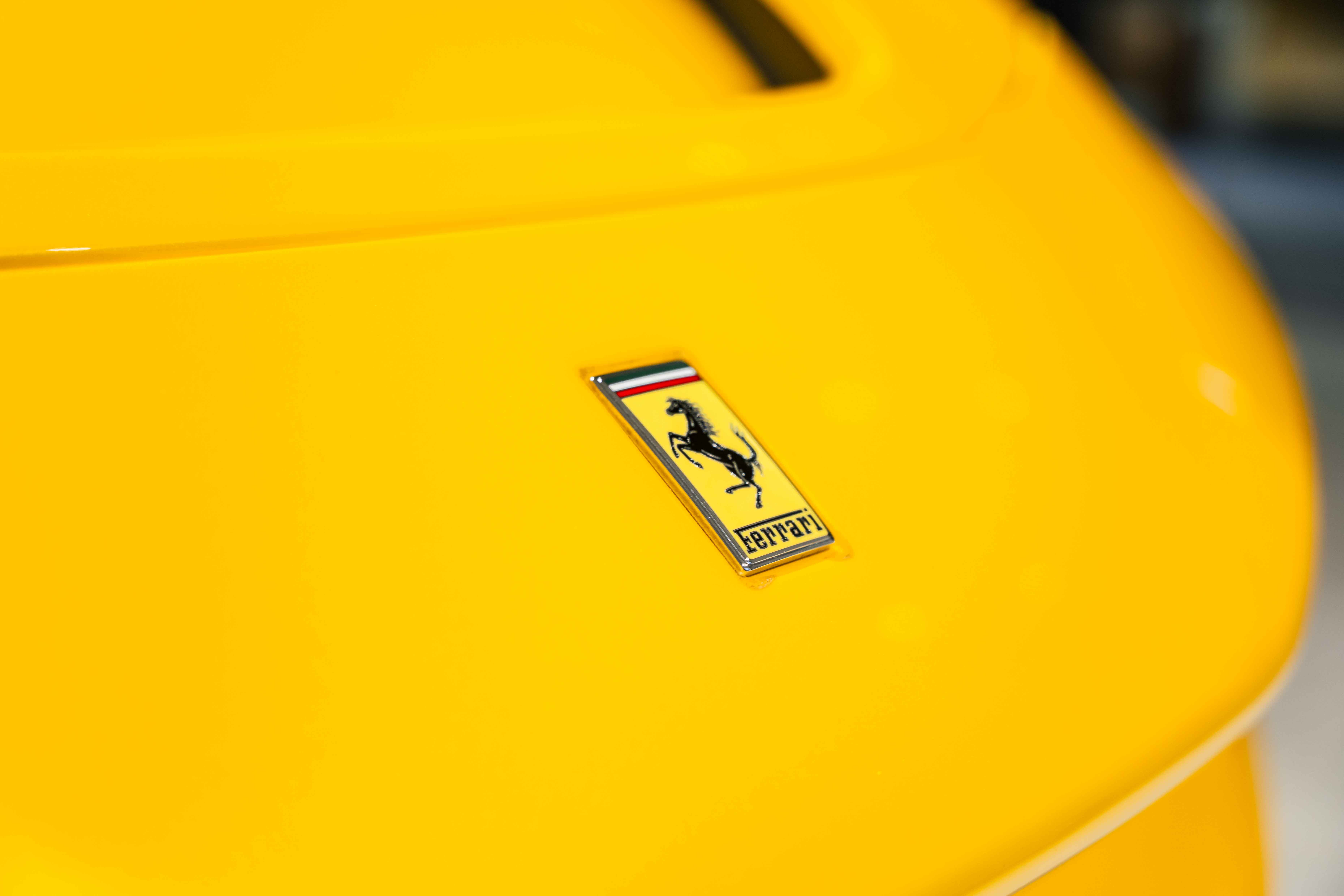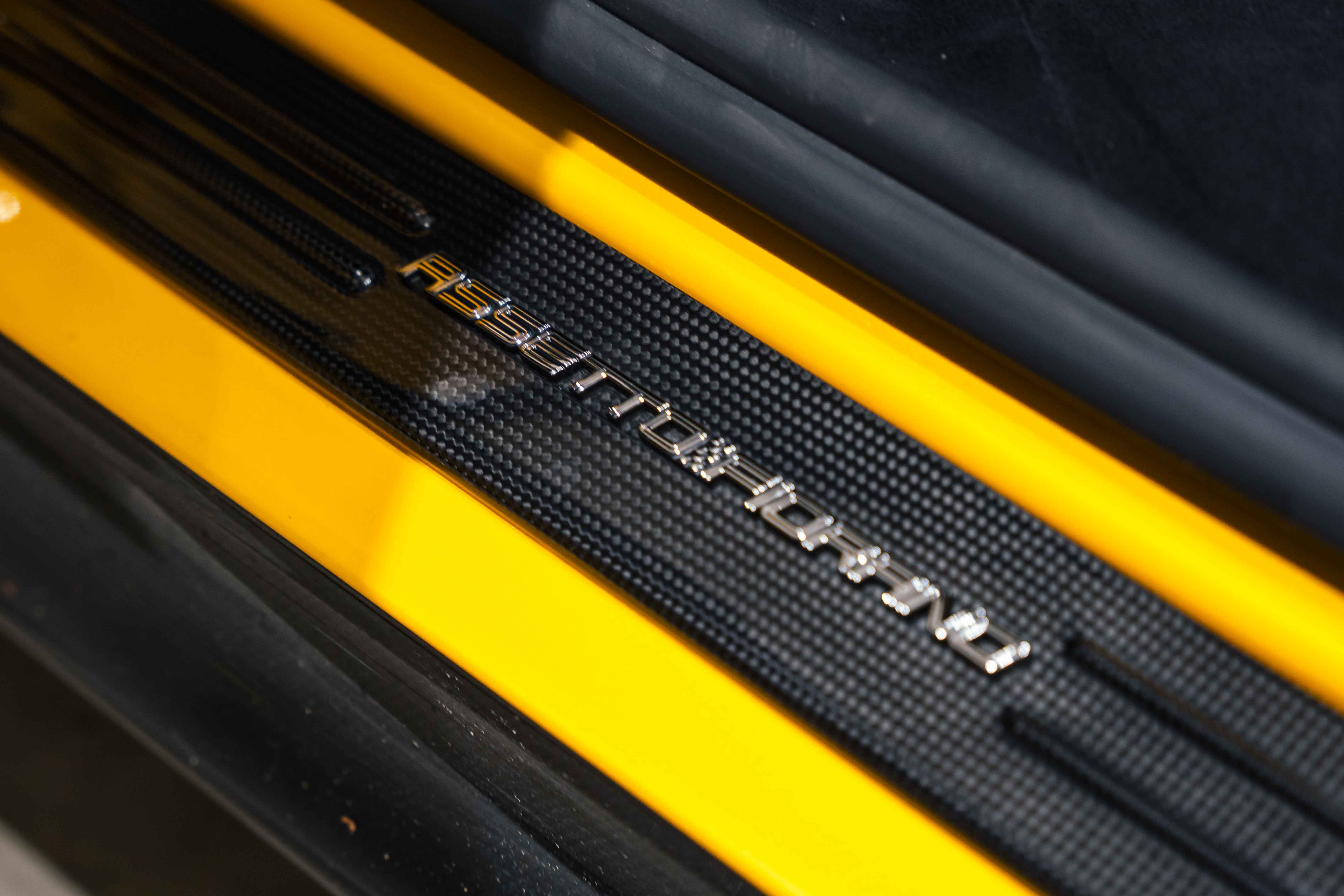 The interior continues this theme with an exceptional level of carbon fiber craftsmanship. Highlights include the carbon fibre driver zone with LEDs, instrument cover, upper centre console trim, door panels, rear shelf, dash inserts, and front luggage compartment area. Large-size carbon fibre racing seats with lifter are finished in Extra-Range Giallo leather, accented by Giallo stitching and embroidered Cavallino headrests, creating a cockpit that is both technical and unmistakably Ferrari. Additional bespoke touches include leather/Alcantara mats, coloured inner details, and special stitching throughout.