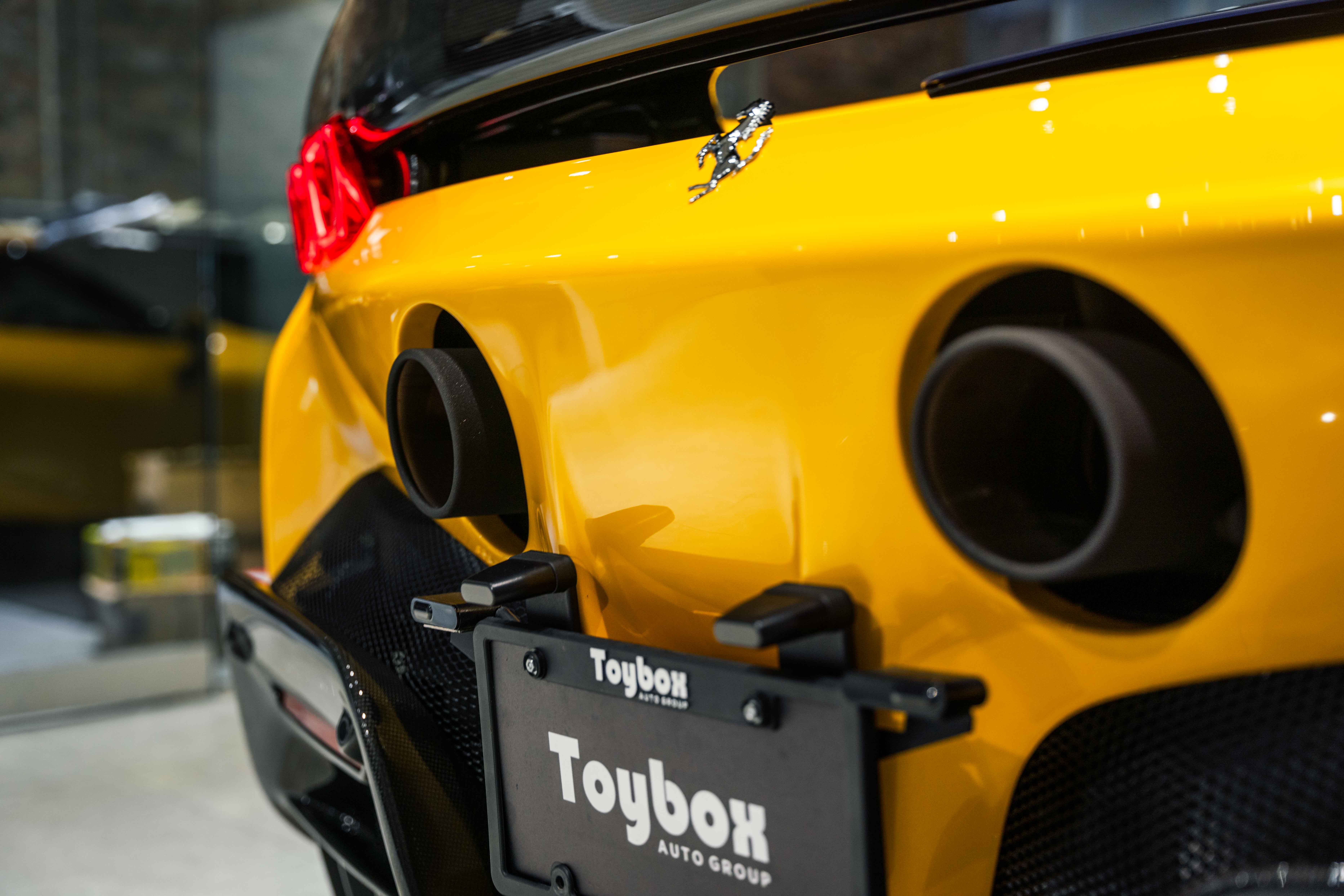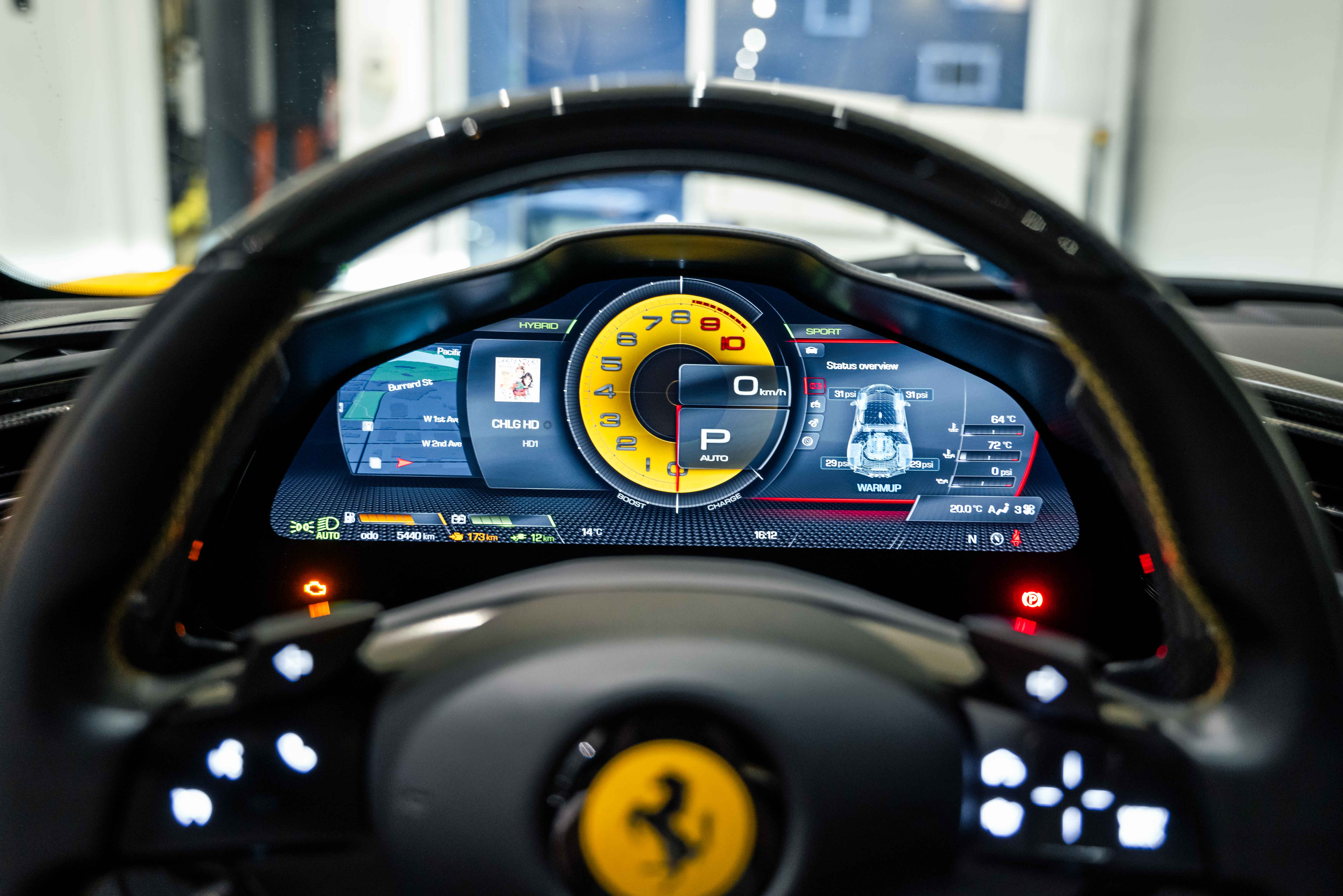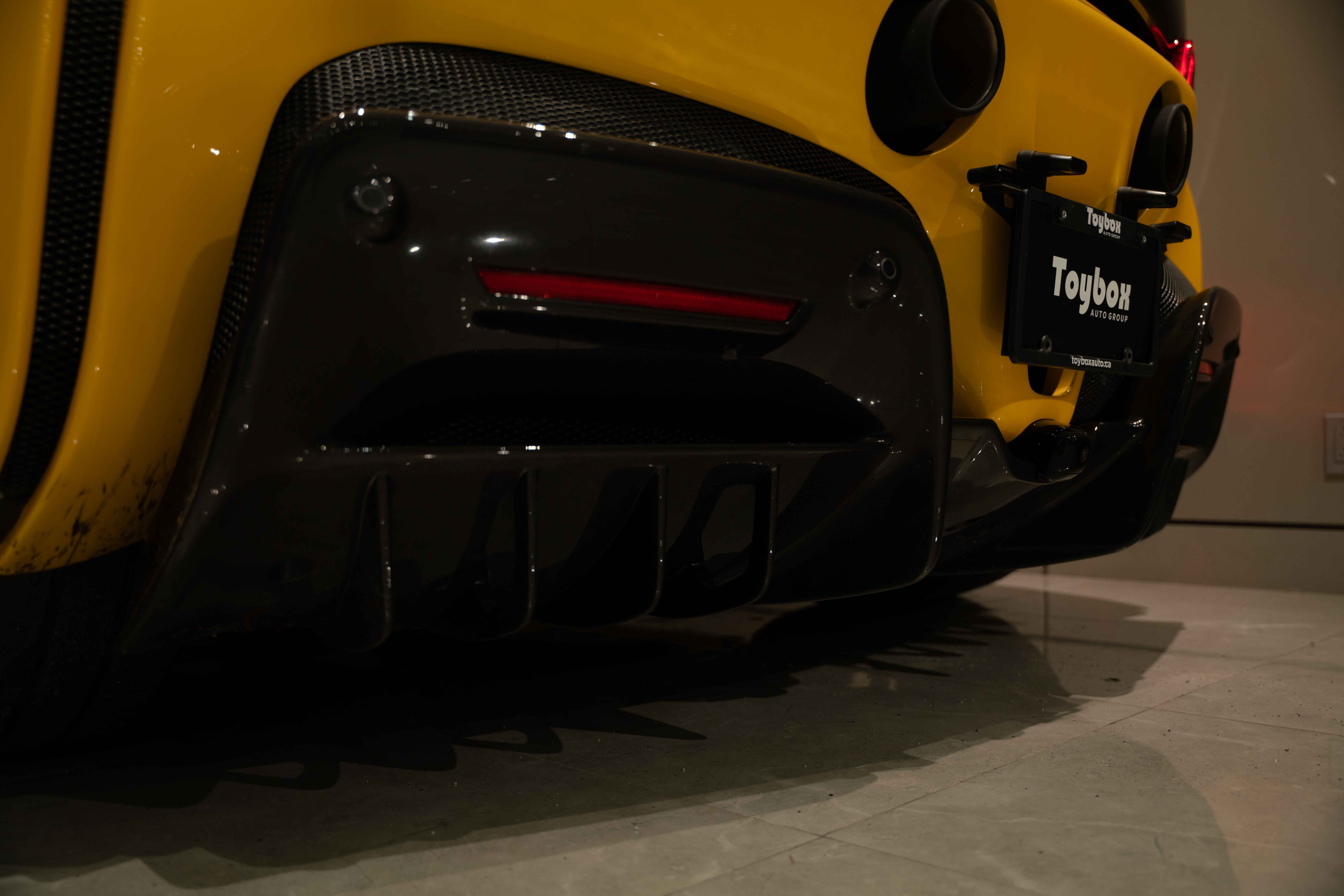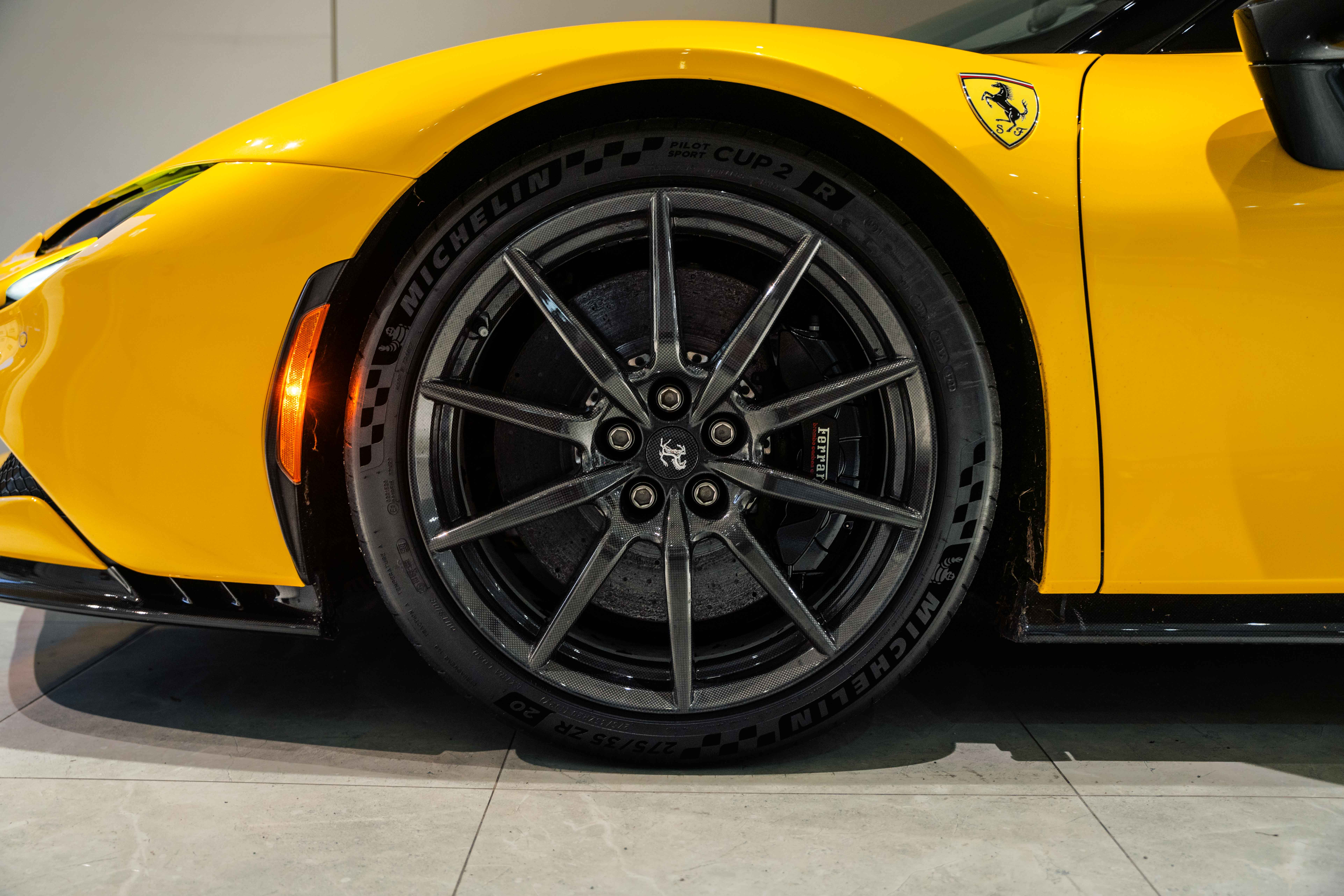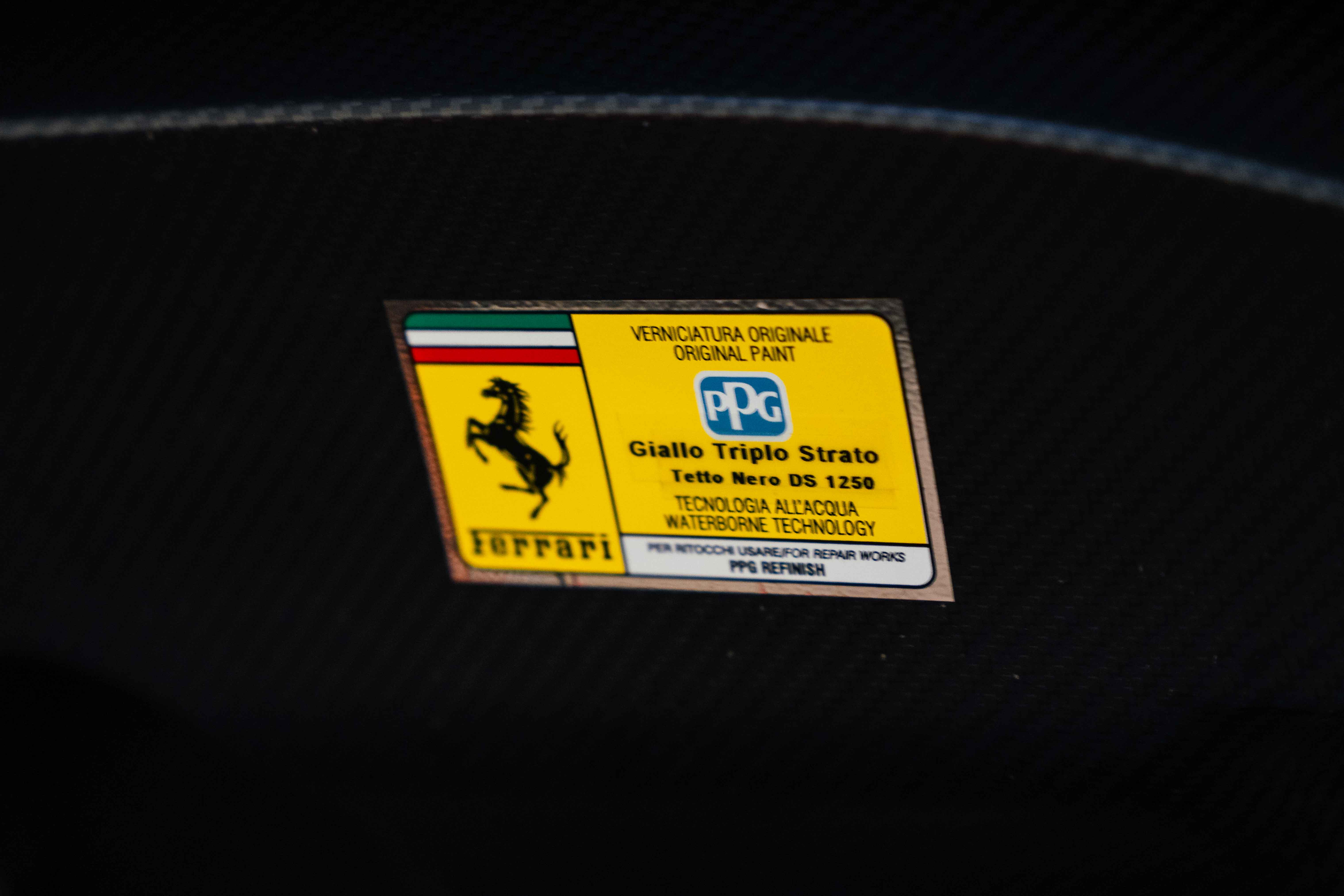 The interior continues this theme with an exceptional level of carbon fiber craftsmanship. Highlights include the carbon fibre driver zone with LEDs, instrument cover, upper centre console trim, door panels, rear shelf, dash inserts, and front luggage compartment area. Large-size carbon fibre racing seats with lifter are finished in Extra-Range Giallo leather, accented by Giallo stitching and embroidered Cavallino headrests, creating a cockpit that is both technical and unmistakably Ferrari. Additional bespoke touches include leather/Alcantara mats, coloured inner details, and special stitching throughout.
