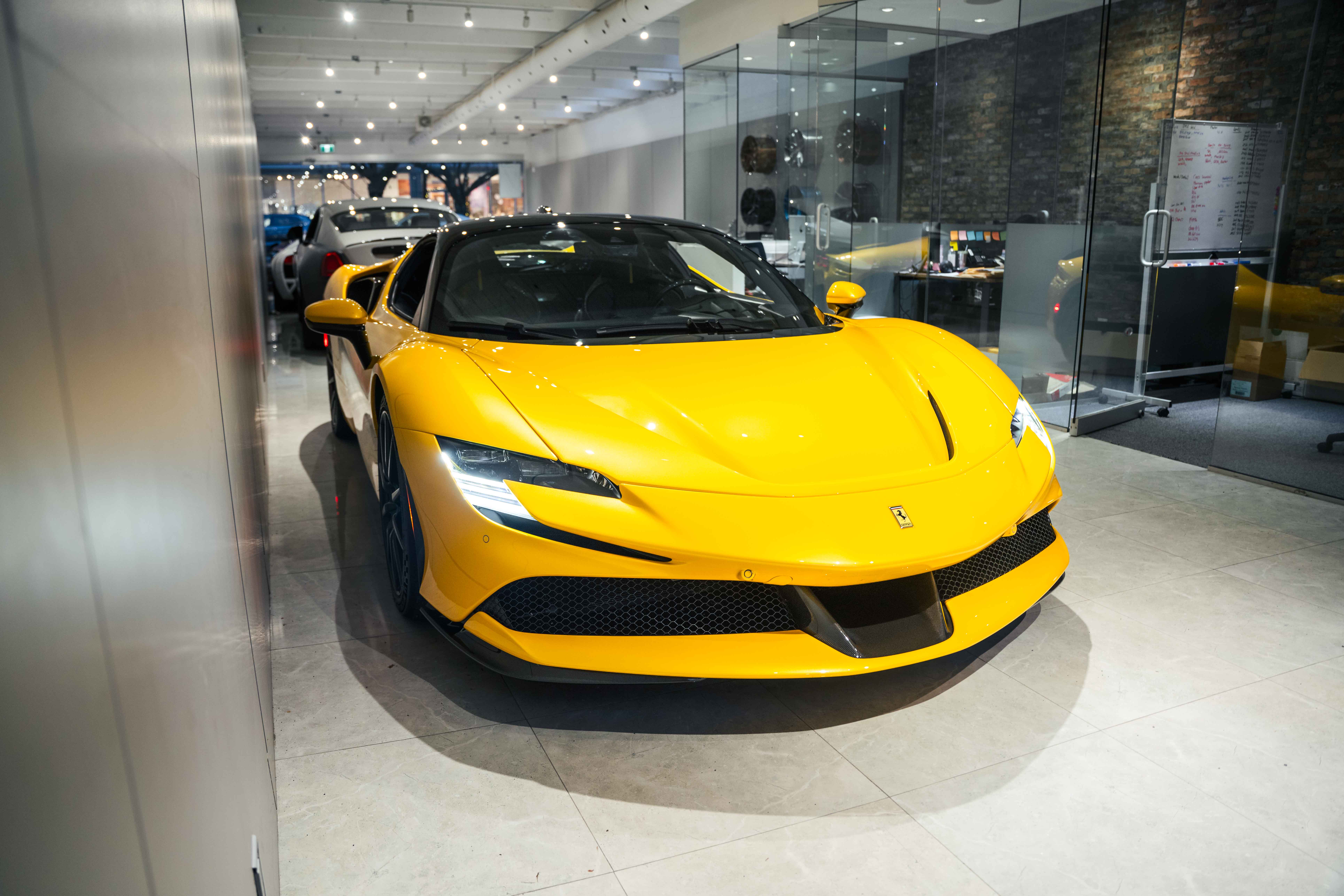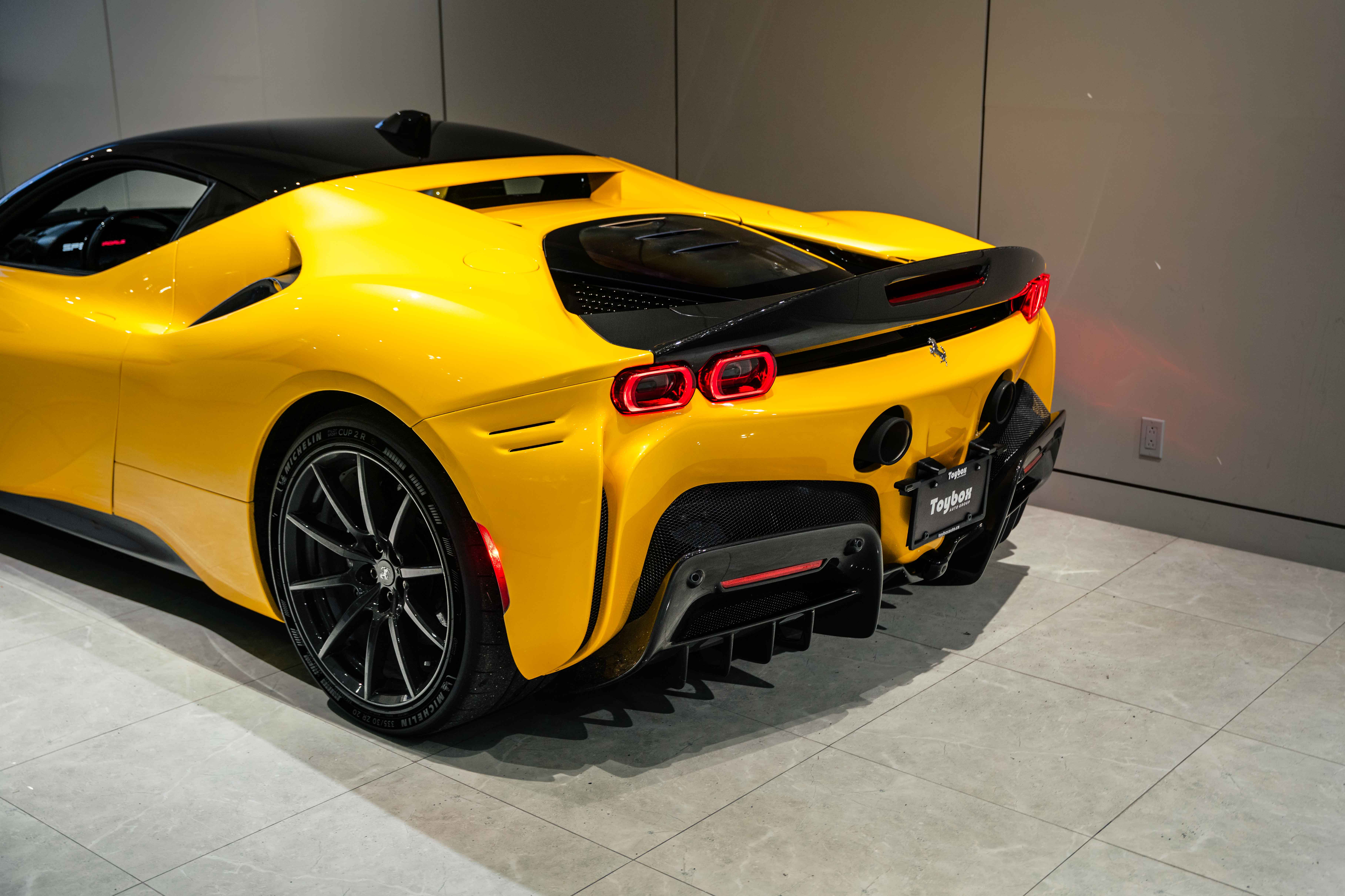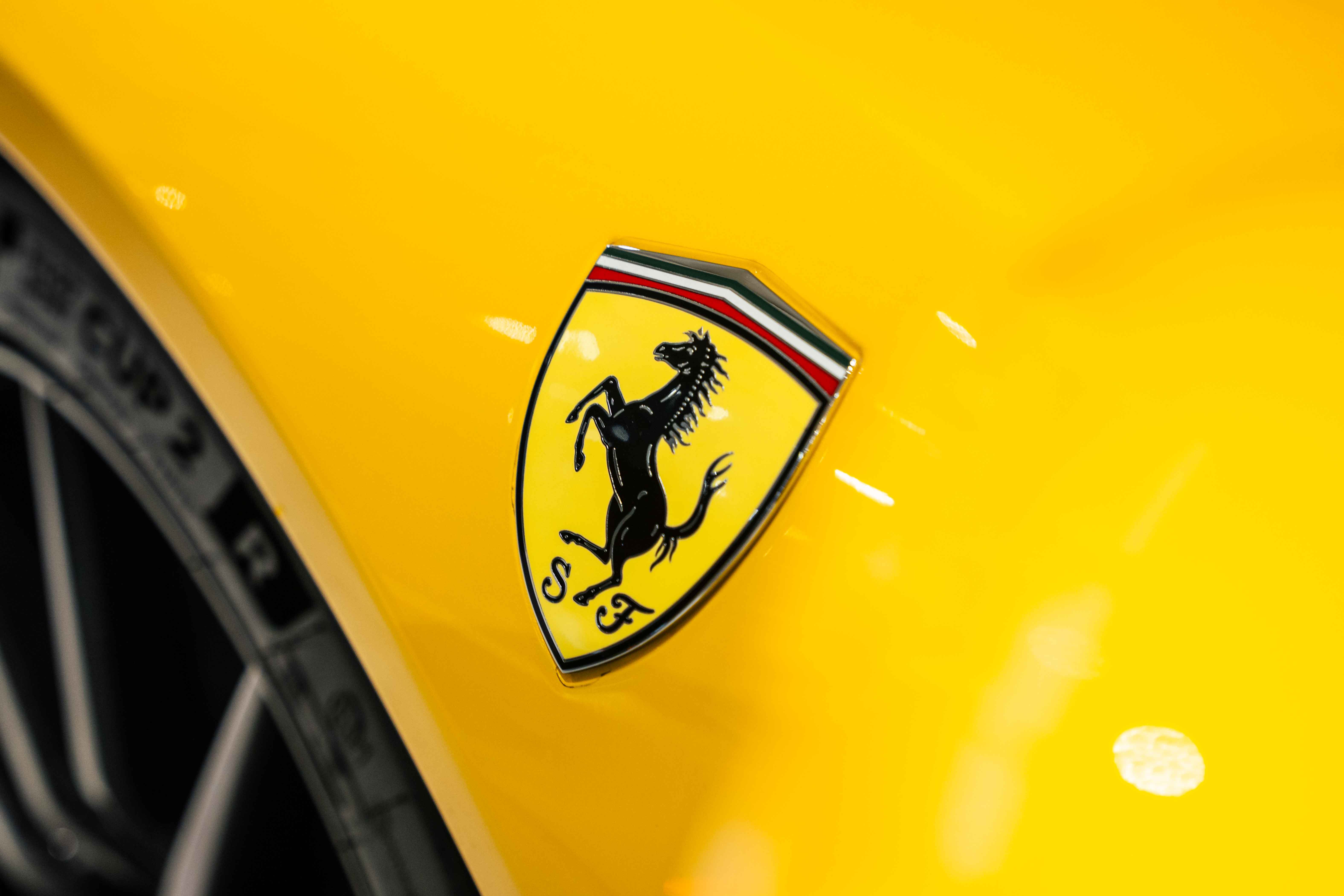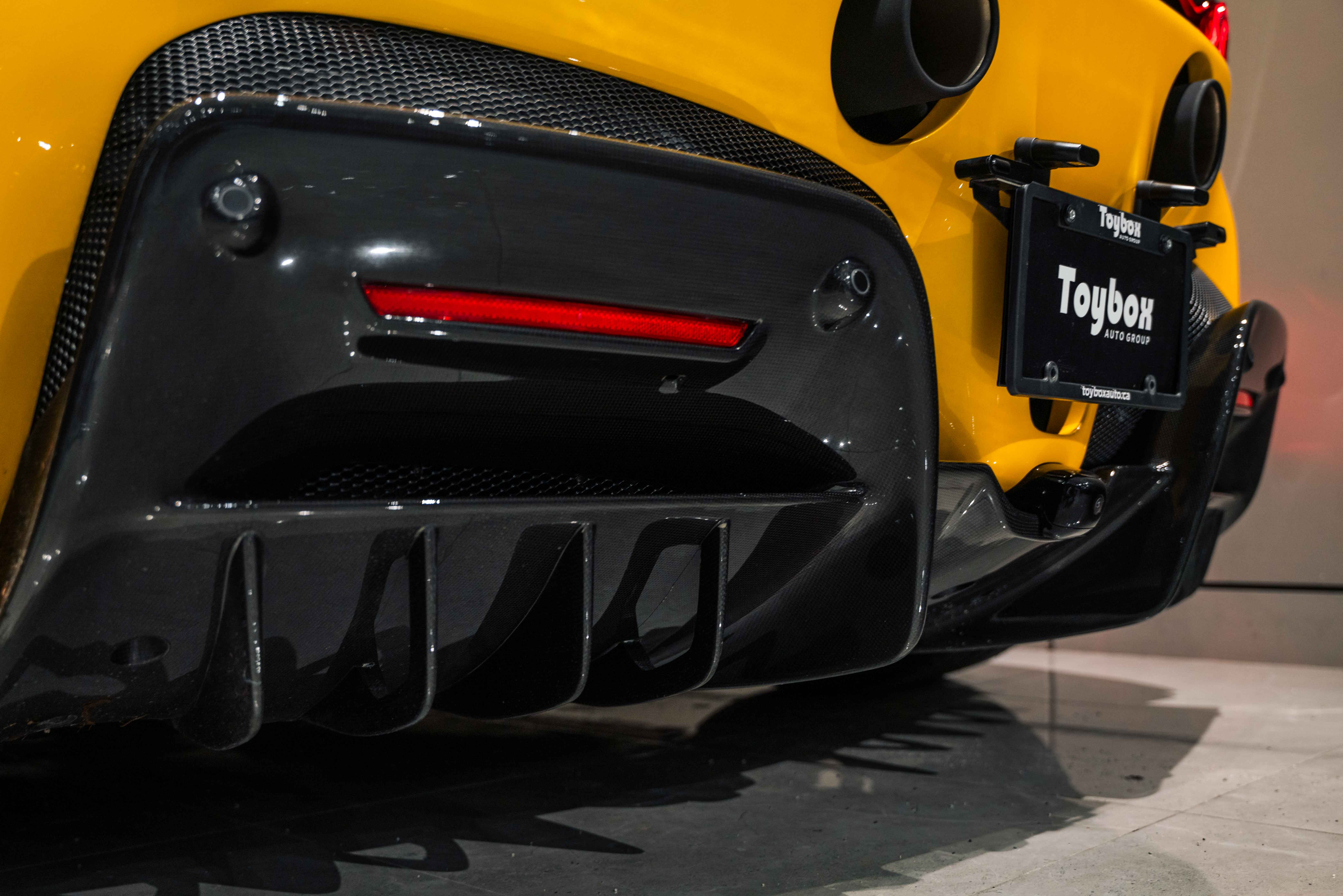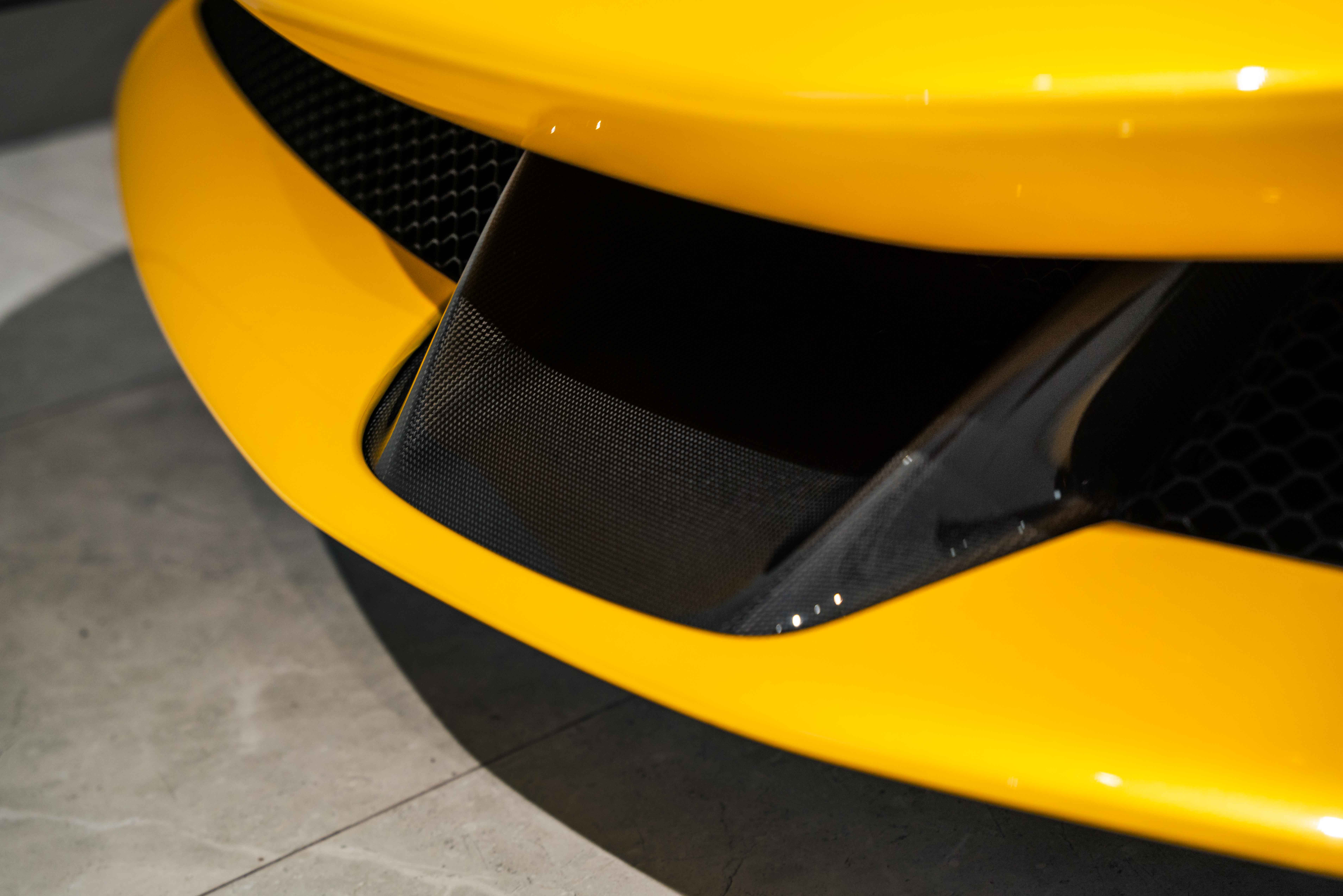 The interior continues this theme with an exceptional level of carbon fiber craftsmanship. Highlights include the carbon fibre driver zone with LEDs, instrument cover, upper centre console trim, door panels, rear shelf, dash inserts, and front luggage compartment area. Large-size carbon fibre racing seats with lifter are finished in Extra-Range Giallo leather, accented by Giallo stitching and embroidered Cavallino headrests, creating a cockpit that is both technical and unmistakably Ferrari. Additional bespoke touches include leather/Alcantara mats, coloured inner details, and special stitching throughout.