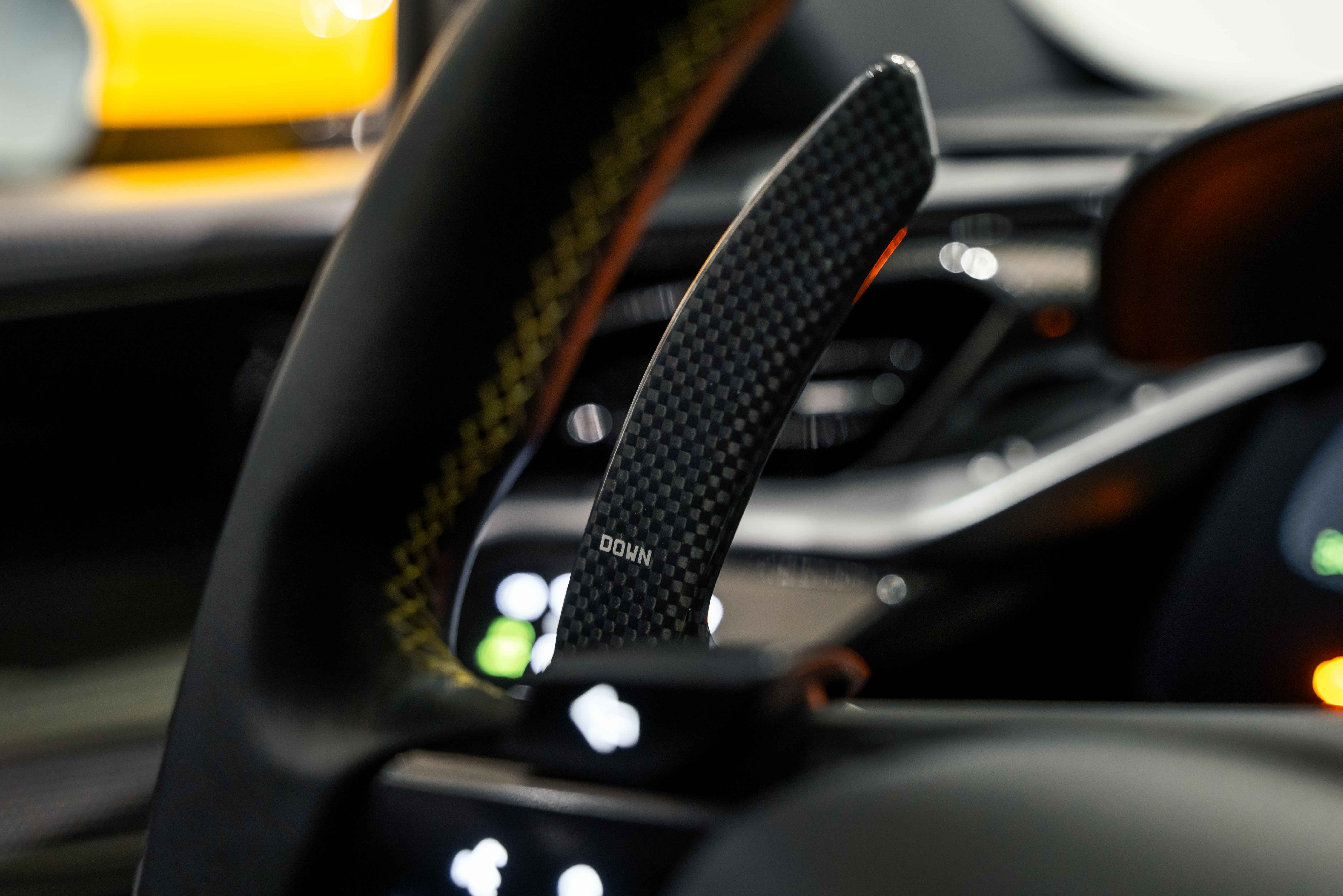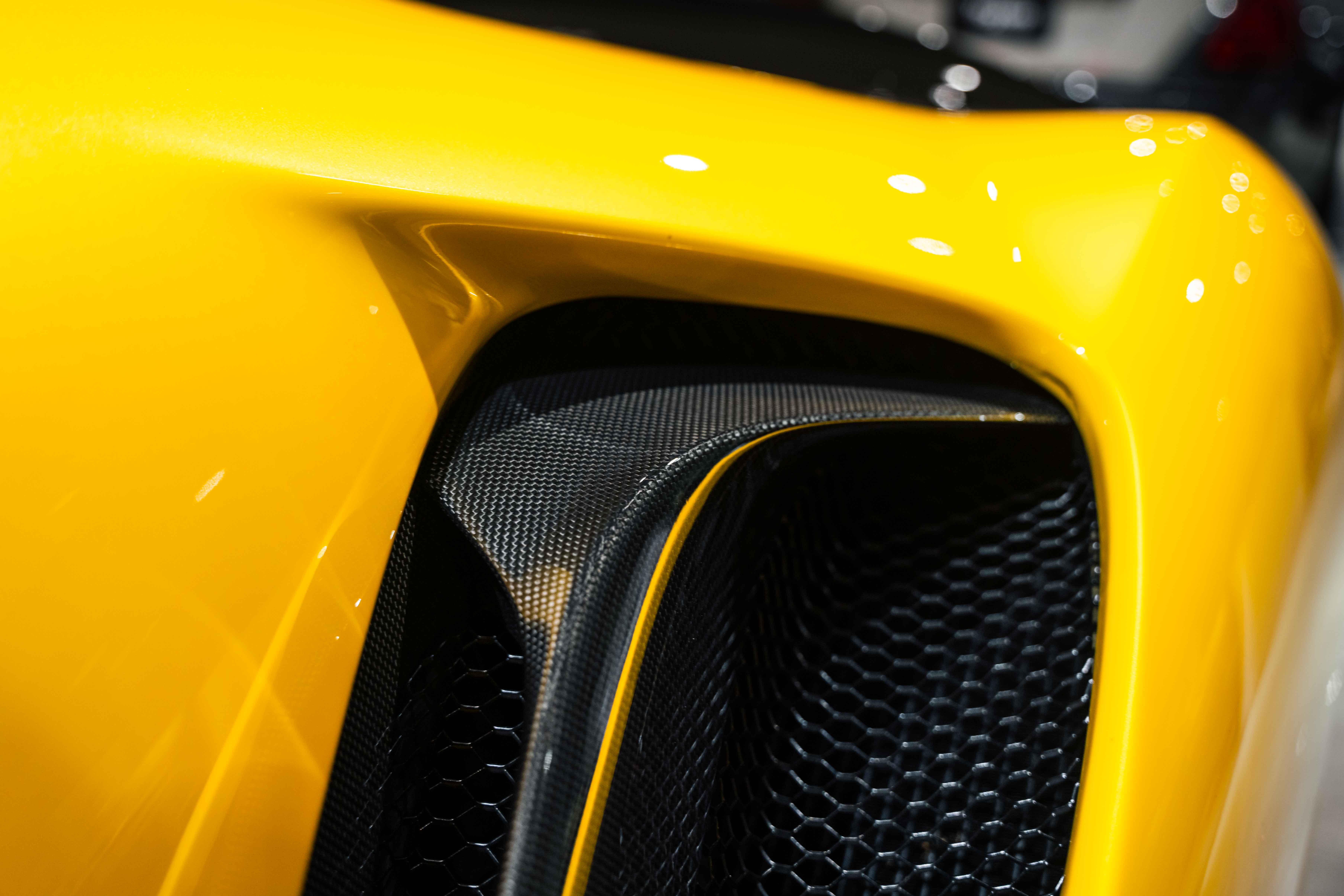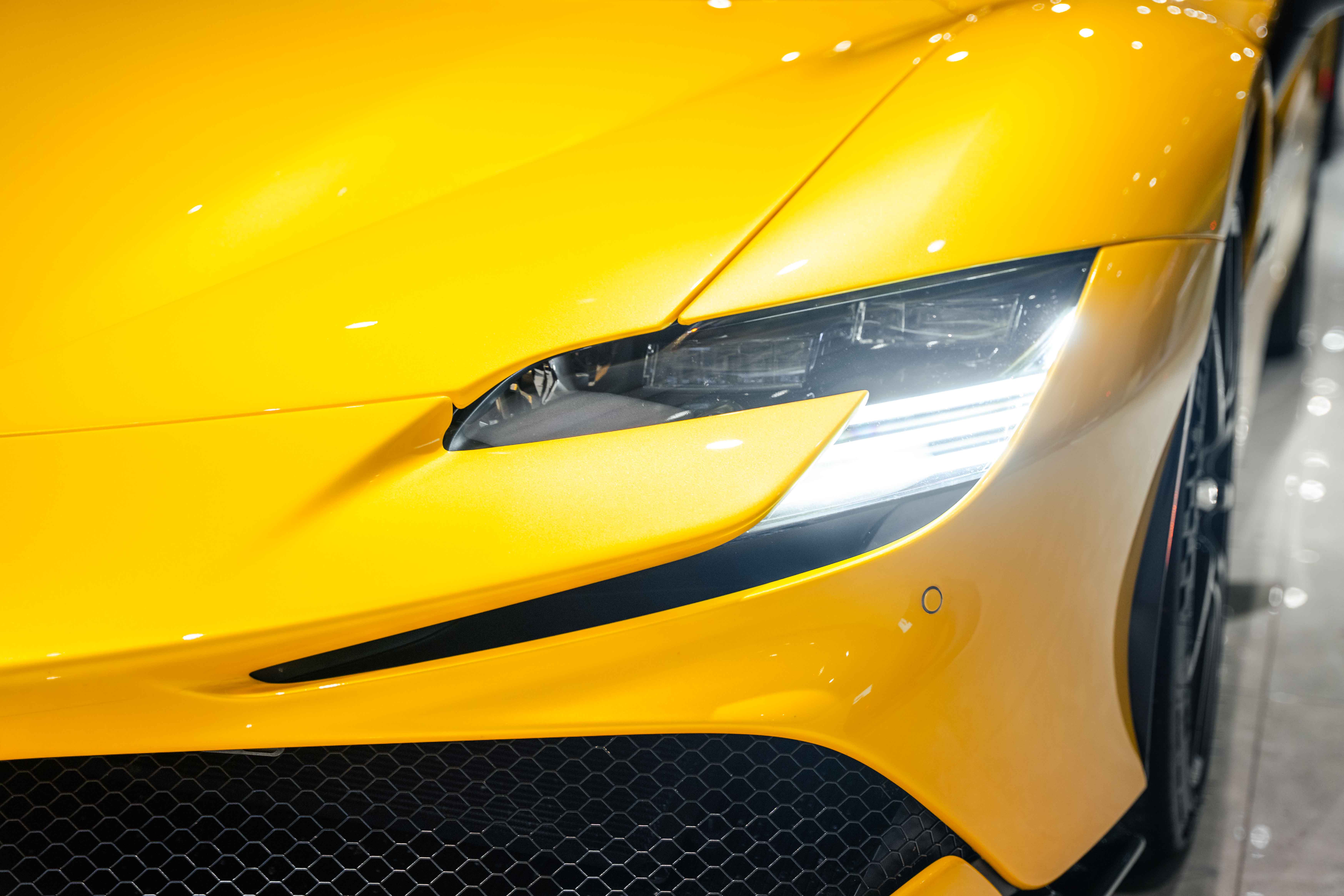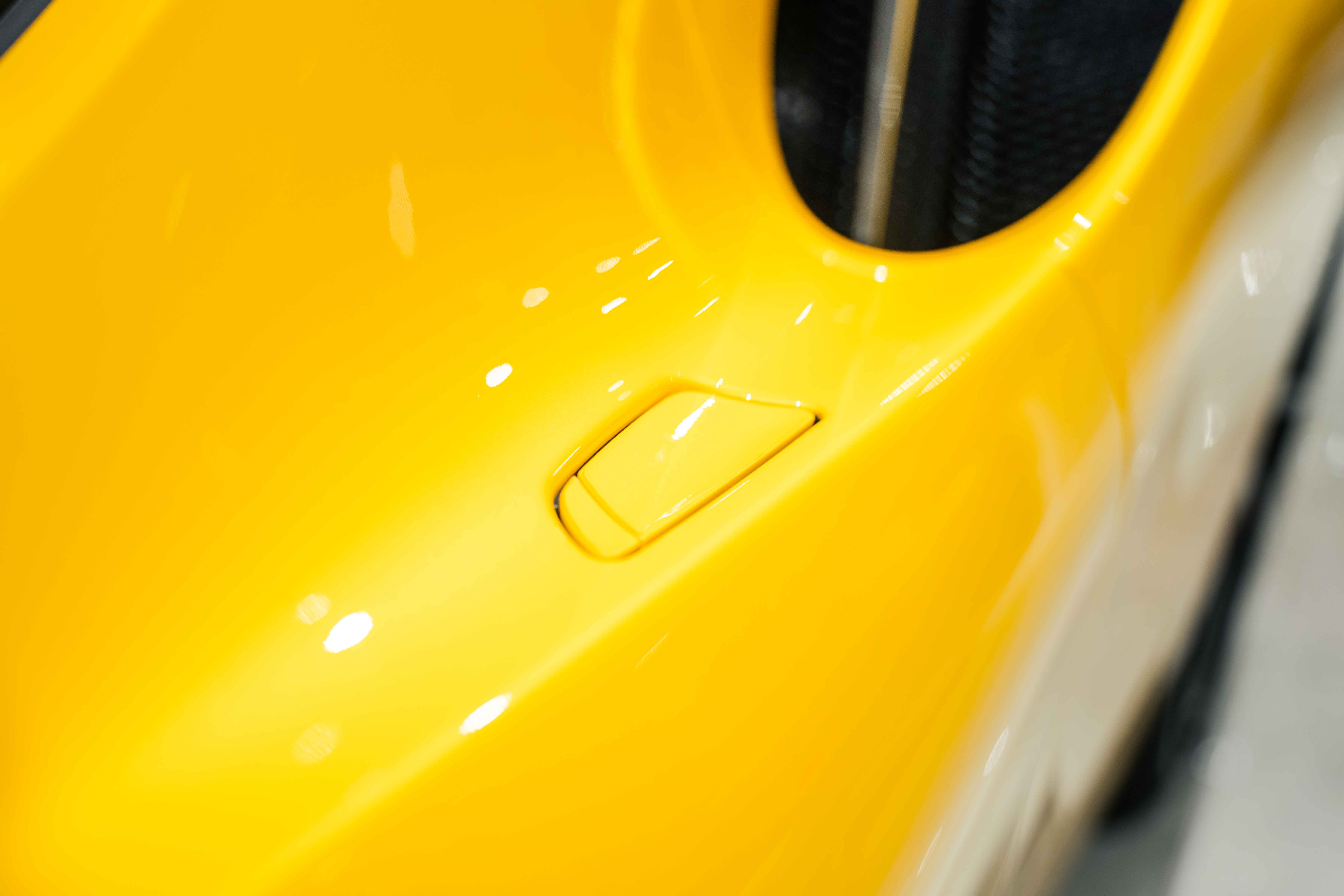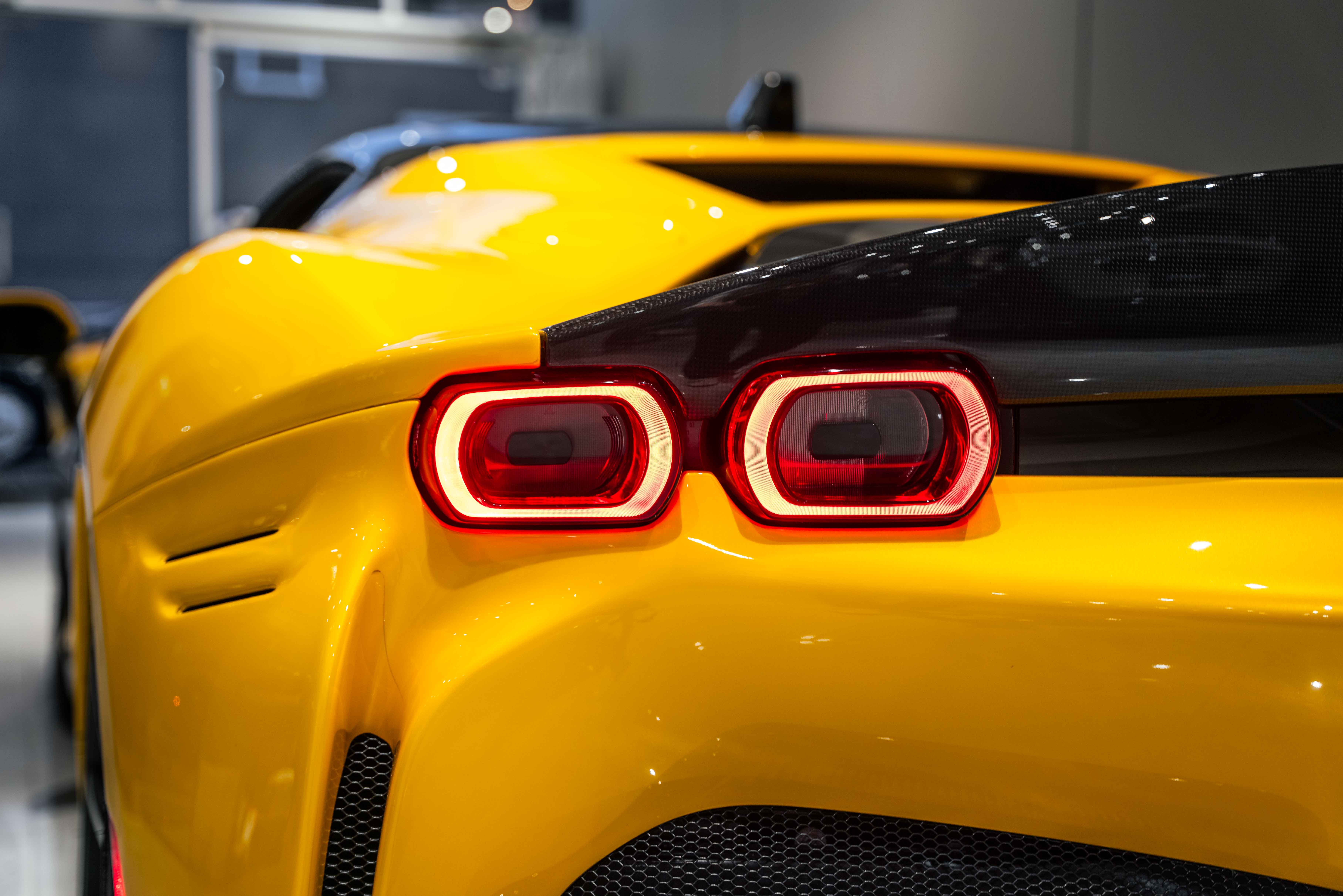 The interior continues this theme with an exceptional level of carbon fiber craftsmanship. Highlights include the carbon fibre driver zone with LEDs, instrument cover, upper centre console trim, door panels, rear shelf, dash inserts, and front luggage compartment area. Large-size carbon fibre racing seats with lifter are finished in Extra-Range Giallo leather, accented by Giallo stitching and embroidered Cavallino headrests, creating a cockpit that is both technical and unmistakably Ferrari. Additional bespoke touches include leather/Alcantara mats, coloured inner details, and special stitching throughout.