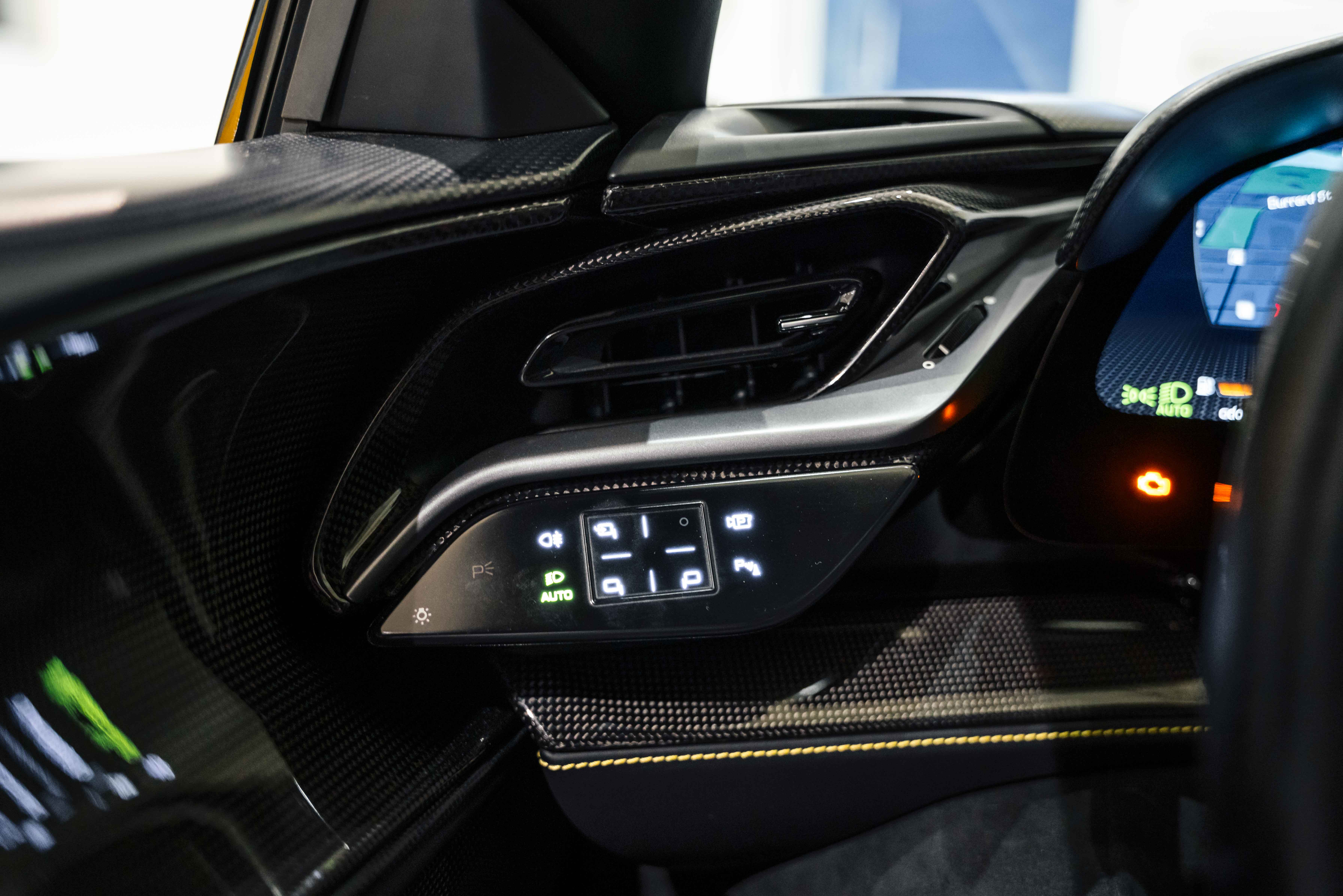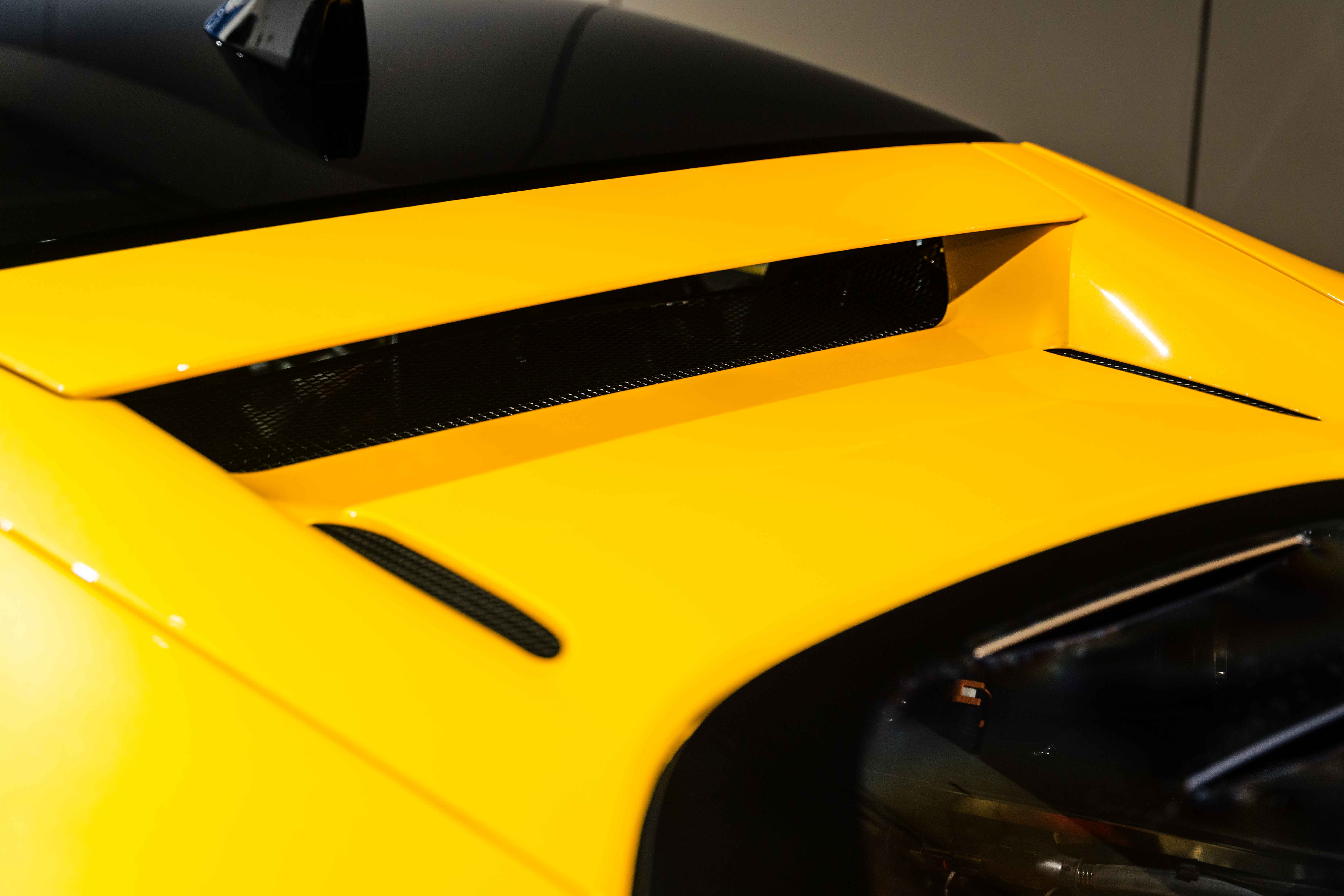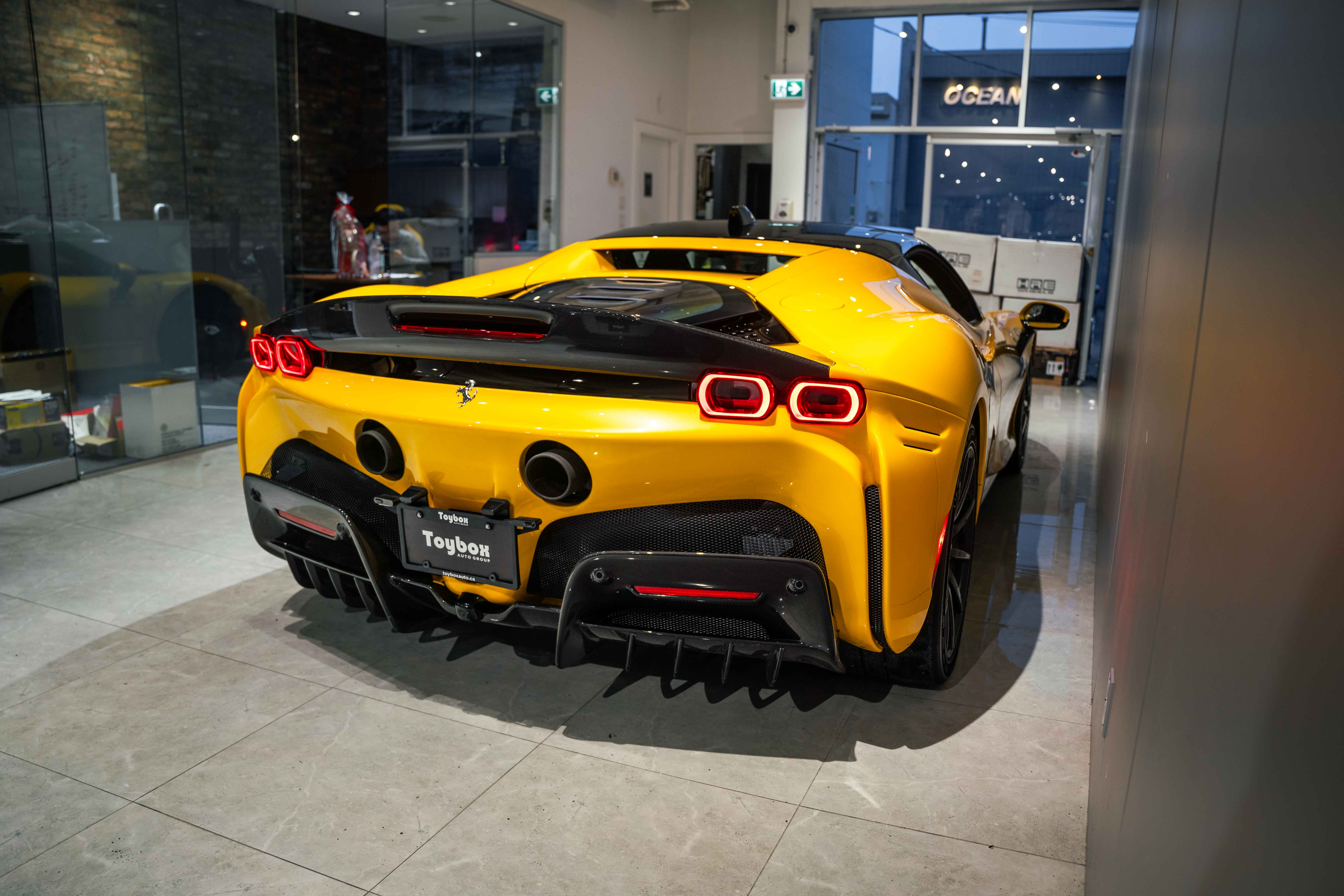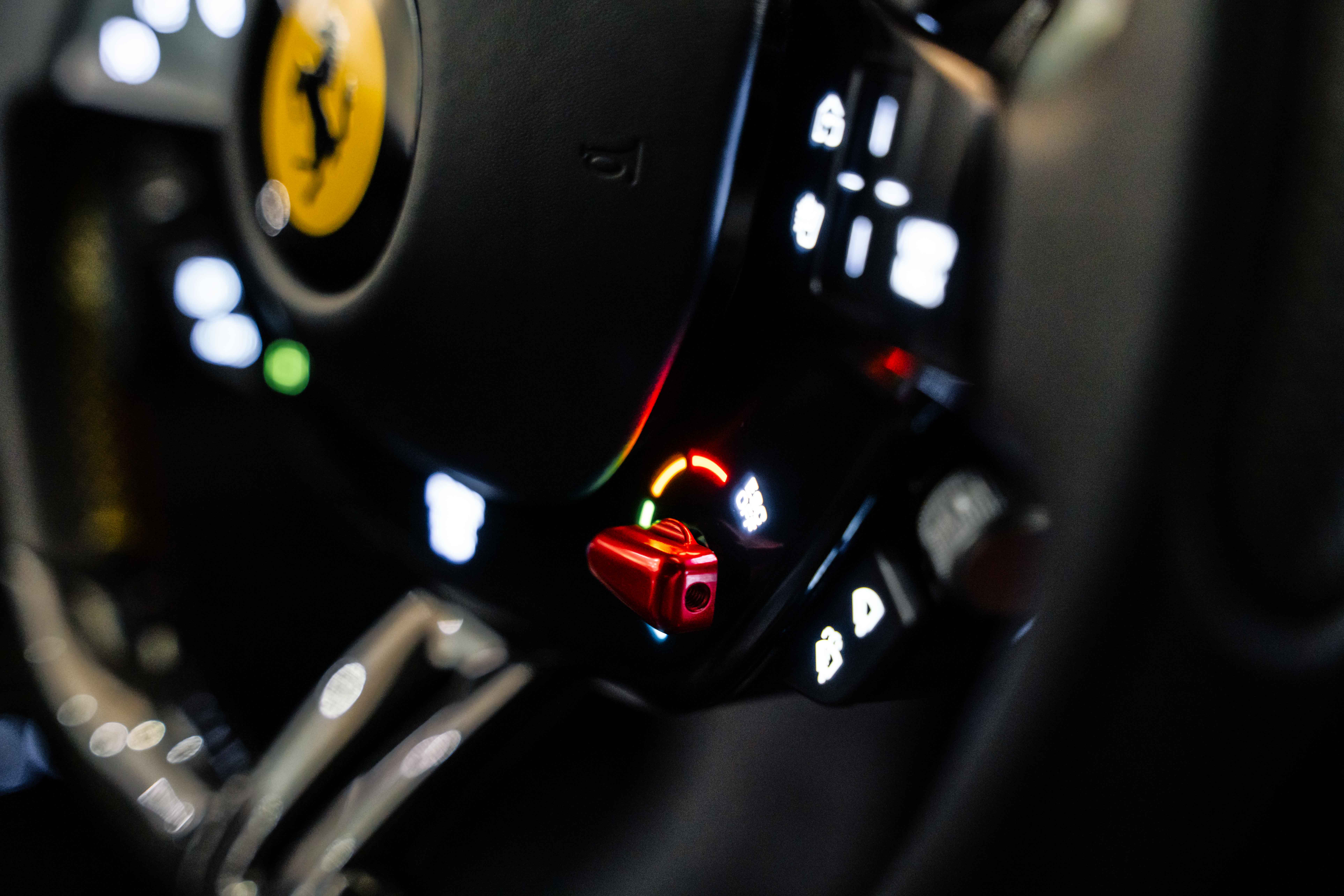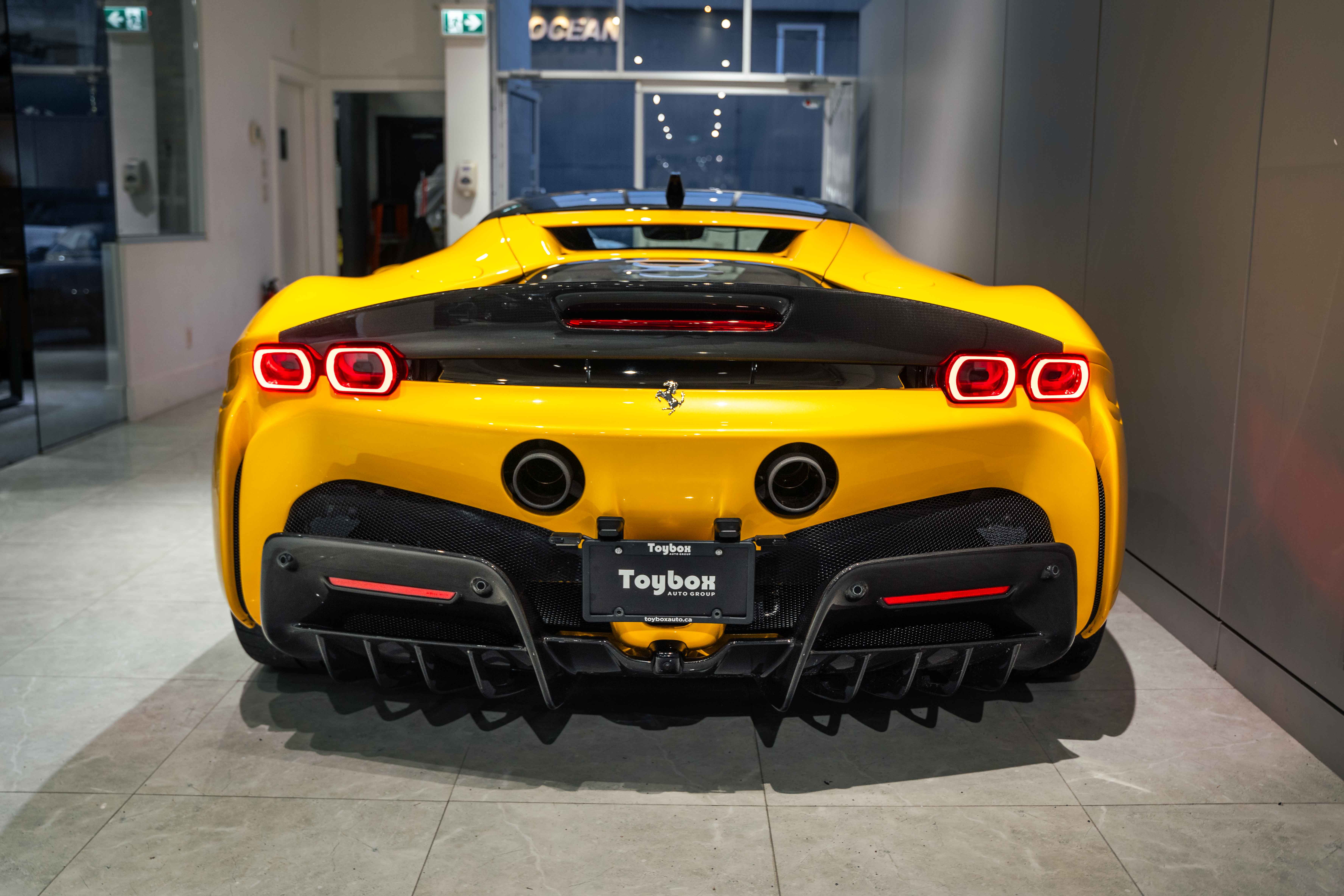 The interior continues this theme with an exceptional level of carbon fiber craftsmanship. Highlights include the carbon fibre driver zone with LEDs, instrument cover, upper centre console trim, door panels, rear shelf, dash inserts, and front luggage compartment area. Large-size carbon fibre racing seats with lifter are finished in Extra-Range Giallo leather, accented by Giallo stitching and embroidered Cavallino headrests, creating a cockpit that is both technical and unmistakably Ferrari. Additional bespoke touches include leather/Alcantara mats, coloured inner details, and special stitching throughout.