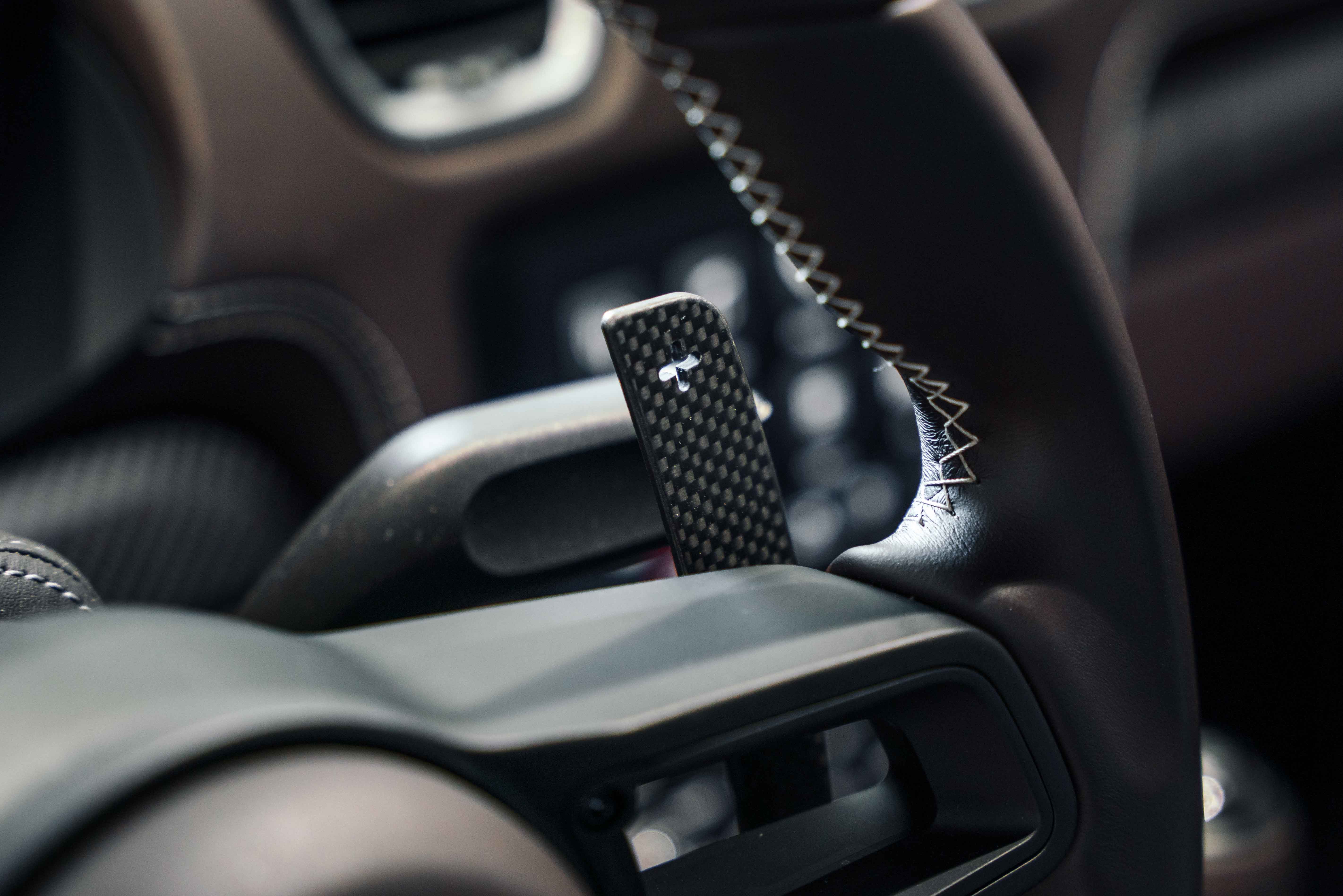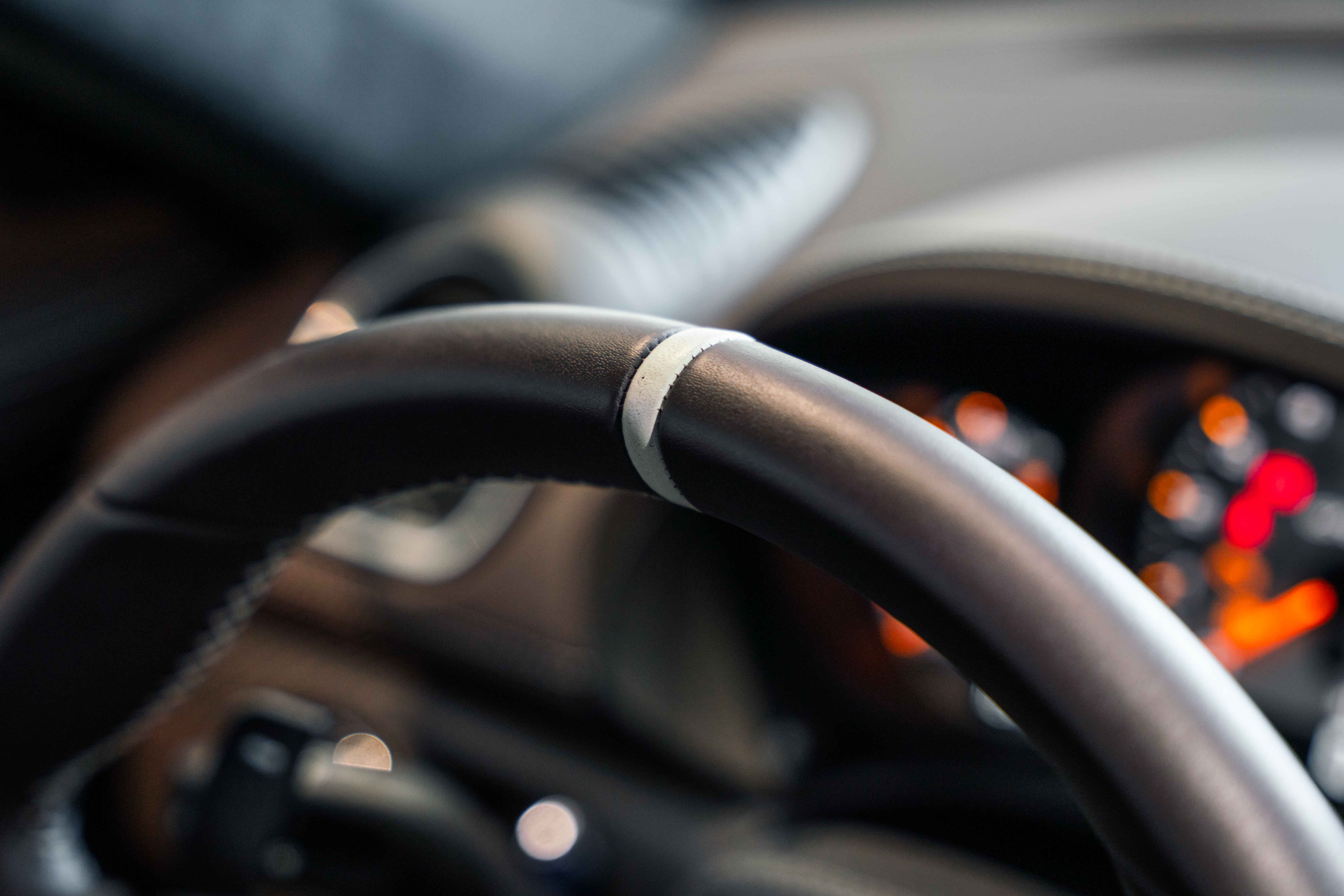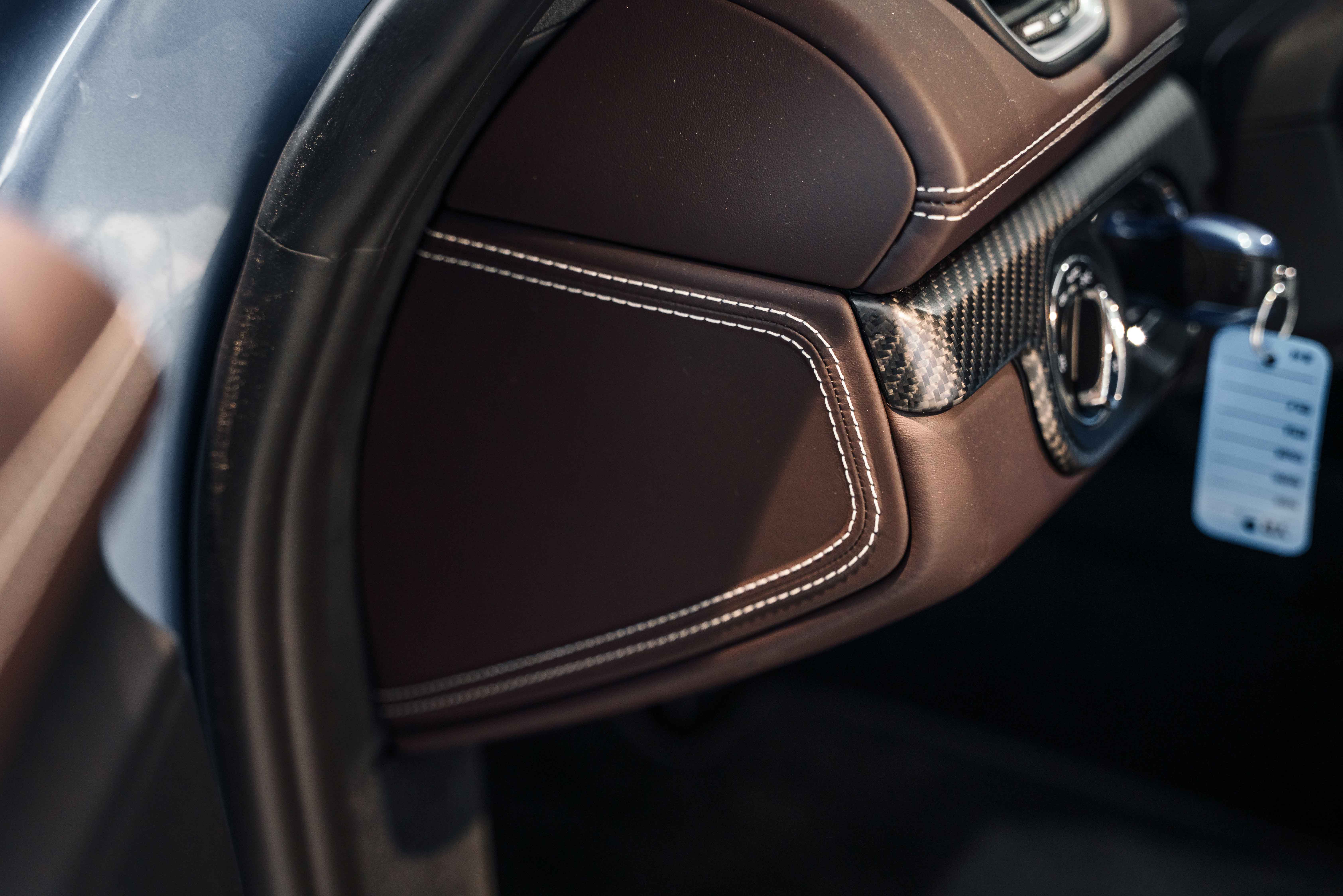 Espresso leather rim and airbag module with Pebble Grey stitching