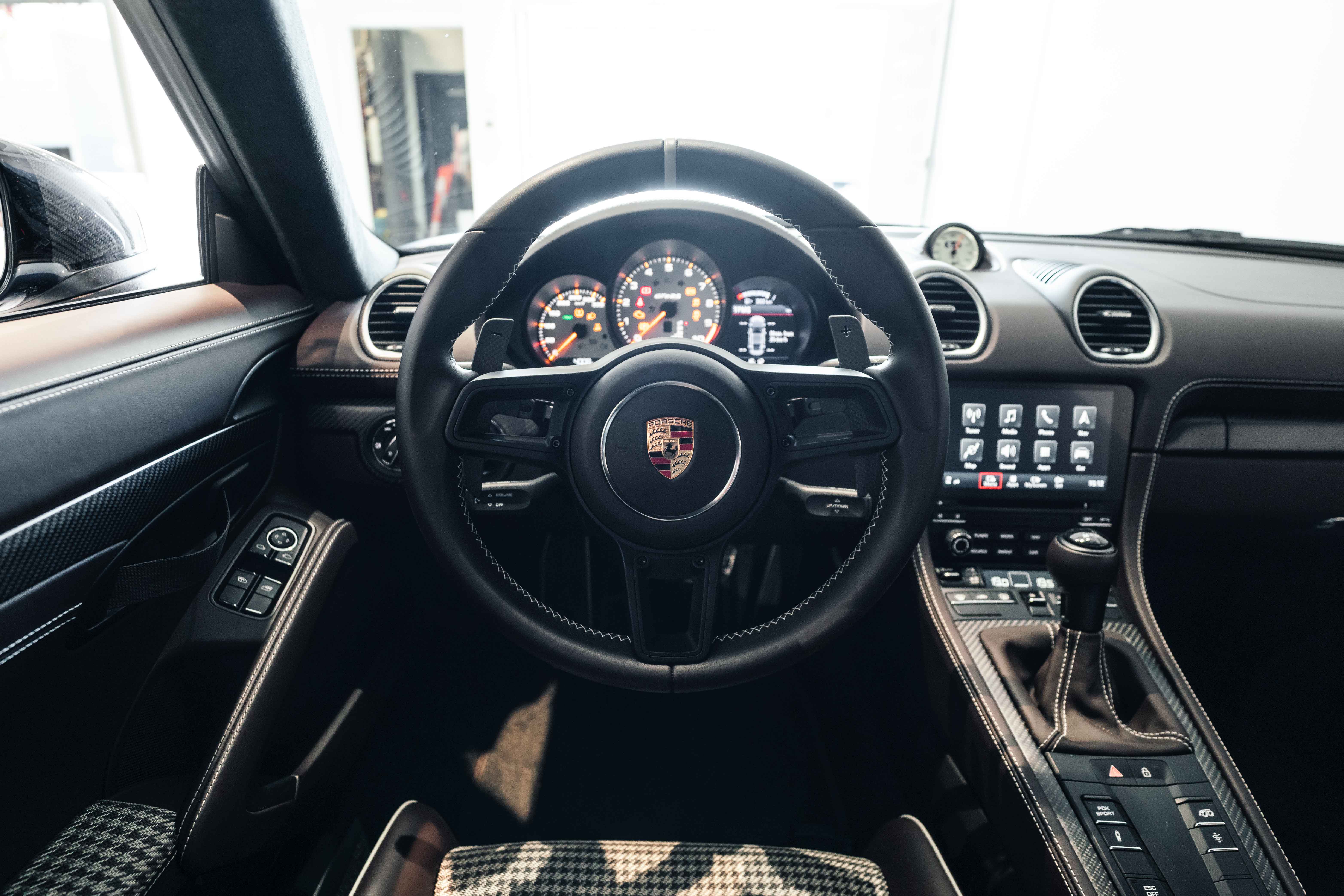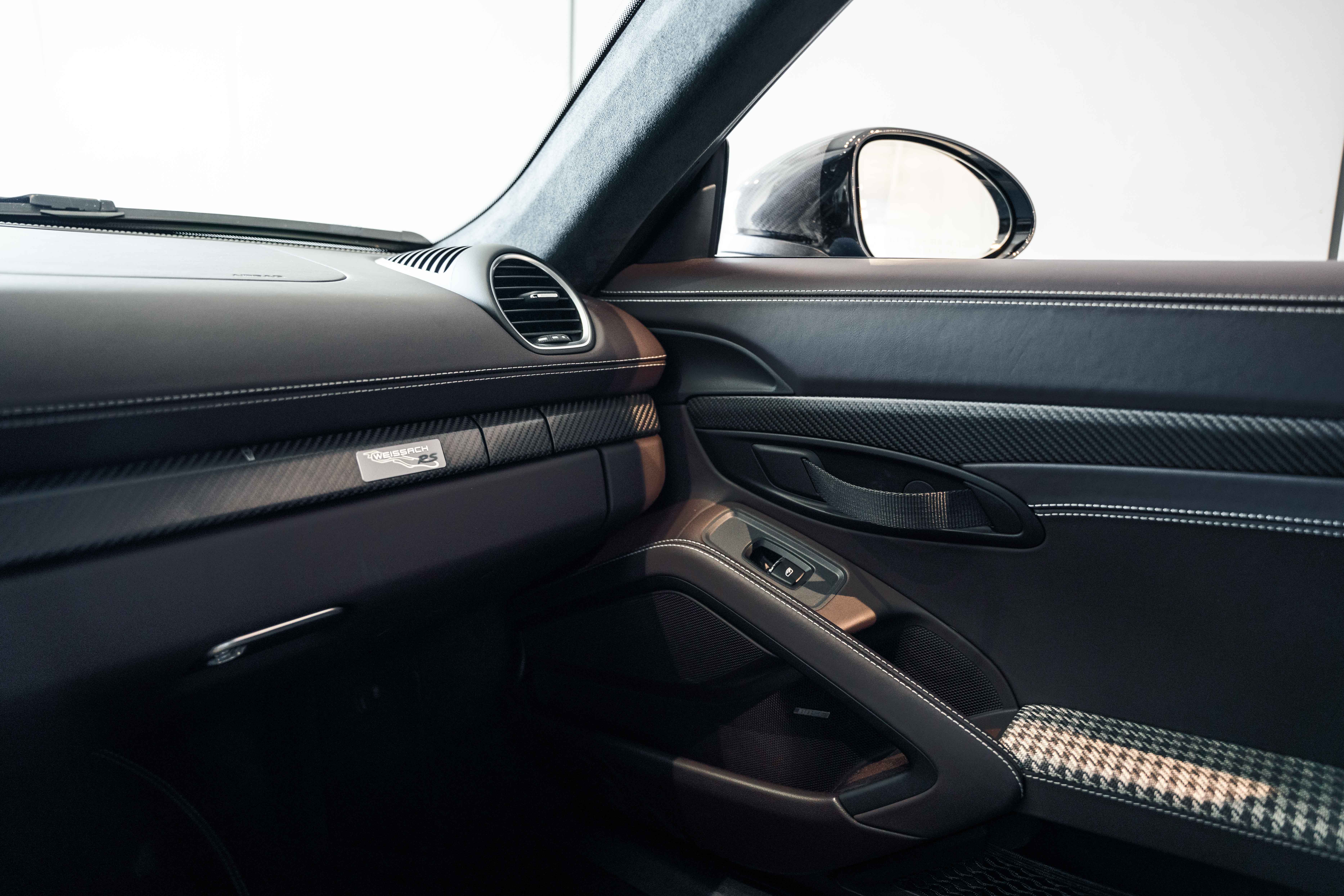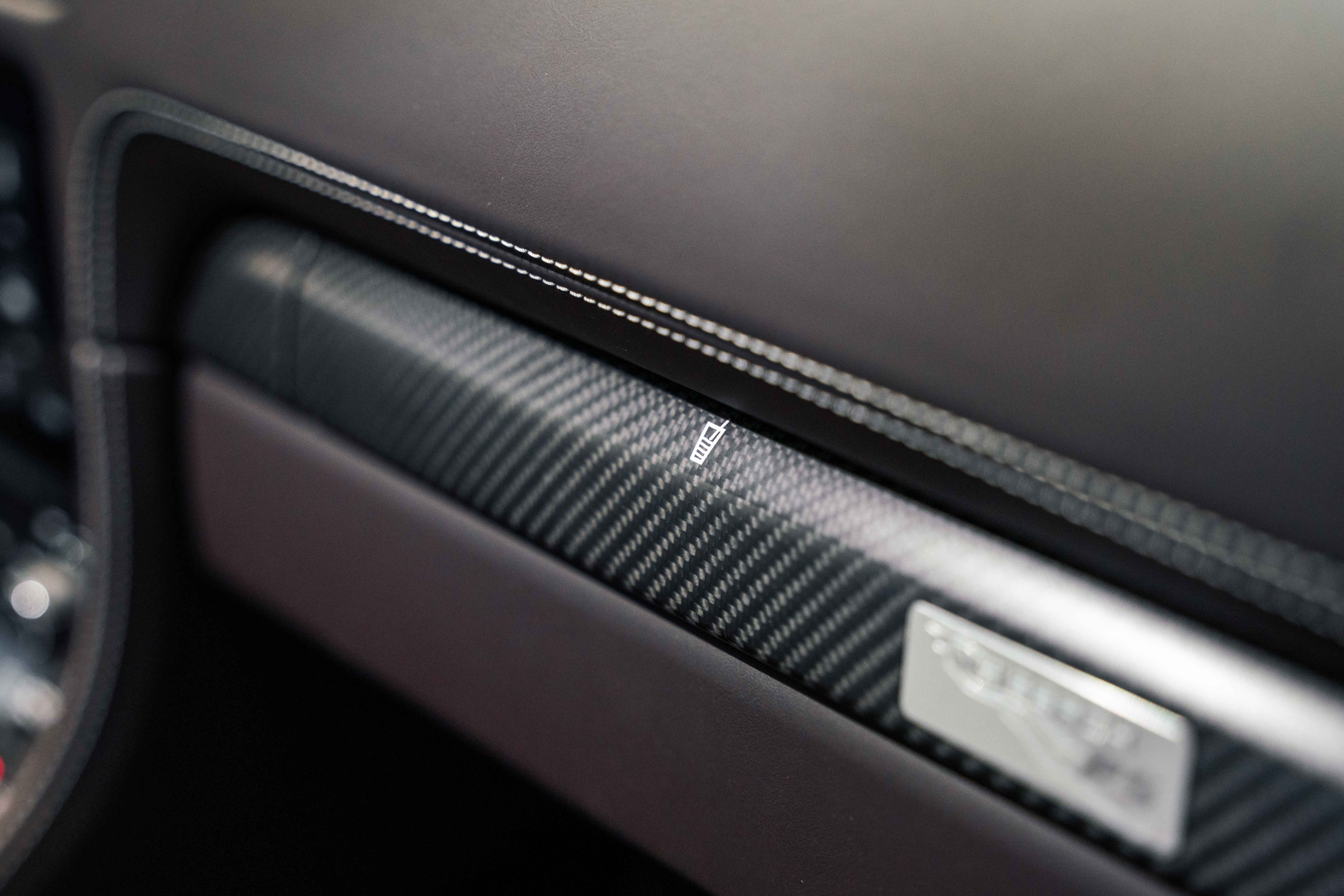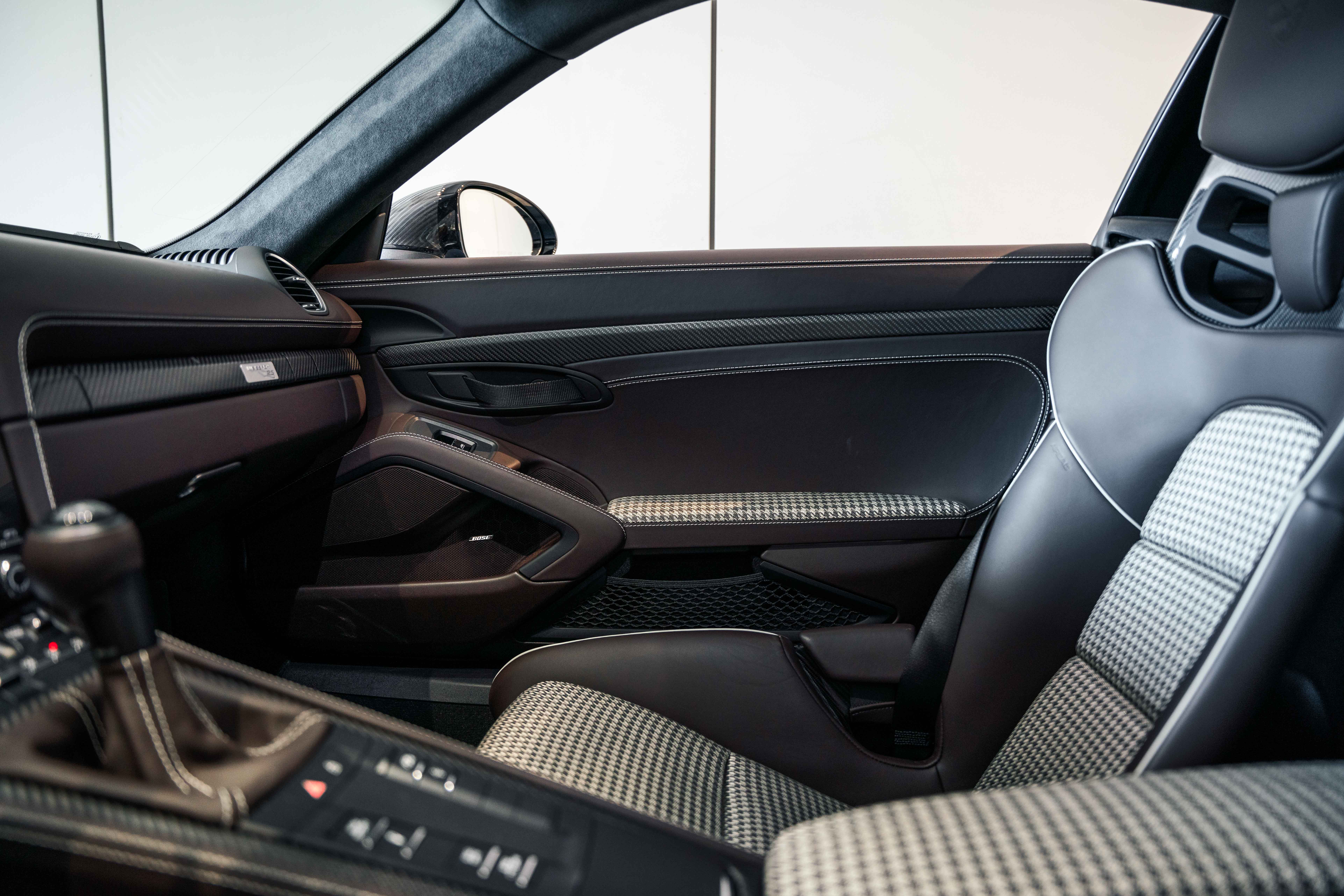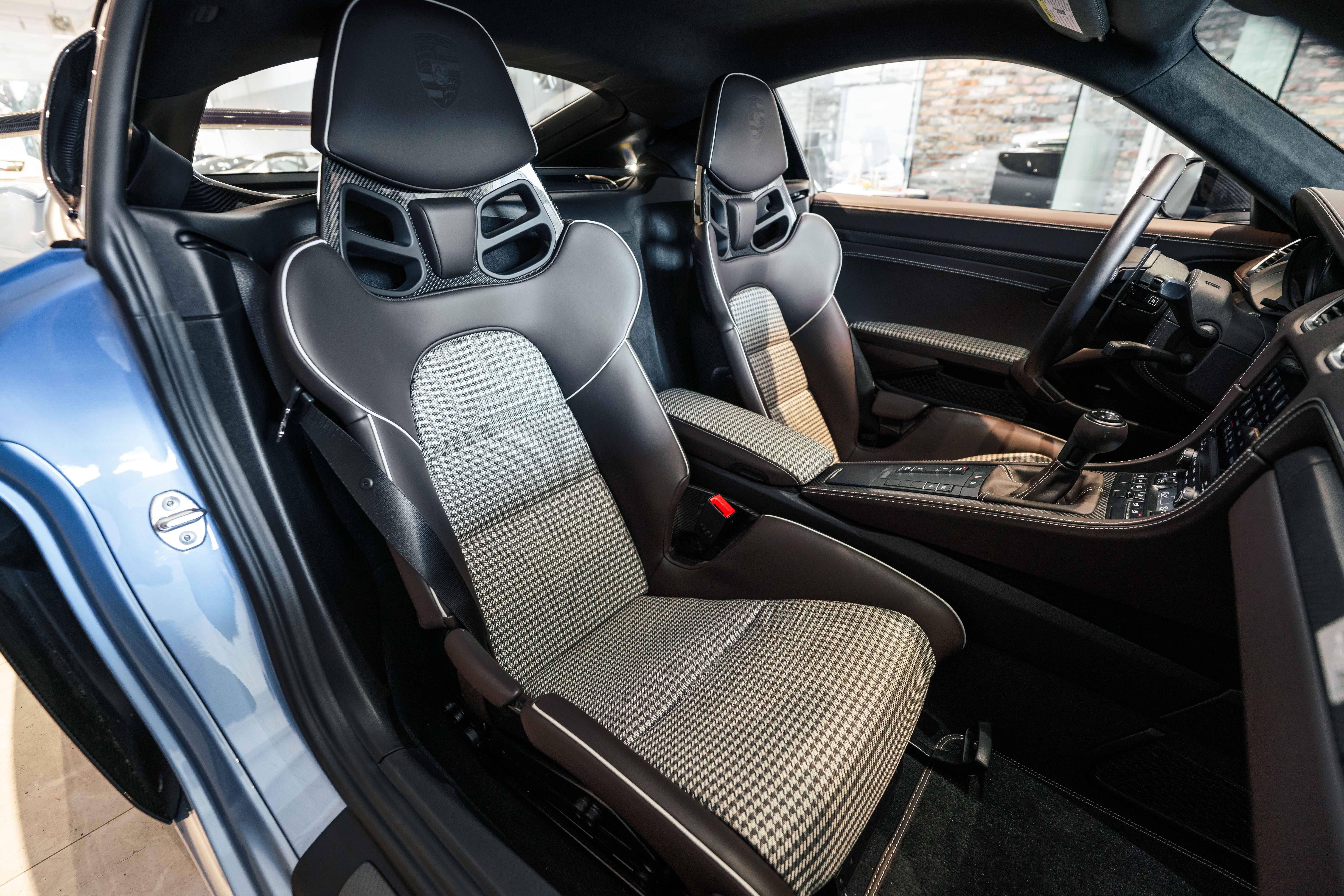 Inside, the Sonderwunsch specification transforms the cockpit into a work of tailored artistry. The cabin is upholstered extensively in Espresso leather with Pebble Grey stitching, seamlessly accented by Agate Grey / Geysir Grey Pepita fabric inserts on the seats, armrests, and storage bin lid. Every surface — from the upper and lower dashboard to the centre console sides and door panels — has been hand-finished in Espresso leather, creating a warm yet sophisticated atmosphere. The Porsche Crest embossed on the headrests, matte carbon fiber trim, and Pebble Grey leather 12 o’clock marker on the steering wheel add subtle but purposeful character. Even the floor mats are personalized, bordered in leather to complete the bespoke theme.