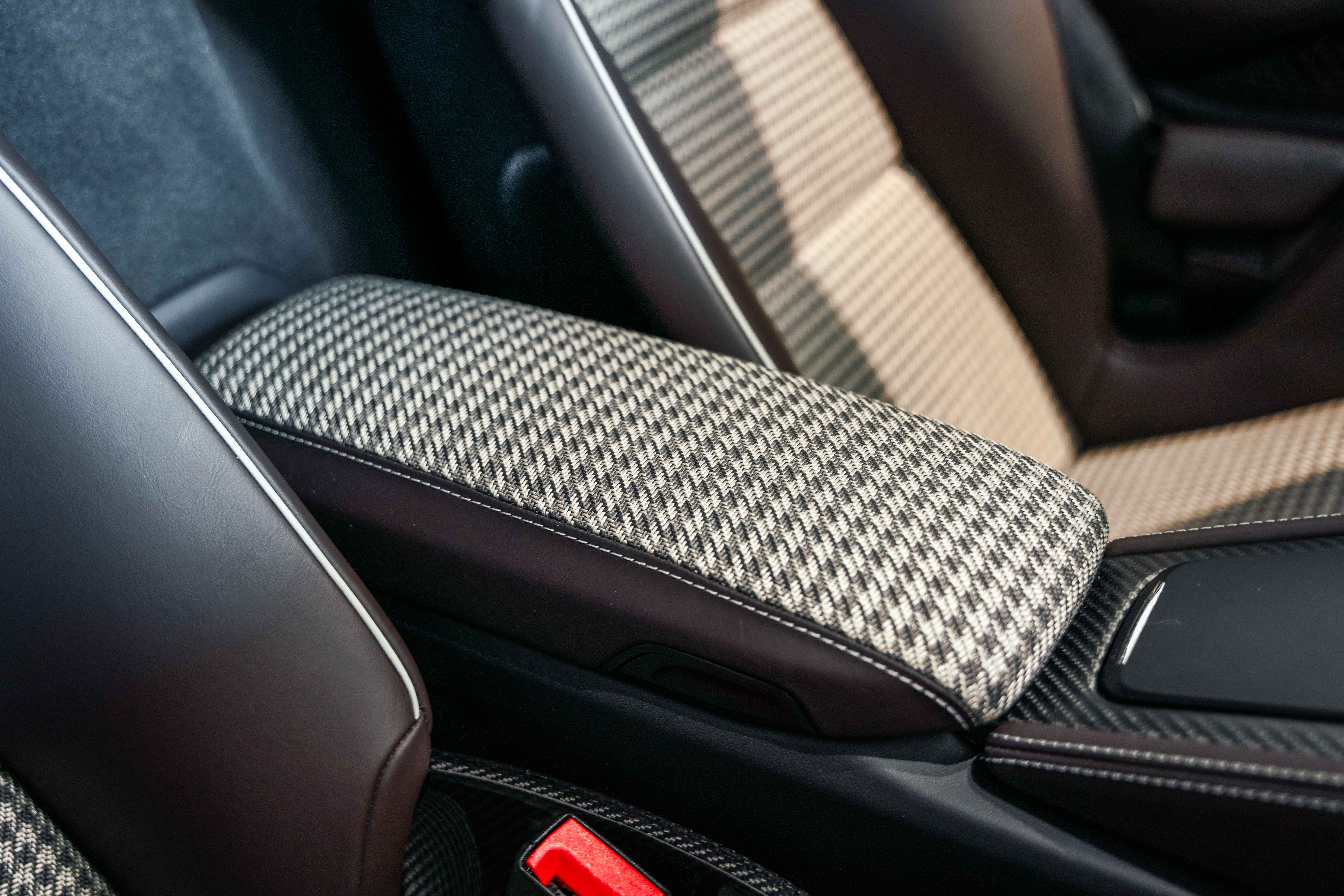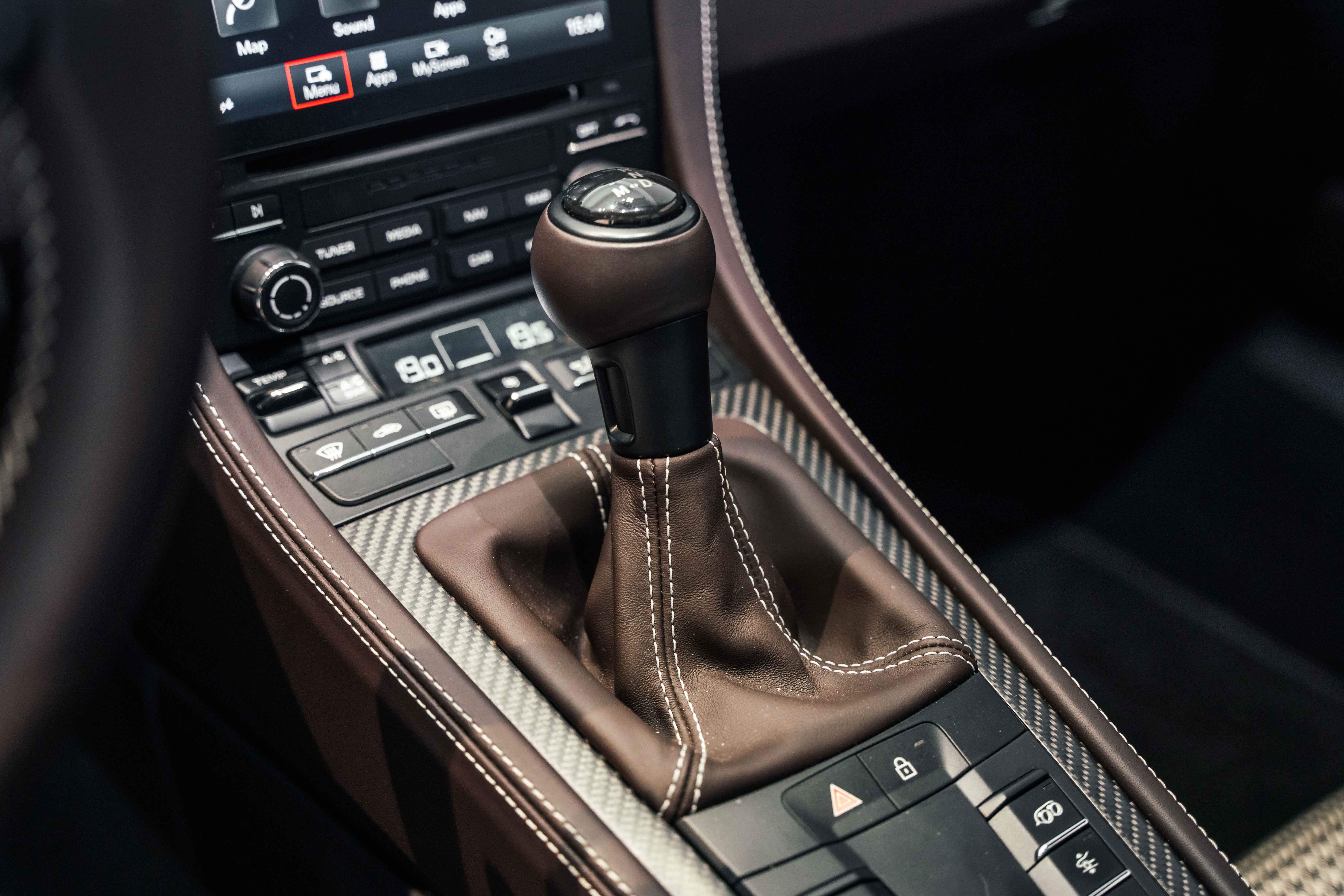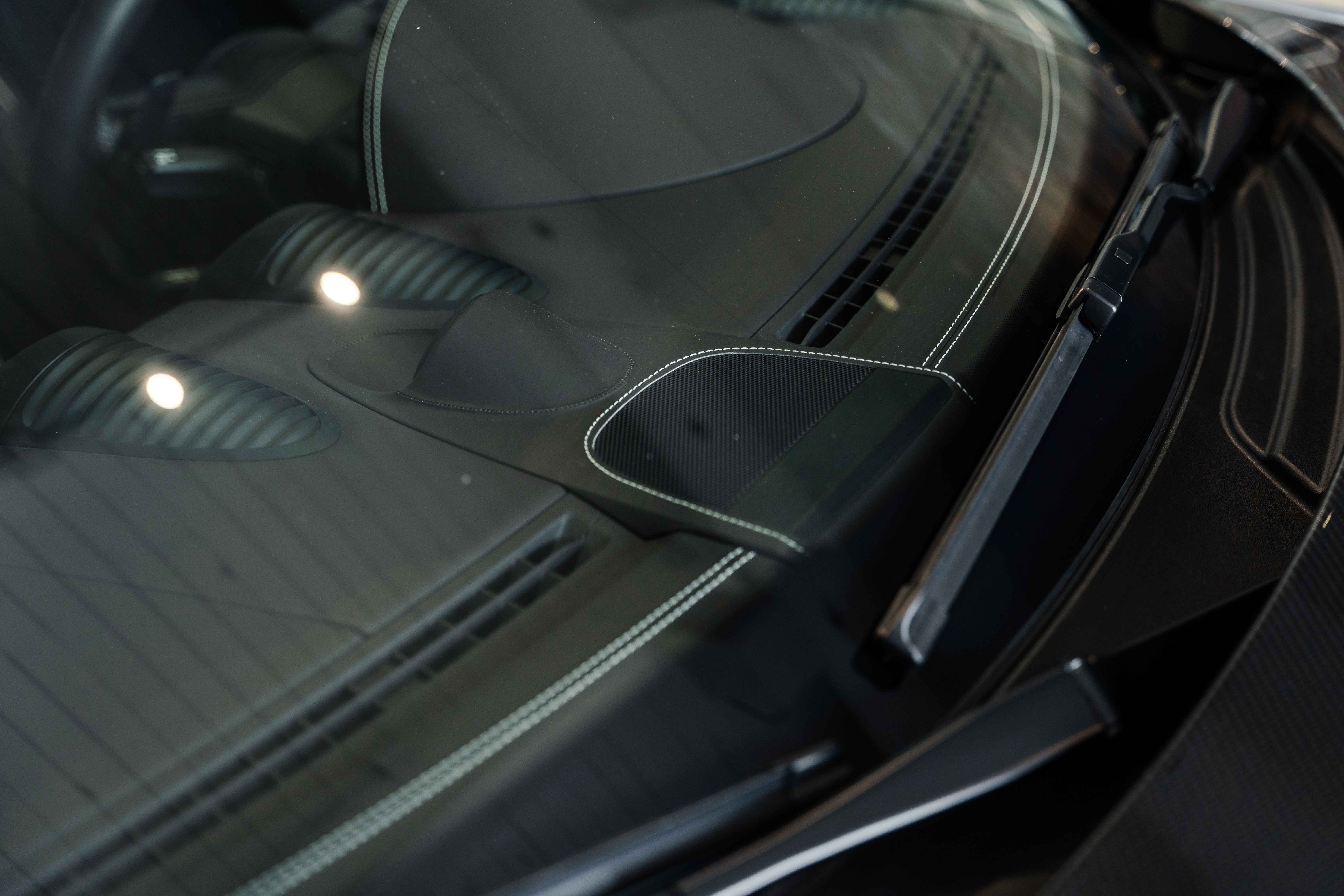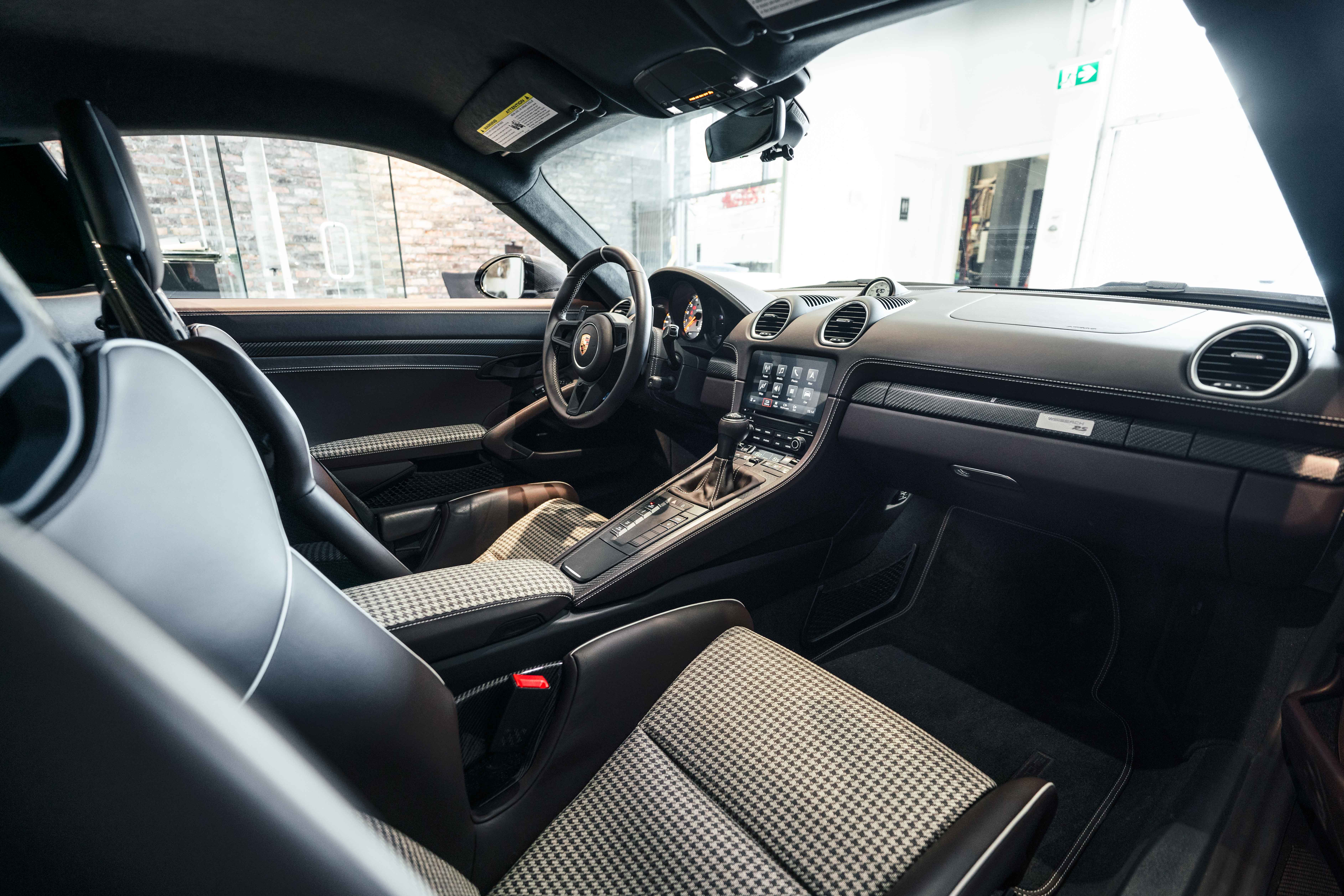 Inside, the Sonderwunsch specification transforms the cockpit into a work of tailored artistry. The cabin is upholstered extensively in Espresso leather with Pebble Grey stitching, seamlessly accented by Agate Grey / Geysir Grey Pepita fabric inserts on the seats, armrests, and storage bin lid. Every surface — from the upper and lower dashboard to the centre console sides and door panels — has been hand-finished in Espresso leather, creating a warm yet sophisticated atmosphere. The Porsche Crest embossed on the headrests, matte carbon fiber trim, and Pebble Grey leather 12 o’clock marker on the steering wheel add subtle but purposeful character. Even the floor mats are personalized, bordered in leather to complete the bespoke theme.