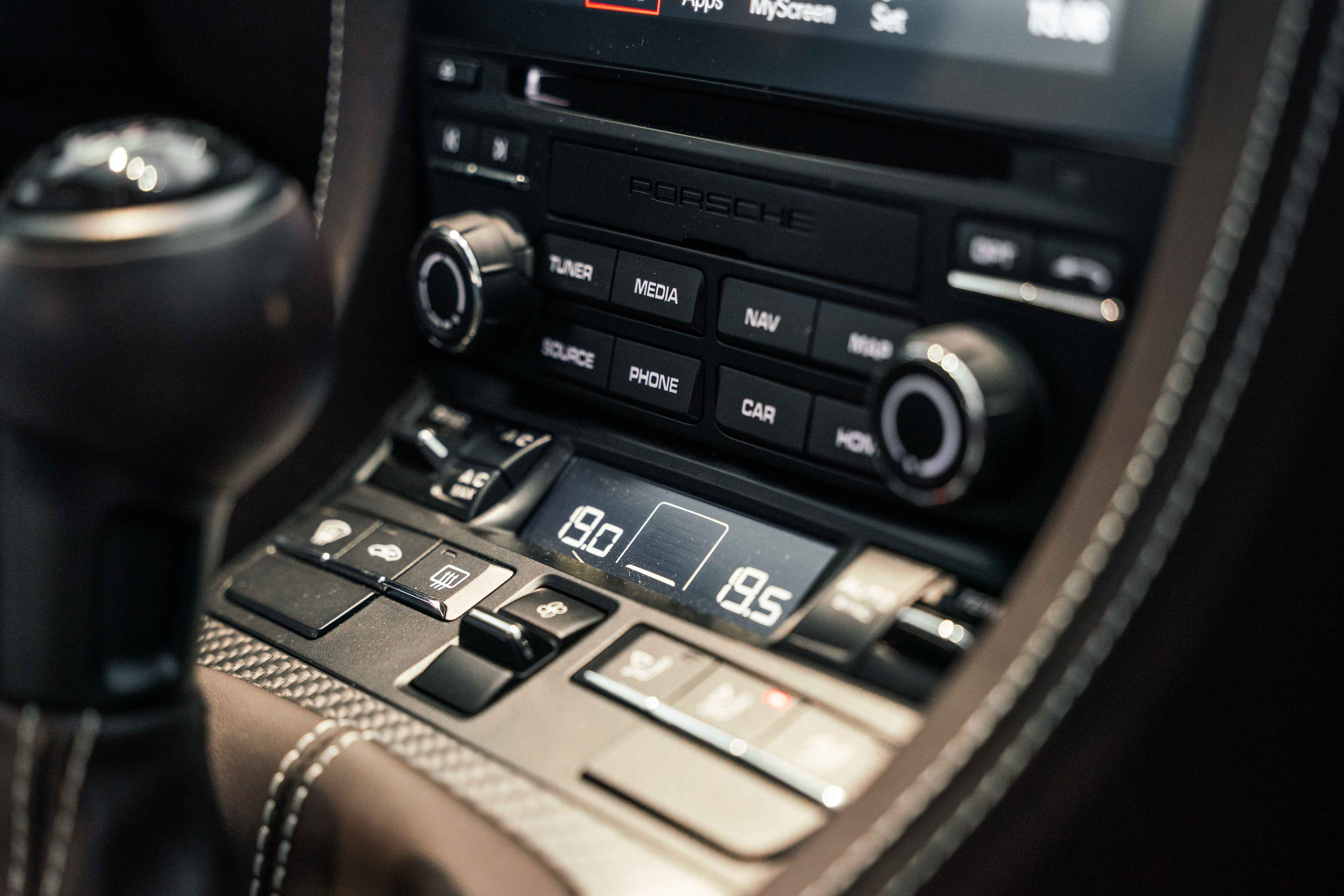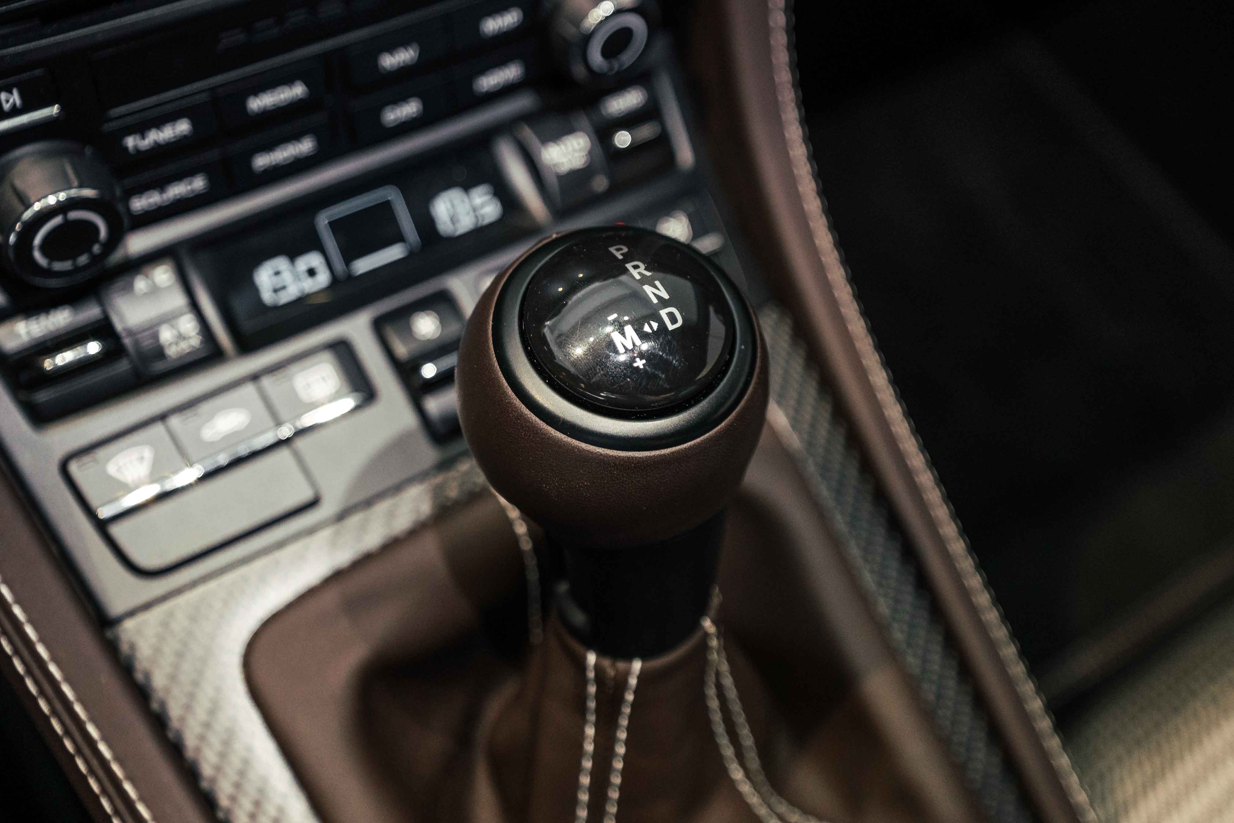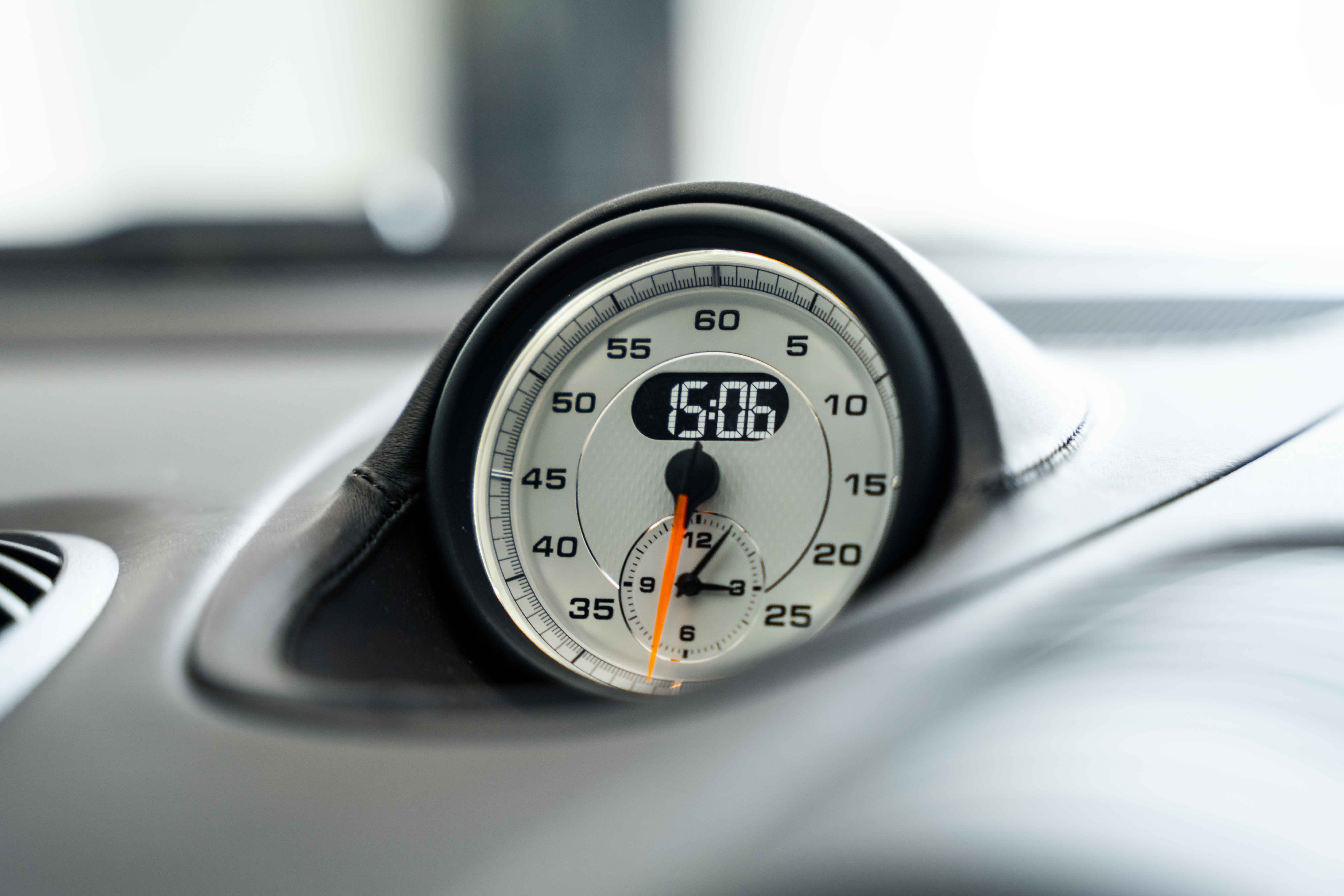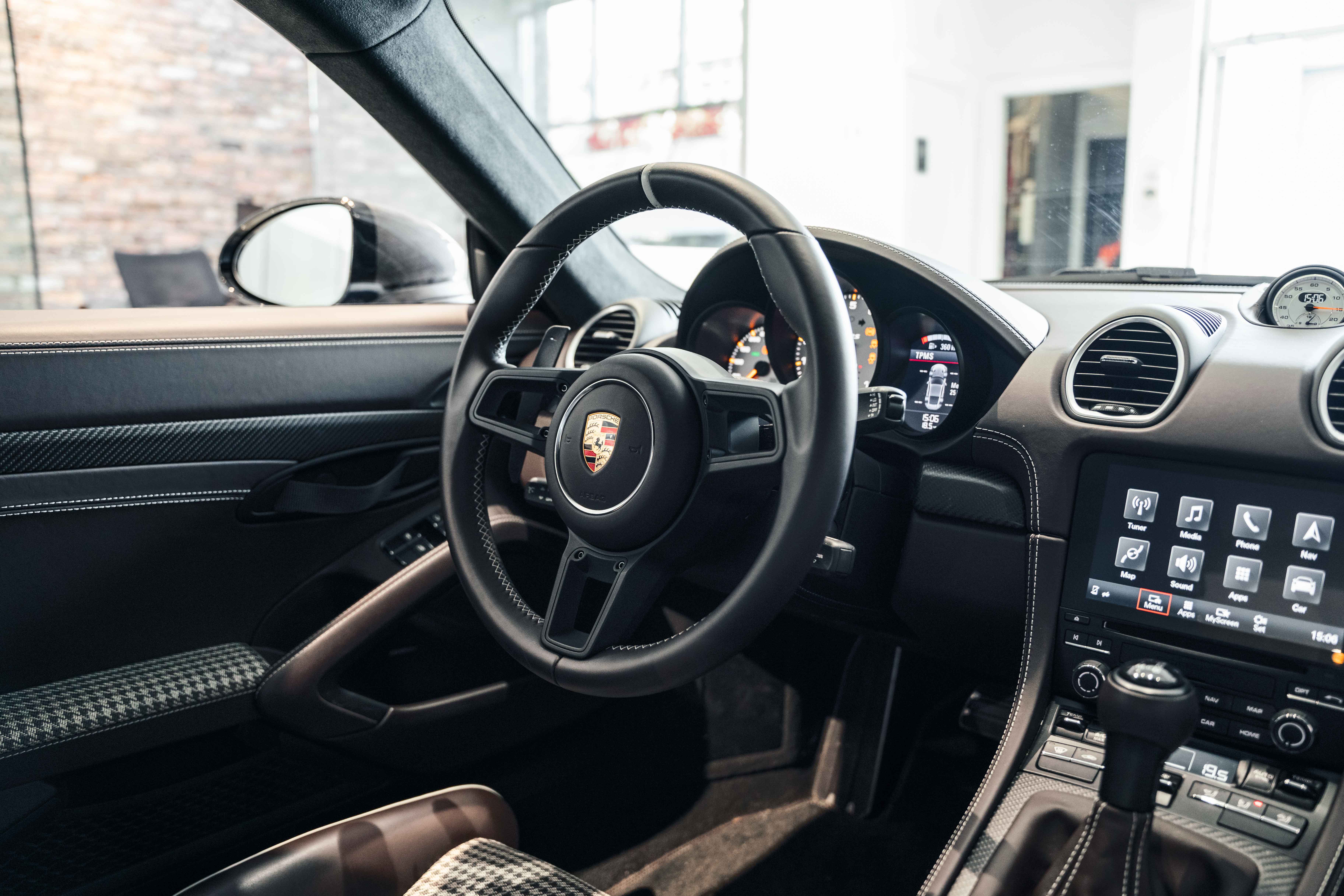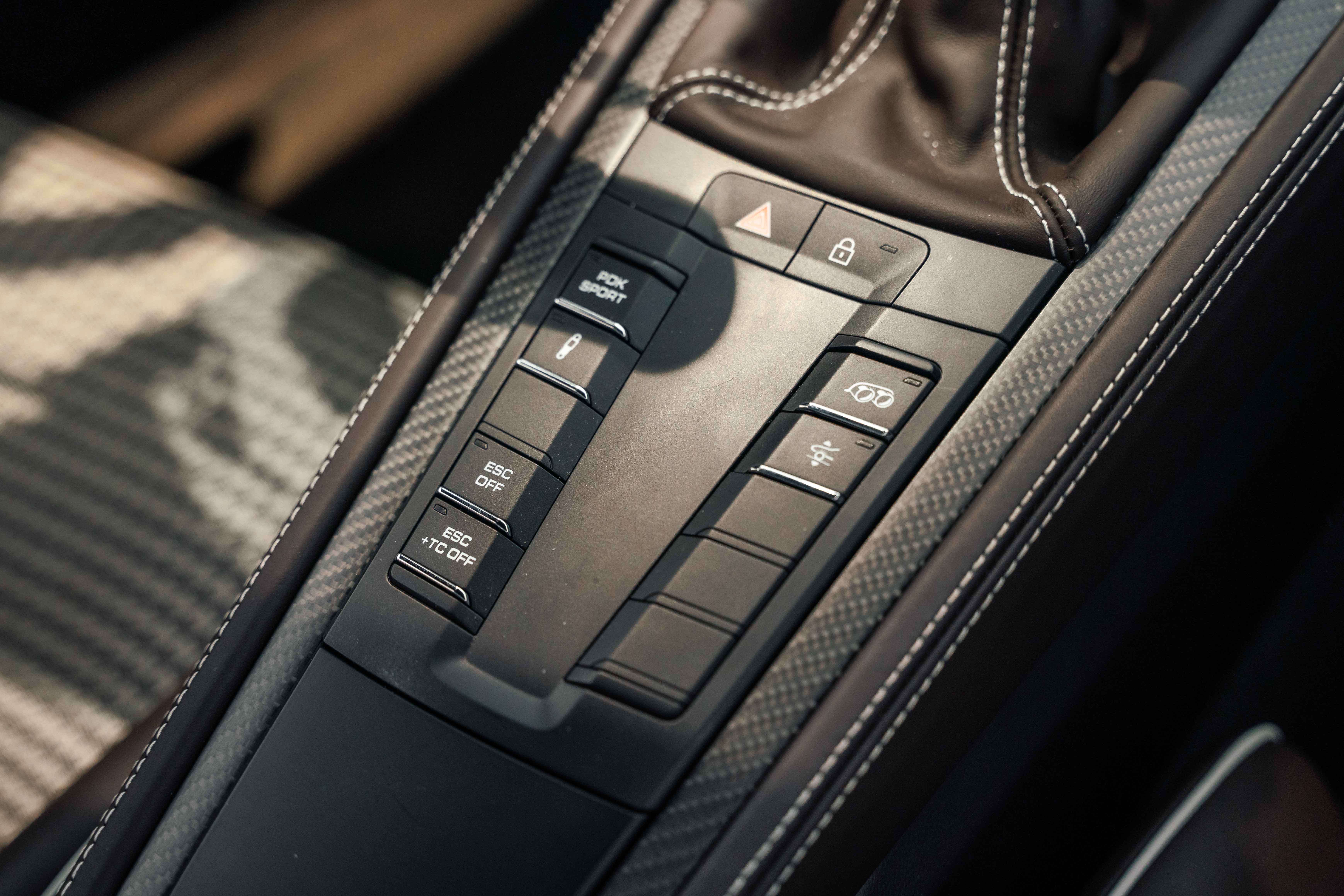 Inside, the Sonderwunsch specification transforms the cockpit into a work of tailored artistry. The cabin is upholstered extensively in Espresso leather with Pebble Grey stitching, seamlessly accented by Agate Grey / Geysir Grey Pepita fabric inserts on the seats, armrests, and storage bin lid. Every surface — from the upper and lower dashboard to the centre console sides and door panels — has been hand-finished in Espresso leather, creating a warm yet sophisticated atmosphere. The Porsche Crest embossed on the headrests, matte carbon fiber trim, and Pebble Grey leather 12 o’clock marker on the steering wheel add subtle but purposeful character. Even the floor mats are personalized, bordered in leather to complete the bespoke theme.